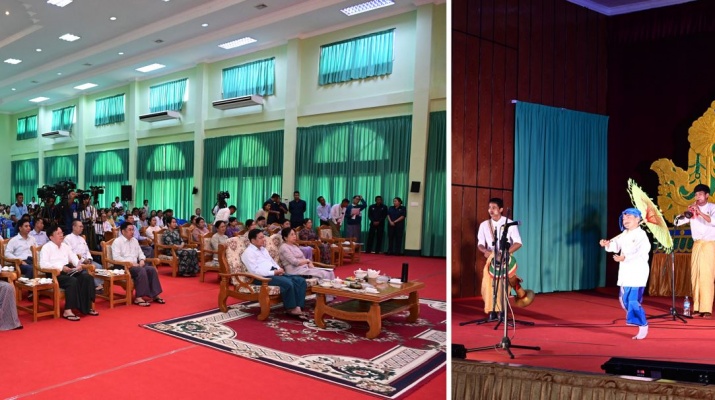 ပြည်ထောင်စုသမ္မတမြန်မာနိုင်ငံတော် ယာယီသမ္မတ နိုင်ငံတော်လုံခြုံရေးနှင့်အေးချမ်းသာယာရေးကော်မရှင်ဥက္ကဋ္ဌ ဗိုလ်ချုပ်မှူးကြီး မင်းအောင်လှိုင်နှင့်ဇနီး ဒေါ်ကြူကြူလှတို့သည် ယနေ့မွန်းလွဲပိုင်းတွင် နေပြည်တော်ရှိ ဆင်ဖြူရှင်ခန်းမနှင့် အမျိုးသားပြတိုက်တို့၌ ကျင်းပလျက်ရှိသည့် (၂၆)ကြိမ်မြောက် မြန်မာ့ရိုးရာယဉ်ကျေးမှု အဆို၊ အက၊ အရေး၊ အတီးပြိုင်ပွဲ (ဗဟိုအဆင့်)ပြိုင်ပွဲ ယှဉ်ပြိုင်နေမှုများကို တက်ရောက် ကြည့်ရှုအားပေးကြသည်။