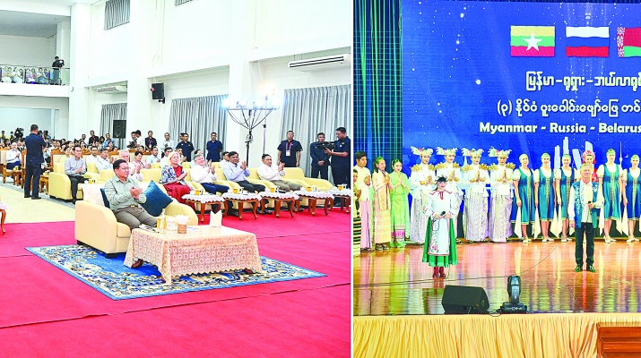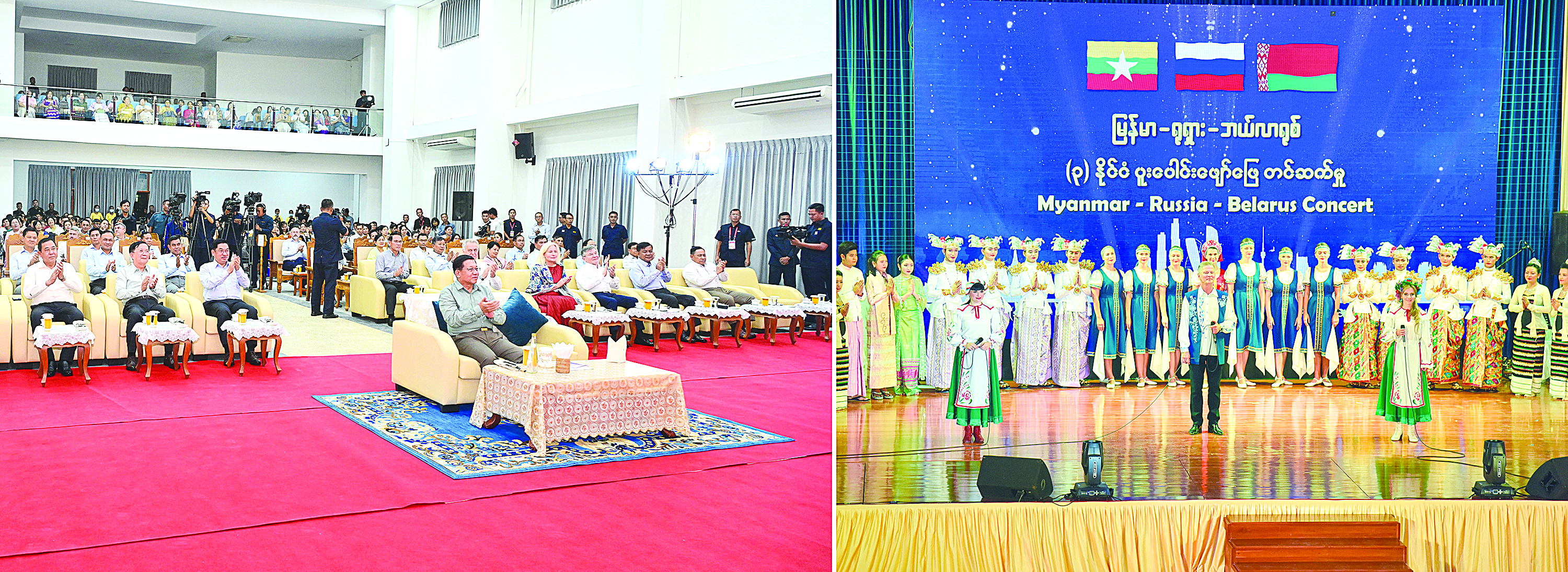 မြန်မာ-ရုရှား-ဘယ်လာရုစ် (၃) နိုင်ငံပူးပေါင်းဖျော်ဖြေတင်ဆက်မှုအခမ်းအနား အား ယနေ့ညနေပိုင်းတွင် နေပြည်တော်ရှိNaypyitaw State Polytechnic University ၌ကျင်းပရာ ပြည်ထောင်စုသမ္မတမြန်မာနိုင်ငံတော်ယာယီသမ္မတနိုင်ငံတော်လုံခြုံရေး နှင့်အေးချမ်းသာယာရေးကော်မရှင်ဥက္ကဋ္ဌ ဗိုလ်ချုပ်မှူးကြီးမင်းအောင်လှိုင် တက်ရောက် ချီးမြှင့်သည်။