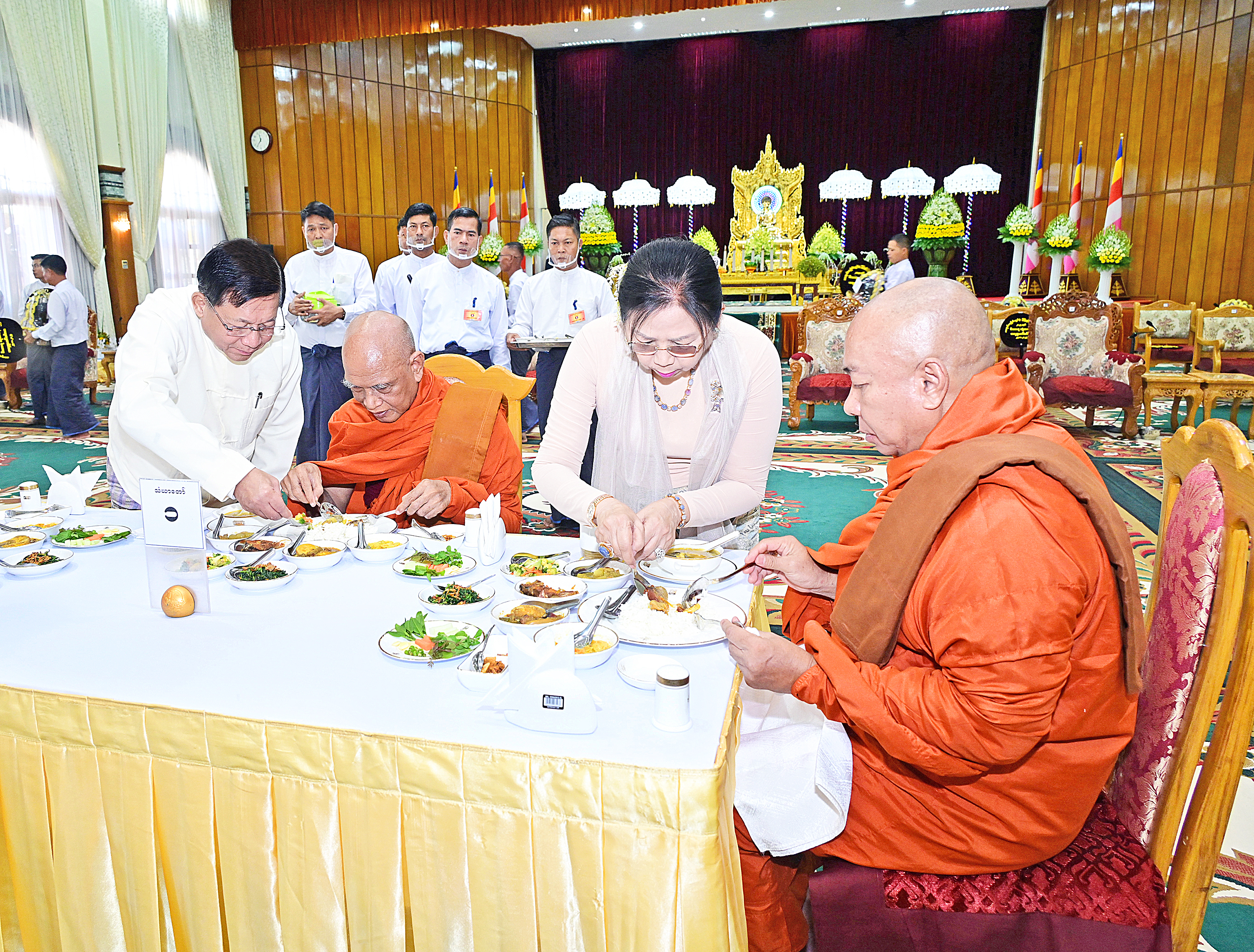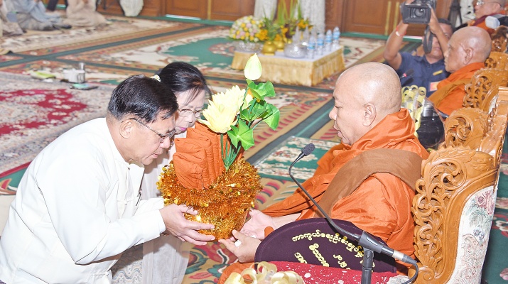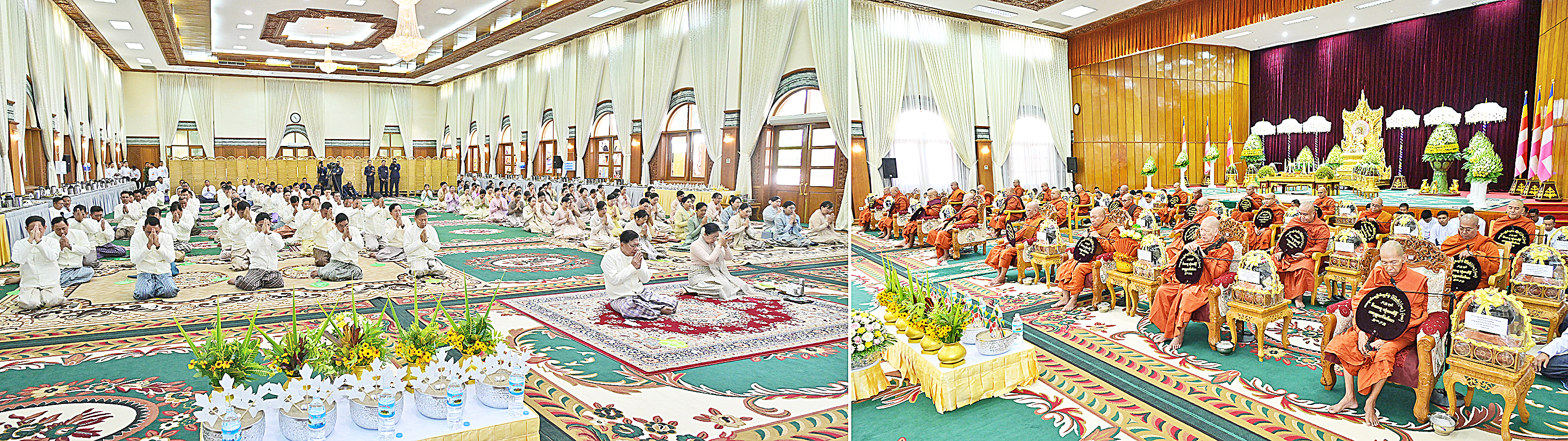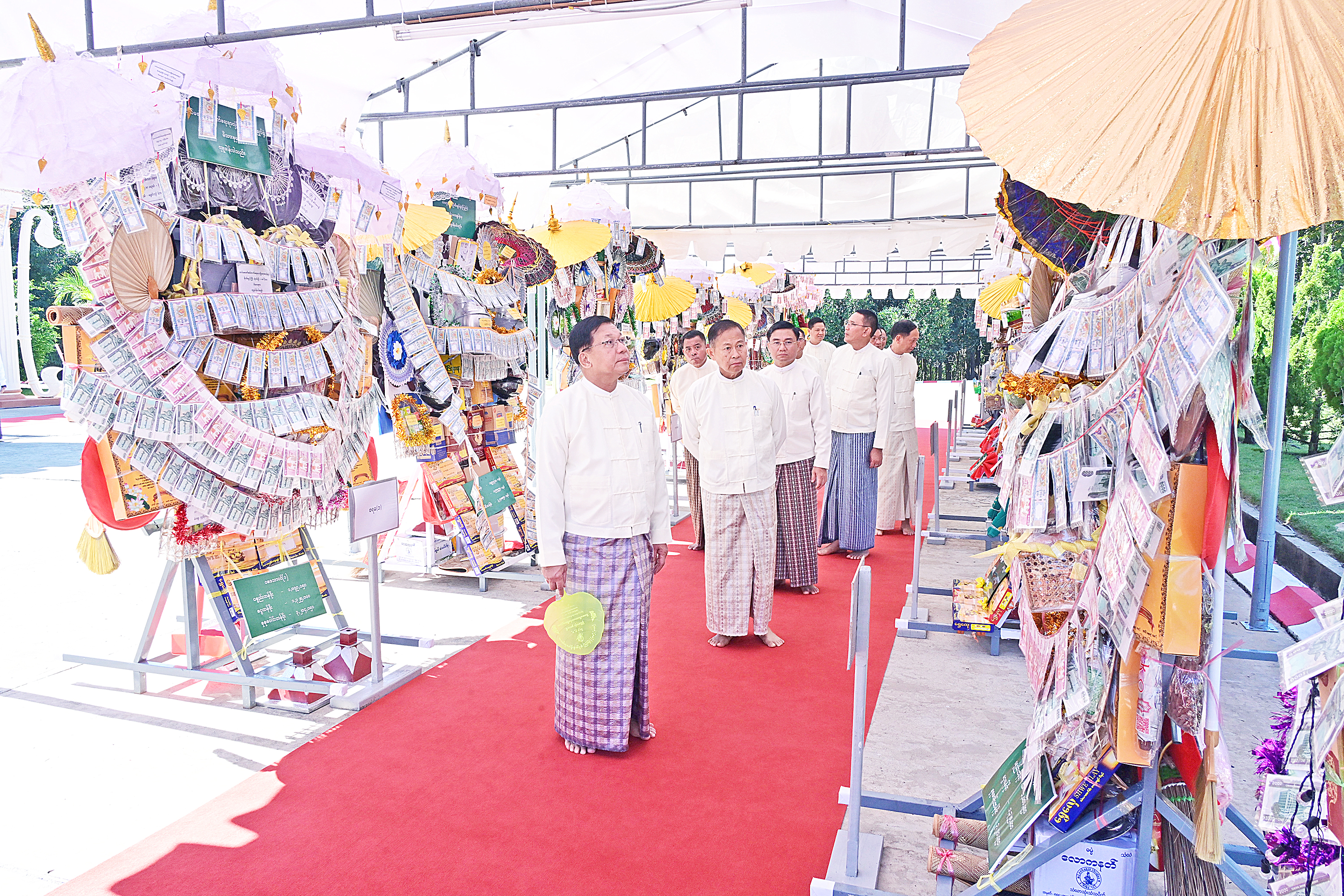 ဦးစွာ နိုင်ငံတော်လုံခြုံရေးနှင့်အေးချမ်းသာယာရေးကော်မရှင်ဥက္ကဋ္ဌ တပ်မတော်ကာကွယ်ရေးဦးစီးချုပ်နှင့်ဇနီး၊ ဧည့်ပရိသတ်များသည် ဘုန်းတော်ကြီးကျောင်းအသီးသီးသို့ လှူဒါန်းရန်ခင်းကျင်းပြင်ဆင်ထားသည့် ကထိန်လျာသင်္ကန်း၊ လှူဖွယ်ပစ္စည်းများနှင့် ပဒေသာပင်များအား လှည့်လည်ကြည့်ရှုကြသည်။ ထို့နောက် နိုင်ငံတော်လုံခြုံရေးနှင့် အေးချမ်းသာယာရေးကော်မရှင်ဥက္ကဋ္ဌ တပ်မတော်ကာကွယ်ရေးဦးစီးချုပ်သည် အနော်ရထာခန်းမအတွင်းရှိ ဗုဒ္ဓရုပ်ပွားတော်မြတ်အား ဖူးမြော်ကြည်ညို၍ မြသပိတ်ဆွမ်းတော်နှင့် ပန်း၊ သောက်တော်ရေချမ်း၊ ဆီမီး၊ သစ်သီးတို့ကို ဆက်ကပ်လှူဒါန်းသည်။