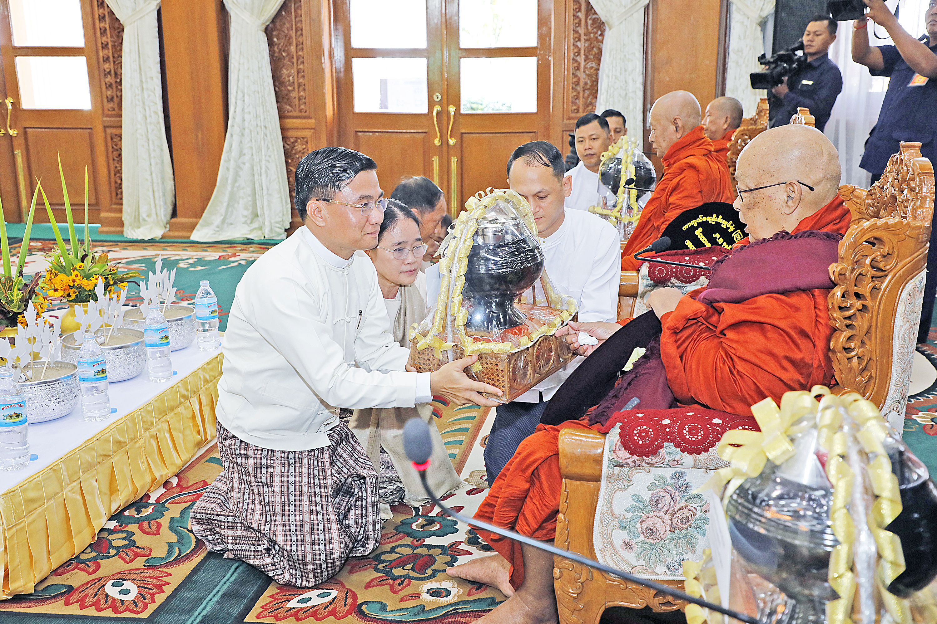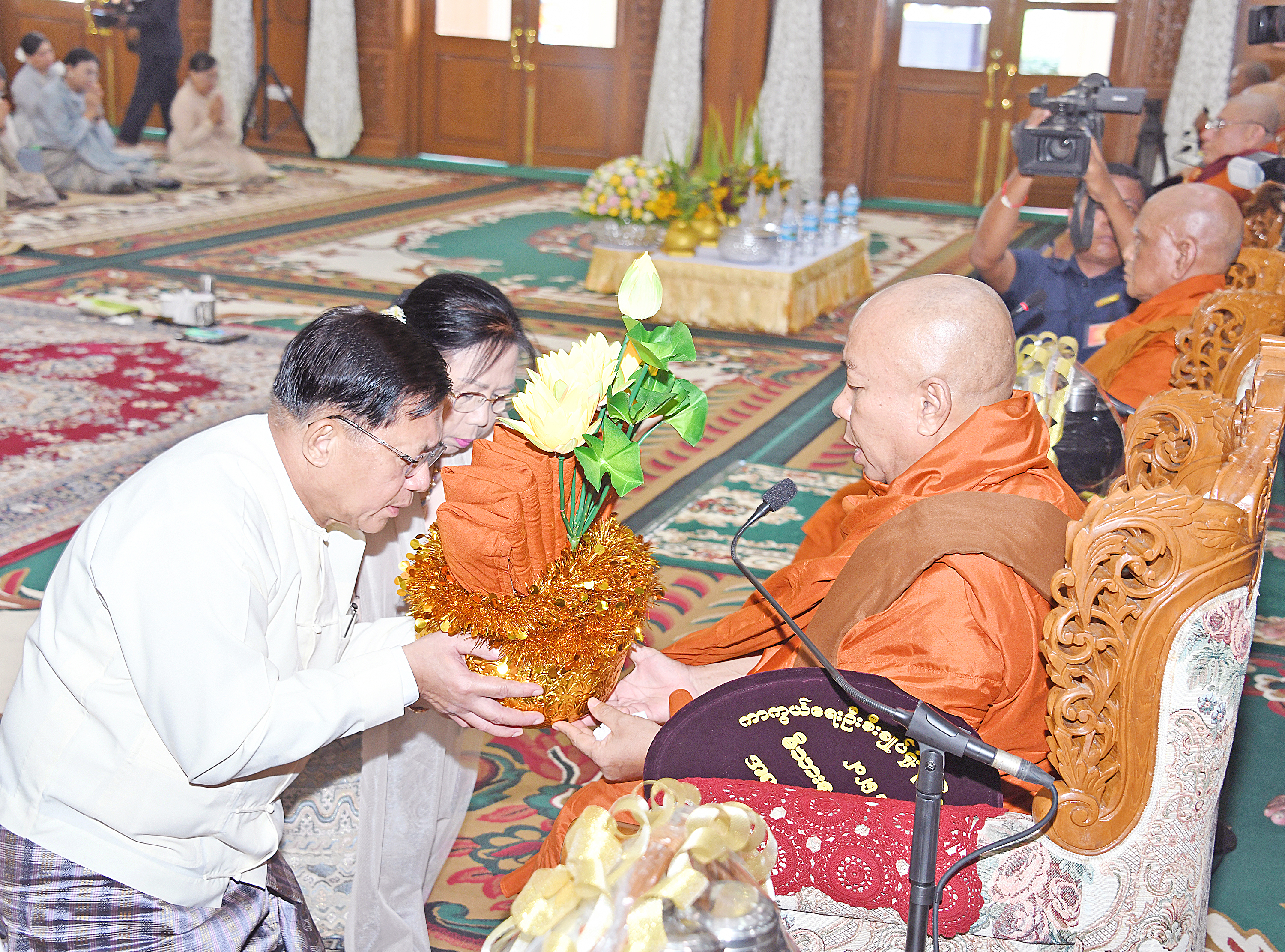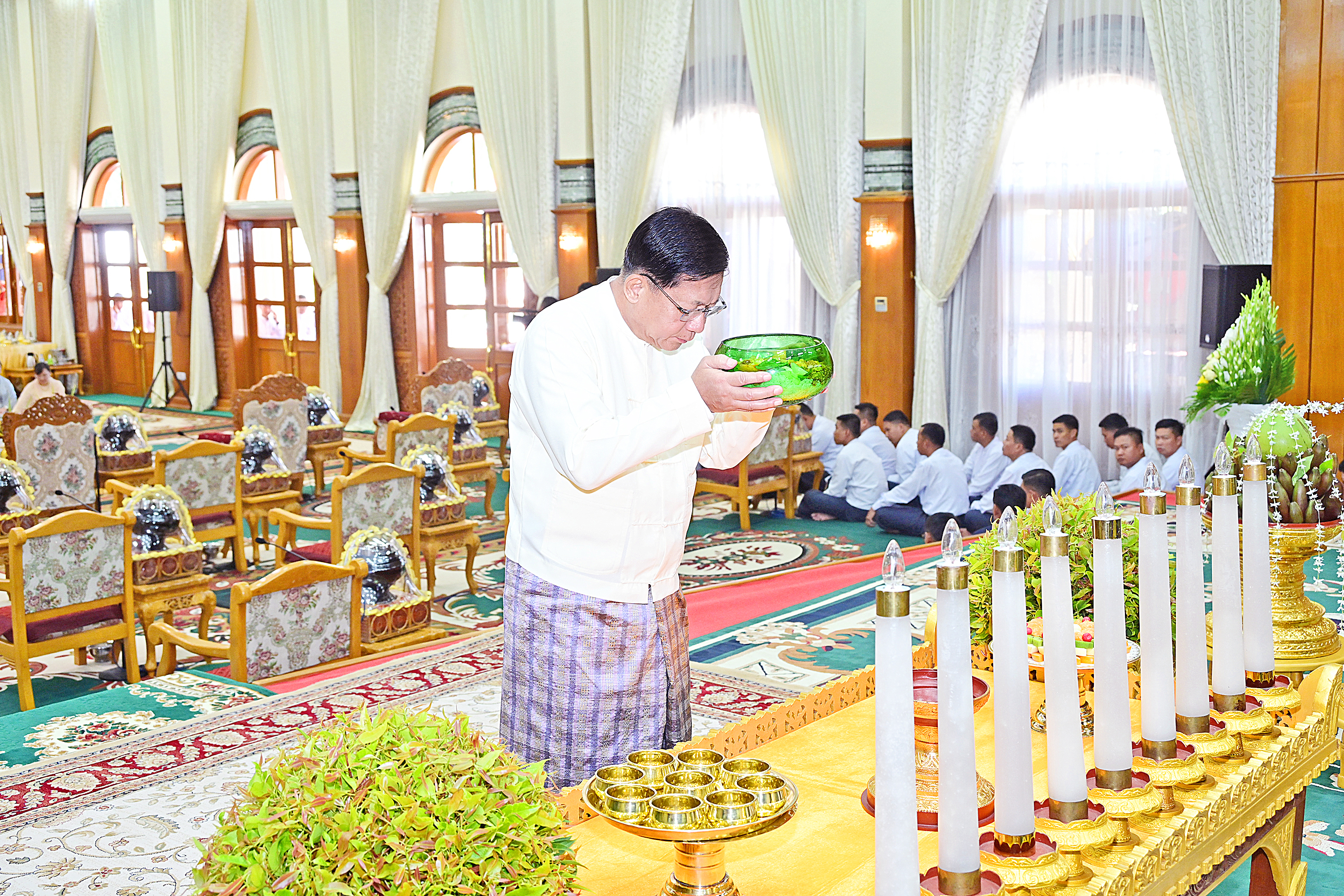 ဦးစွာ နိုင်ငံတော်လုံခြုံရေးနှင့်အေးချမ်းသာယာရေးကော်မရှင်ဥက္ကဋ္ဌ တပ်မတော်ကာကွယ်ရေးဦးစီးချုပ်နှင့်ဇနီး၊ ဧည့်ပရိသတ်များသည် ဘုန်းတော်ကြီးကျောင်းအသီးသီးသို့ လှူဒါန်းရန်ခင်းကျင်းပြင်ဆင်ထားသည့် ကထိန်လျာသင်္ကန်း၊ လှူဖွယ်ပစ္စည်းများနှင့် ပဒေသာပင်များအား လှည့်လည်ကြည့်ရှုကြသည်။ ထို့နောက် နိုင်ငံတော်လုံခြုံရေးနှင့် အေးချမ်းသာယာရေးကော်မရှင်ဥက္ကဋ္ဌ တပ်မတော်ကာကွယ်ရေးဦးစီးချုပ်သည် အနော်ရထာခန်းမအတွင်းရှိ ဗုဒ္ဓရုပ်ပွားတော်မြတ်အား ဖူးမြော်ကြည်ညို၍ မြသပိတ်ဆွမ်းတော်နှင့် ပန်း၊ သောက်တော်ရေချမ်း၊ ဆီမီး၊ သစ်သီးတို့ကို ဆက်ကပ်လှူဒါန်းသည်။
