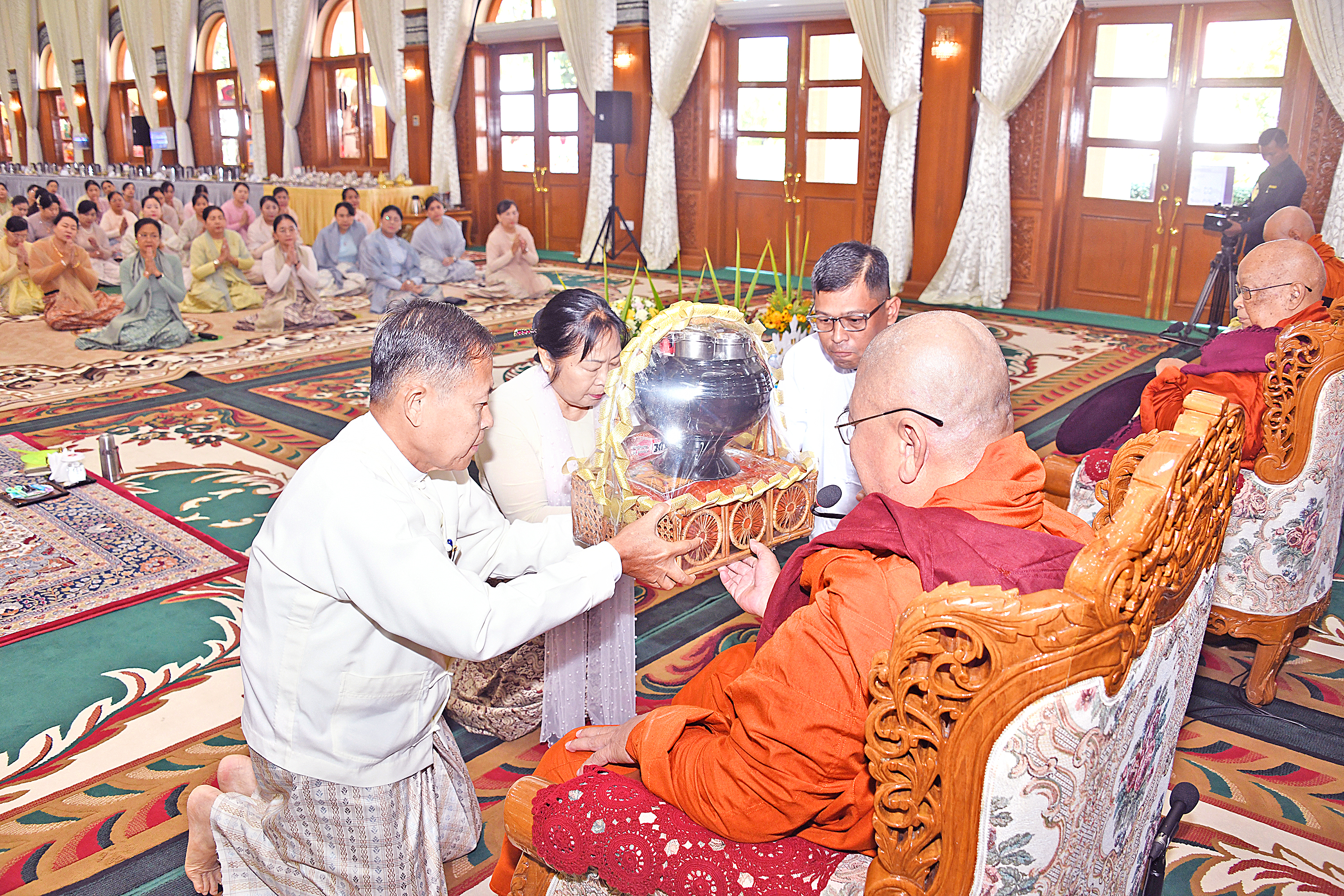 ထို့နောက် အခမ်းအနားကို “ဗုဒ္ဓသာသနံ စိရံ တိဋ္ဌတု” သုံးကြိမ်ရွတ်ဆိုဆုတောင်း၍ ရုပ်သိမ်းကြပြီး အခမ်းအနားအပြီးတွင် နိုင်ငံတော်သံဃမဟာနာယကအဖွဲ့ ဥက္ကဋ္ဌ သန်လျင်မင်းကျောင်းဆရာတော်ကြီးအမှူးပြုသည့် ဆရာတော်၊ သံဃာတော် များအား နိုင်ငံတော်လုံခြုံရေးနှင့် အေးချမ်းသာယာရေးကော်မရှင်ဥက္ကဋ္ဌ တပ်မတော် ကာကွယ်ရေးဦးစီးချုပ်နှင့်ဇနီး၊ ဧည့်ပရိသတ်များက နေ့ဆွမ်းဆက်ကပ်လှူဒါန်းခဲ့ကြသည်။