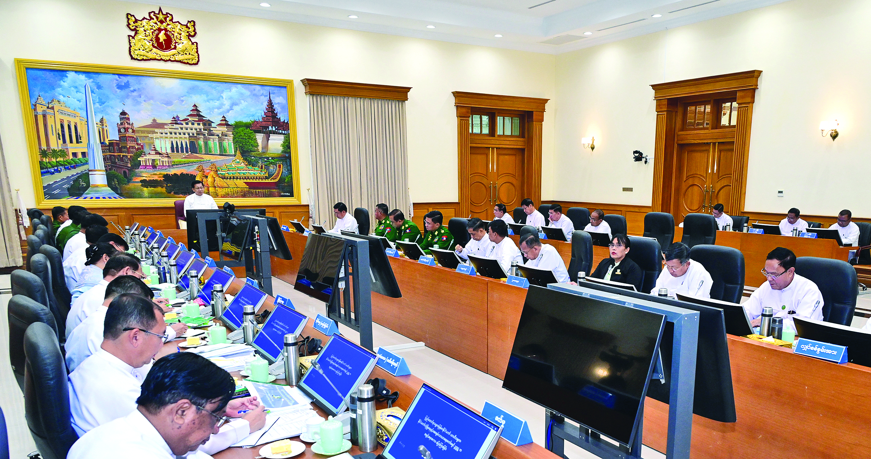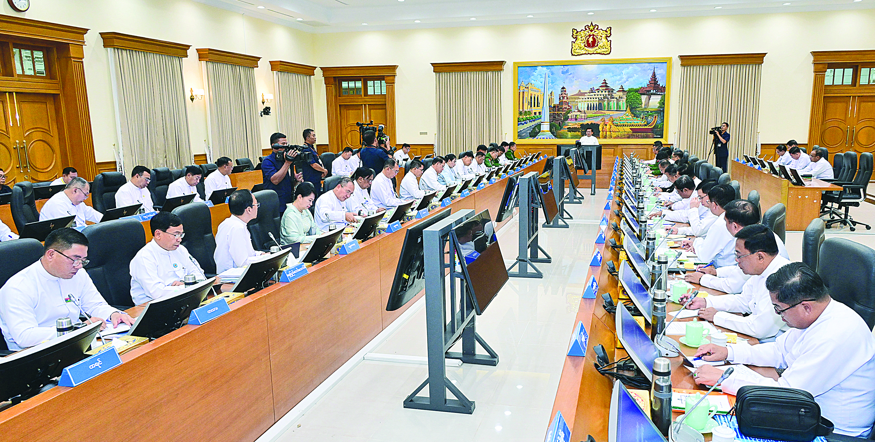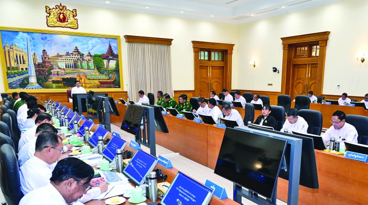 ထို့နောက် ပြည်ထောင်စုဝန်ကြီးများနှင့်တိုင်းဒေသကြီးနှင့်ပြည်နယ်ဝန်ကြီးချုပ်များက ပြည်နယ်နှင့် တိုင်းဒေသကြီးများအလိုက် စပါးစိုက်ပျိုးဧကများနှင့် အထွက်နှုန်းမှန်ကန်မှုရှိစေရေးနှင့် ပန်းတိုင်ရည်မှန်းချက်ပြည့်မီရေး ဆောင်ရွက်လျက်ရှိသည့်အခြေအနေများ၊ နိုင်ငံတော်မှသွင်းအားစုများအပါအဝင် အခြားထောက်ပံ့ပေးလျက်ရှိသည့် အခြေအနေများ၊ ကုန်စည်စီးဆင်းမှု မှန်ကန်မြန်ဆန်ရေးနှင့် ကုန်ဈေးနှုန်း တည်ငြိမ်ရေးဆောင်ရွက်လျက်ရှိသည့်အခြေအနေများ၊ လွတ်လပ်၍ တရားမျှတသည့် ပါတီစုံဒီမိုကရေစီအထွေထွေရွေးကောက်ပွဲ အောင်မြင်စေရေးအတွက် မဲစာရင်းများ မှန်ကန်မှုရှိစေရေးနှင့် မဲရုံများ လျာထားဆောင်ရွက်ထားရှိမှု အခြေအနေများ၊ ခေတ္တပိတ်ထားခဲ့ရသည့် အခြေခံကျောင်းများနှင့် တက္ကသိုလ်များပြန်လည်ဖွင့်လှစ်၍ ပညာသင်ကြားနေမှုအခြေအနေ၊ မူဝါဒများနှင့်အညီ စီမံကိန်းများ ရာခိုင်နှုန်းအလိုက် အကောင်အထည်ဖော် ဆောင်ရွက်ပြီးစီးမှု အခြေအနေ၊ ငလျင်ကြောင့် ထိခိုက်ပျက်စီးခဲ့မှုများကိုဖယ်ရှားရှင်းလင်းပြီး ပြန်လည် ထူထောင်ရေးလုပ်ငန်းများ ဆောင်ရွက်လျက်ရှိသည့် အခြေအနေများနှင့်ပတ်သက်၍ ရှင်းလင်းတင်ပြသည်။
