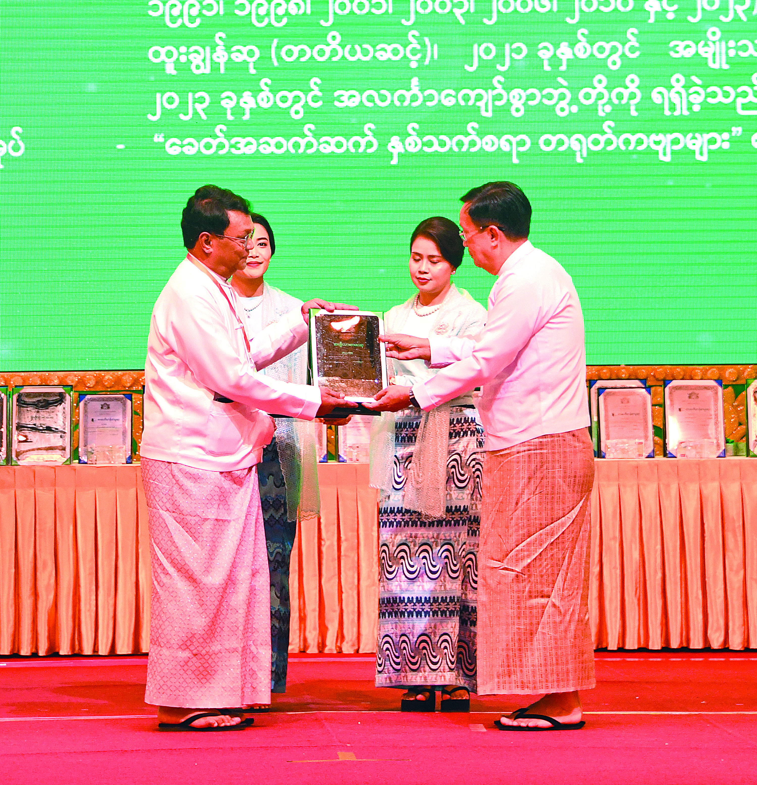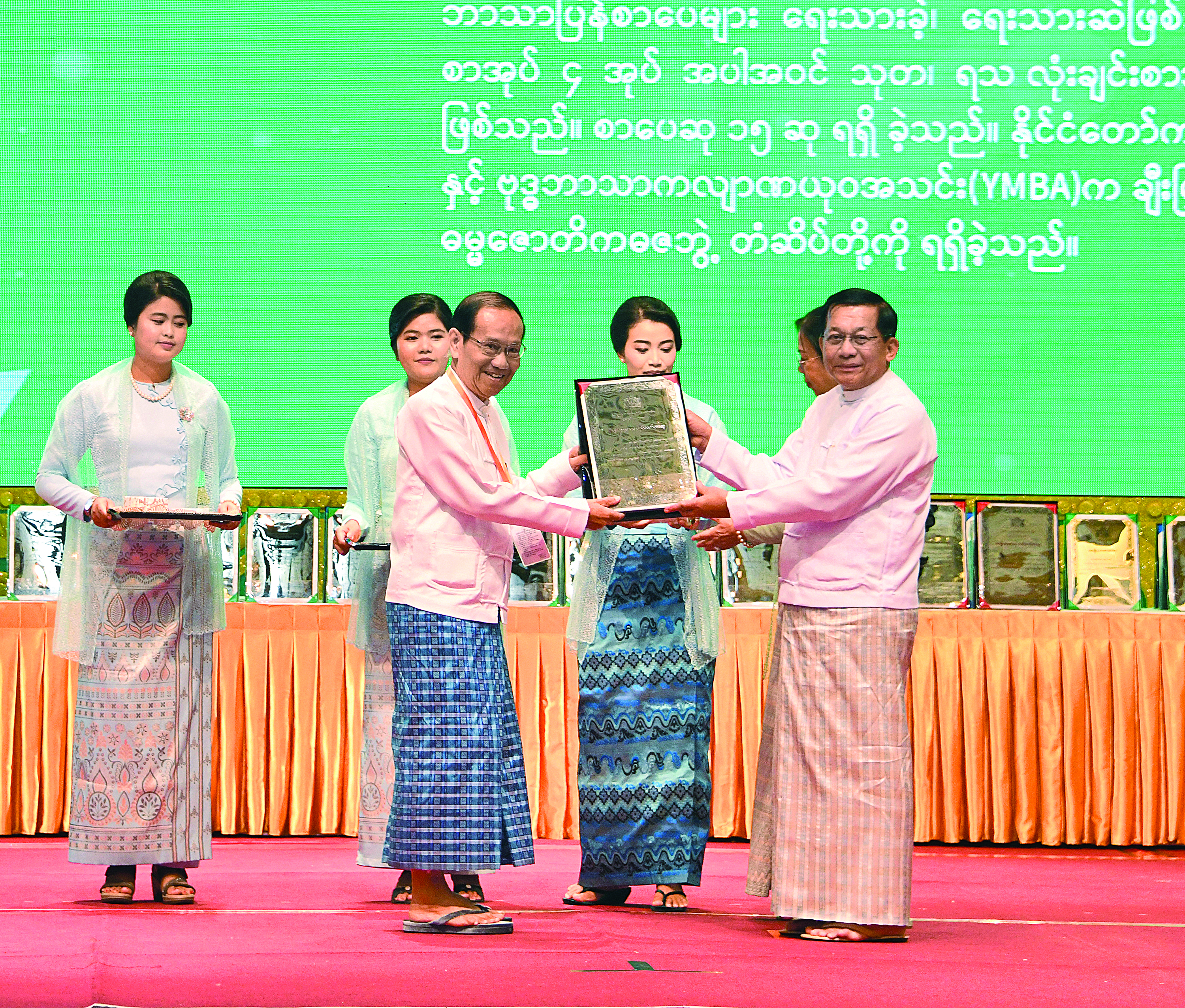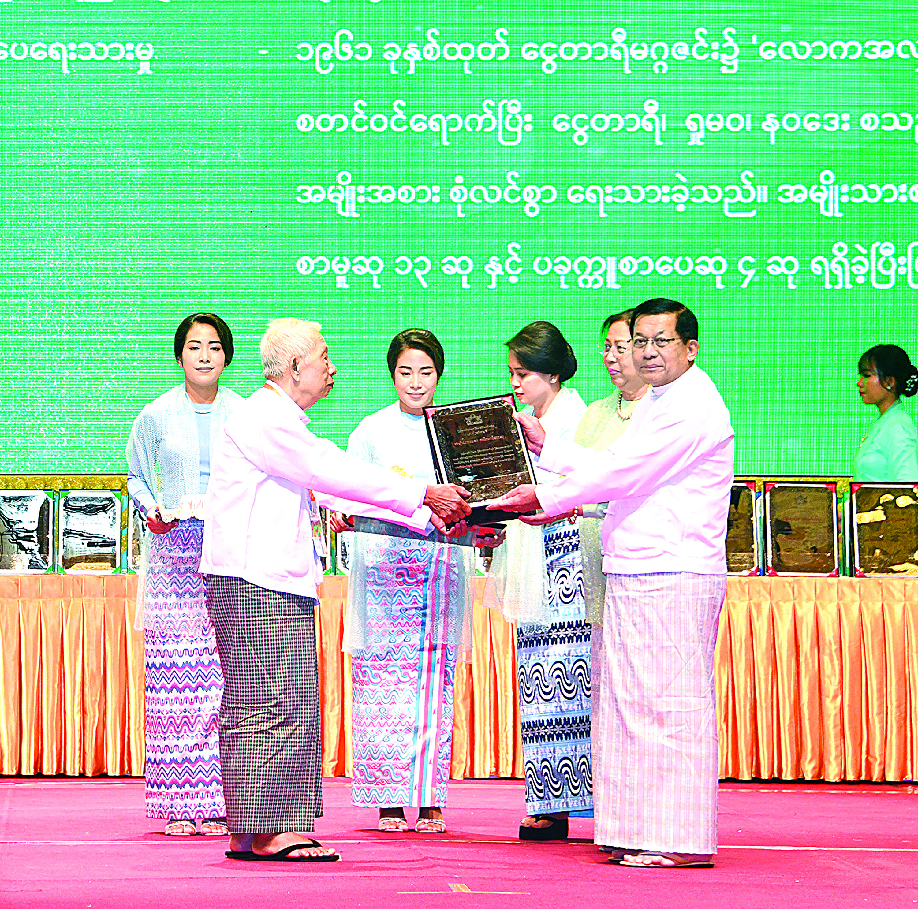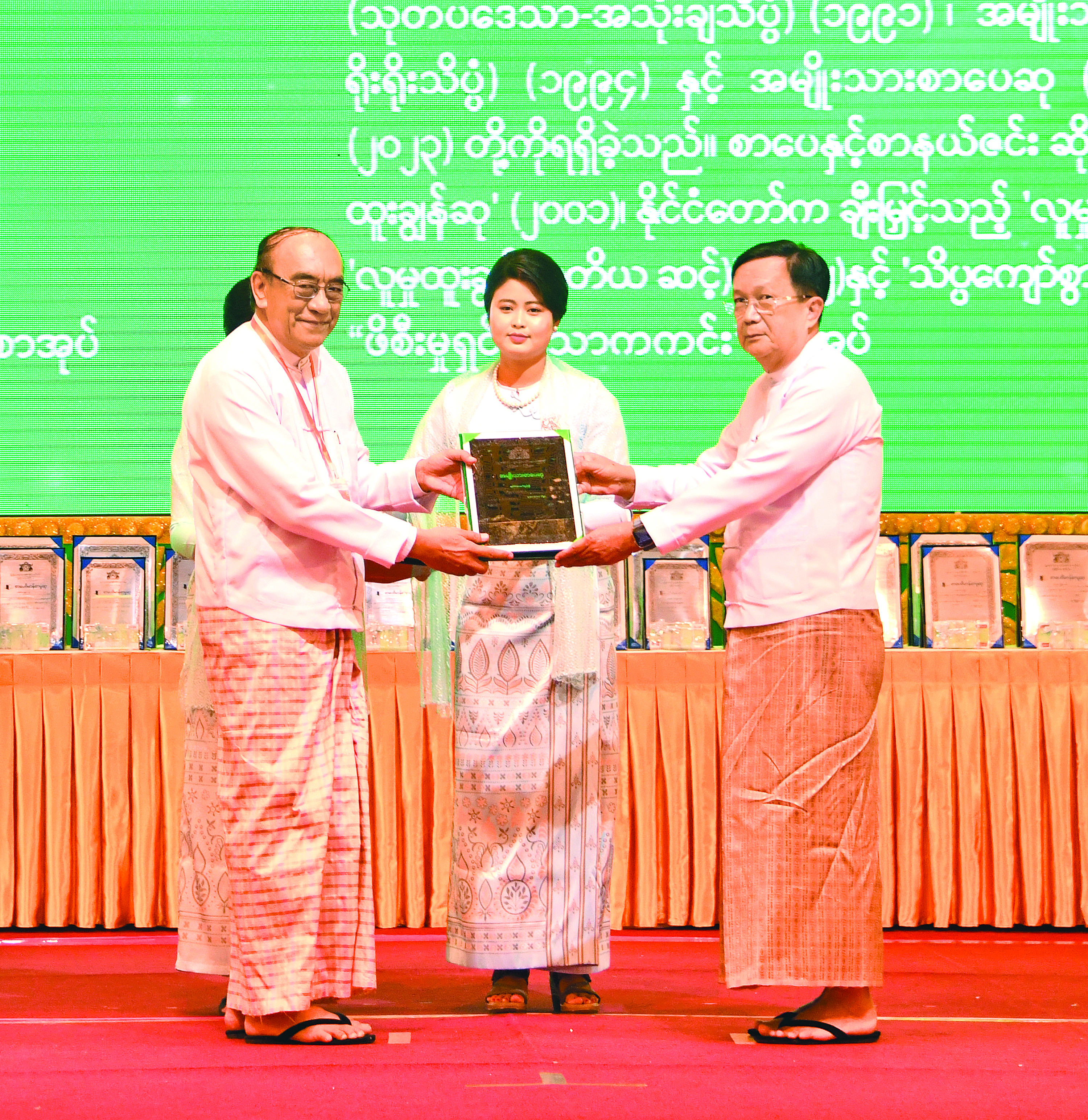 ၎င်းနောက် နိုင်ငံတော်ယာယီသမ္မတ နိုင်ငံတော်လုံခြုံရေးနှင့်အေးချမ်းသာယာ ရေးကော် မရှင်ဥက္ကဋ္ဌနှင့်ဇနီးတို့အား ပြန်ကြားရေးဝန်ကြီးဌာန ပြည်ထောင်စုဝန်ကြီး ဦးမောင် မောင်အုန်းက ၂၀၂၄ ခုနှစ်အတွက် အမျိုးသားစာပေတစ်သက်တာဆု၊ အမျိုး သားစာပေ ဆုနှင့် စာပေဗိမာန်စာမူဆု ဆုနှင်းသဘင်အခမ်းအနားအထိမ်းအမှတ် ဂုဏ်ပြုလက် ဆောင်အား ဂါရဝပြုပေးအပ်သည်။