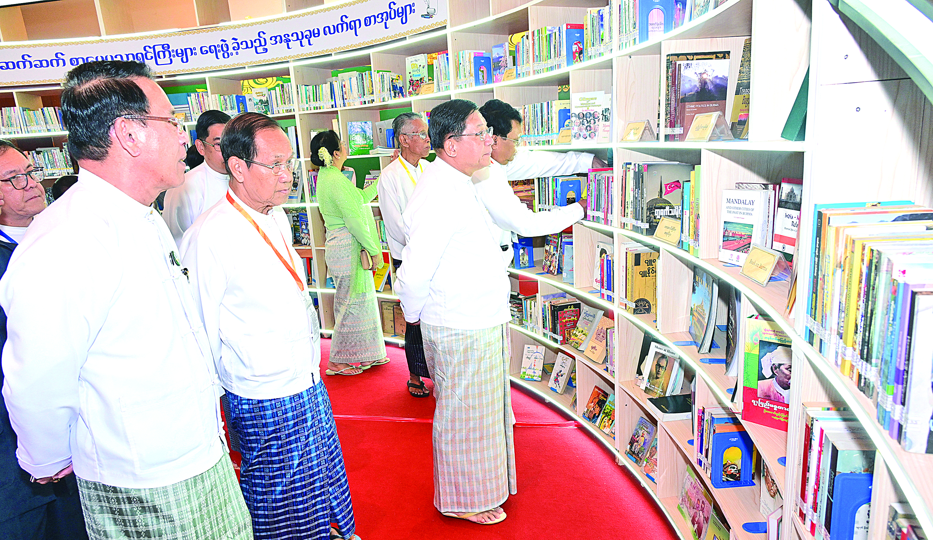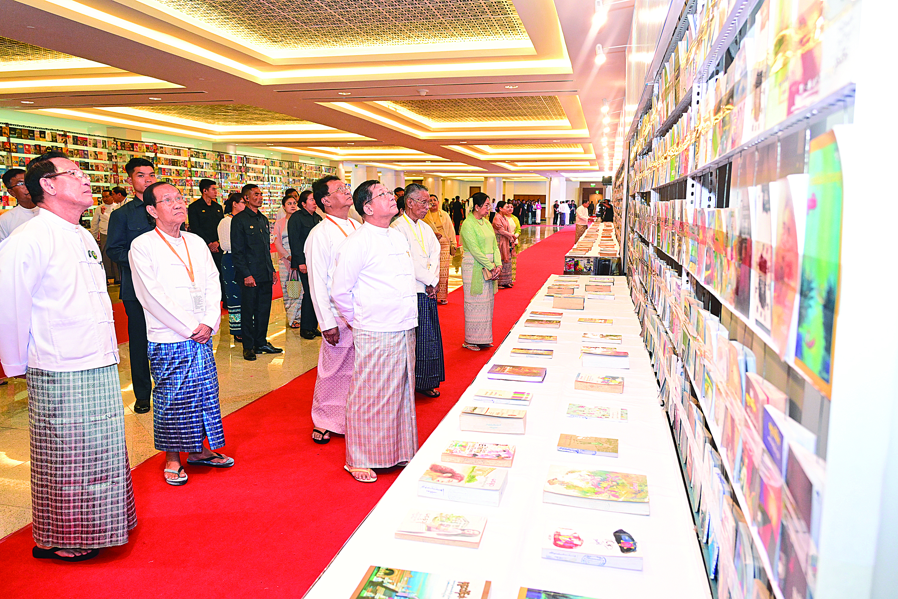 ဦးစွာ နိုင်ငံတော်ယာယီသမ္မတ နိုင်ငံတော်လုံခြုံရေးနှင့်အေးချမ်းသာယာရေး ကော်မရှင် ဥက္ကဋ္ဌနှင့်ဇနီး အခမ်းအနား တက်ရောက်လာကြသူများသည် ၂၀၂၄ ခုနှစ် အတွက် အမျိုးသားစာပေတစ်သက်တာဆု၊ အမျိုးသားစာပေဆုနှင့် စာပေဗိမာန်စာမူဆု ရရှိကြသူ များ၏ အတ္ထုပ္ပတ္တိ၊ ဓာတ်ပုံ၊ ဆုရစာအုပ်များ၊ စာအုပ်စာစောင်နှင့် စာပေ ဆိုင်ရာပြ ခန်းများကို လှည့်လည်ကြည့်ရှုကြသည်။