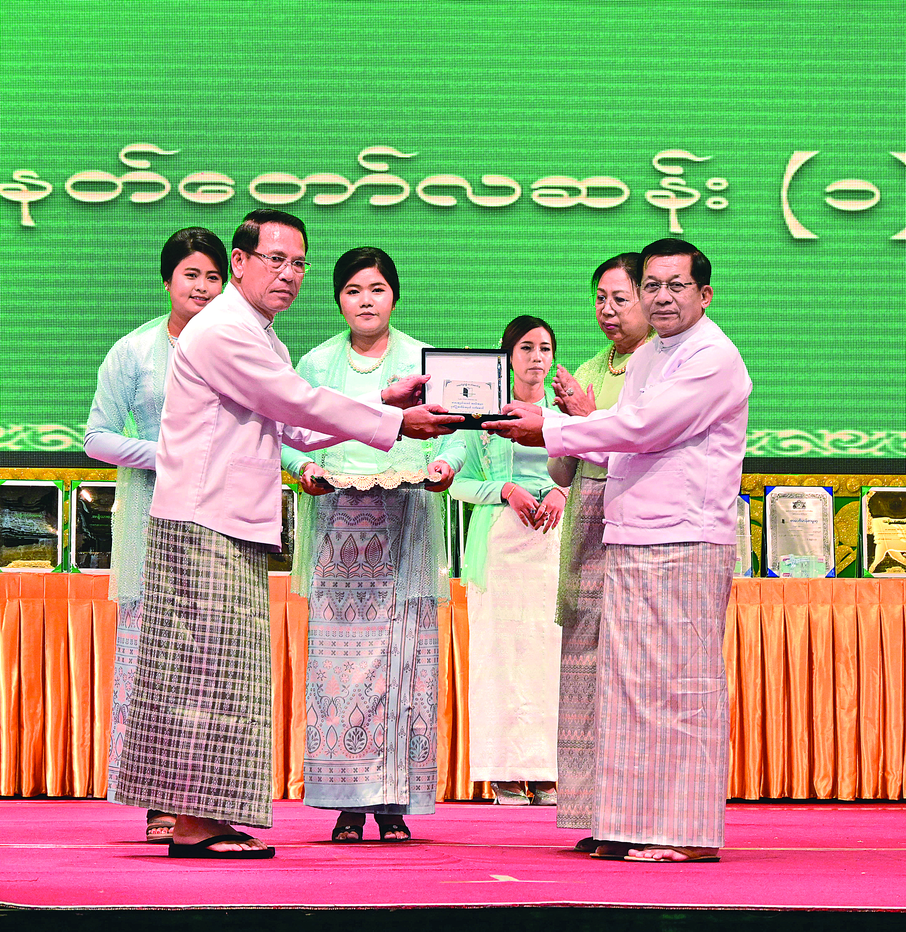 ပြည်ထောင်စုသမ္မတမြန်မာနိုင်ငံတော်ယာယီသမ္မတနိုင်ငံတော်လုံခြုံရေးနှင့်အေးချမ်းသာယာရေးကော်မရှင်ဥက္ကဋ္ဌ ဗိုလ်ချုပ်မှူးကြီးမင်းအောင်လှိုင်နှင့်ဇနီး ဒေါ်ကြူကြူလှ တက်ရောက်ချီးမြှင့်ပေးအပ်