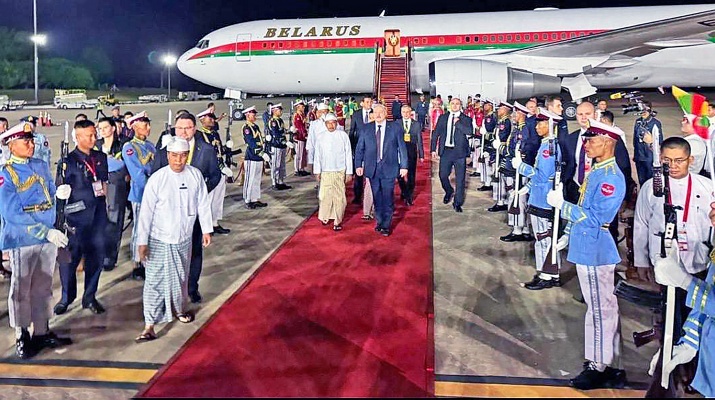 ပြည်ထောင်စုသမ္မတမြန်မာနိုင်ငံတော် ယာယီသမ္မတနိုင်ငံတော်လုံခြုံရေးနှင့်အေးချမ်းသာယာရေးကော်မရှင်ဥက္ကဋ္ဌ ဗိုလ်ချုပ်မှူးကြီးမင်းအောင်လှိုင်၏ ဖိတ်ကြားချက်အရ မြန်မာနိုင်ငံသို့ တရားဝင်ချစ်ကြည်ရေးခရီးလာရောက်သည့် ဘယ်လာရုစ်သမ္မတနိုင်ငံသမ္မတ H.E. Mr. Alexander Gregoryevich Lukashenkoဦးဆောင်သောအဆင့်မြင့်ကိုယ်စားလှယ်အဖွဲ့လိုက်ပါလာသောအထူးလေယာဉ်သည်ယနေ့ညပိုင်းတွင် မြန်မာနိုင်ငံလေပိုင်နက်အတွင်းသို့စတင်ဖြတ်သန်းဝင်ရောက်လာရာမြန်မာ့တပ်မတော်(လေ)မှ စတုတ္ထမျိုးဆက်လွန် Su-30 SME ဘက်စုံသုံးအကြီးစားဂျက် တိုက်လေယာဉ် ၃ စီးက လိုက်ပါခြံရံပျံသန်းကြိုဆိုခဲ့ပြီး နေပြည်တော် တပ်မတော်လေဆိပ်သို့ ရောက်ရှိဆင်းသက်သည်။