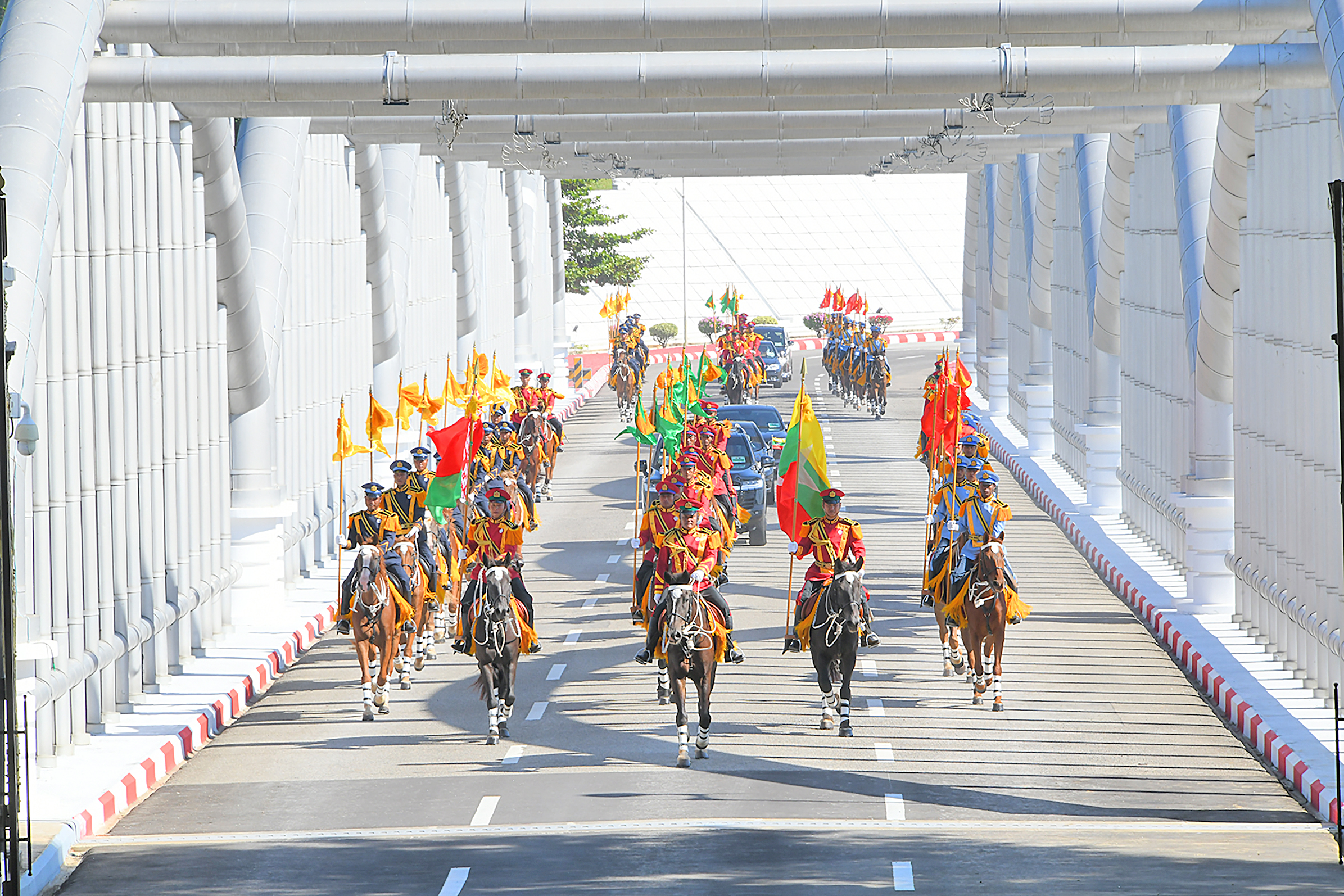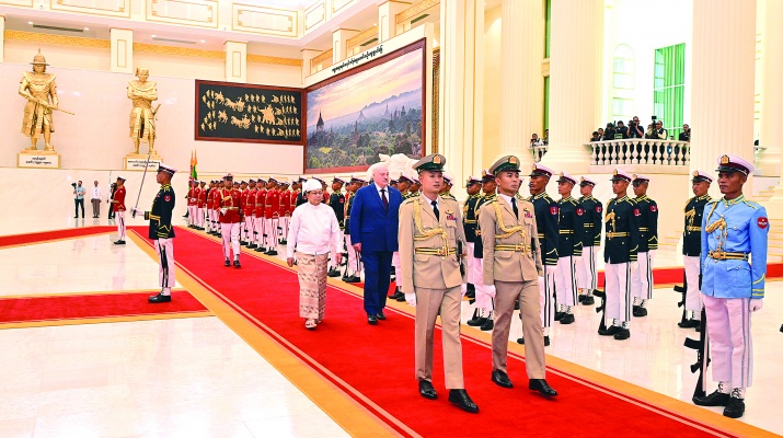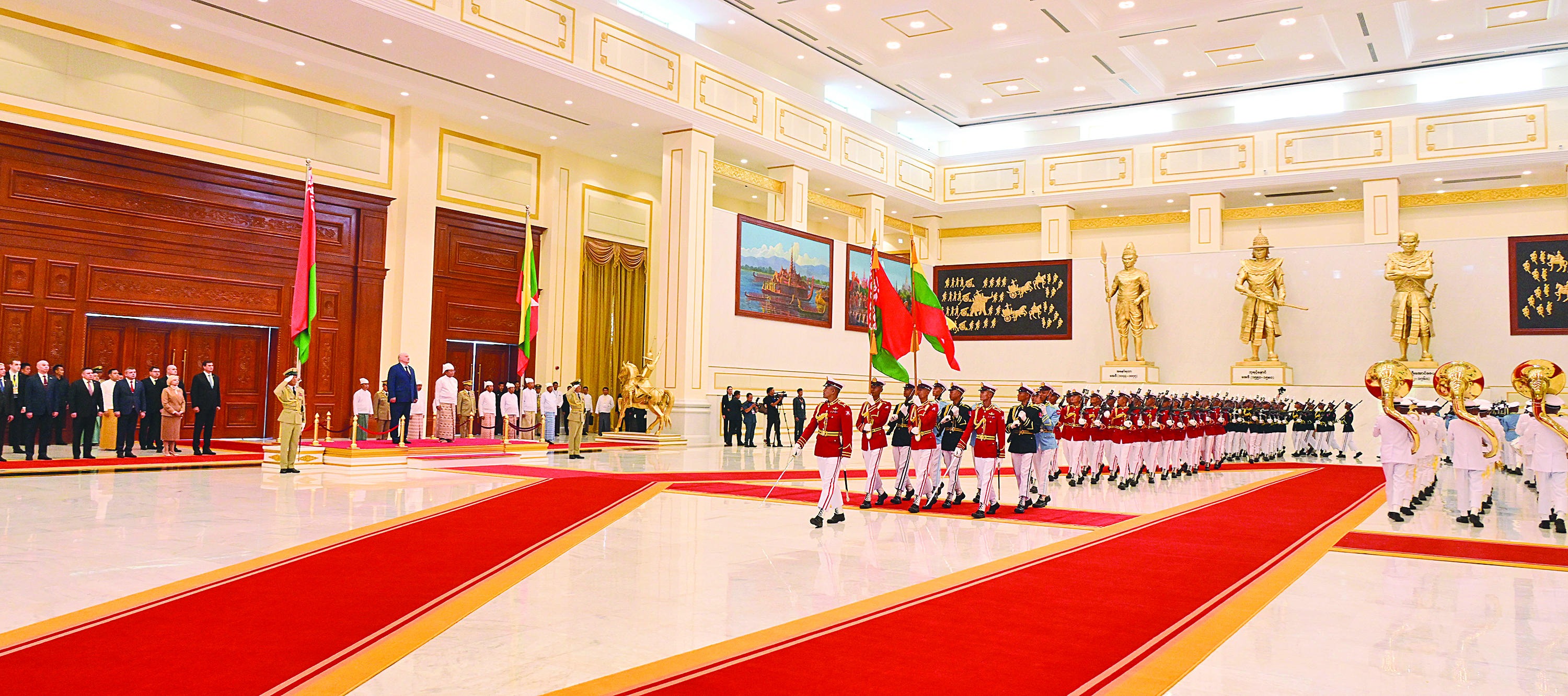 ပြည်ထောင်စုသမ္မတမြန်မာနိုင်ငံတော် ယာယီသမ္မတ နိုင်ငံတော်လုံခြုံရေးနှင့် အေးချမ်းသာယာရေးကော်မရှင်ဥက္ကဋ္ဌ ဗိုလ်ချုပ်မှူးကြီးမင်းအောင်လှိုင်သည် မြန်မာနိုင်ငံသို့တရားဝင်ချစ်ကြည်ရေးခရီးရောက်ရှိလာသော ဘယ်လာရုစ်သမ္မတနိုင်ငံသမ္မတ H.E. Mr. Aleksandr Lukashenko အား ယနေ့နံနက်ပိုင်းတွင် သမ္မတအိမ်တော်၊ ဆင်ဖြူတော်ဆောင်ဧည့်ခန်းမ၌ ဂုဏ်ပြုတပ်ဖွဲ့ဖြင့် ကြိုဆိုသည်။