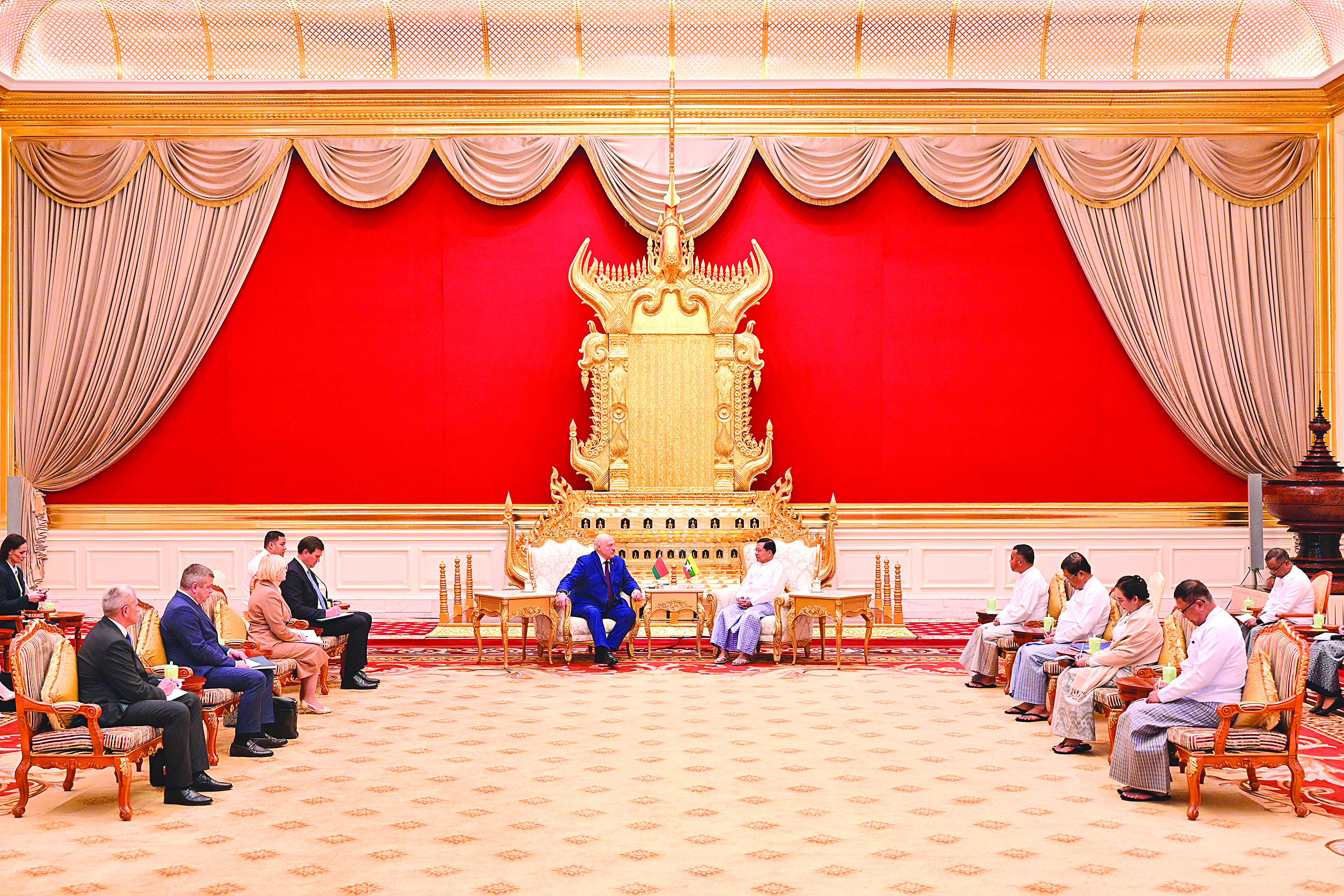 ထိုသို့တွေ့ဆုံဆွေးနွေးစဉ် နိုင်ငံတော်ယာယီသမ္မတ နိုင်ငံတော်လုံခြုံရေးနှင့် အေးချမ်းသာယာရေးကော်မရှင်ဥက္ကဋ္ဌက အဆွေတော် ဘယ်လာရုစ်သမ္မတနိုင်ငံသမ္မတ နှင့် ကိုယ်စားလှယ်အဖွဲ့ဝင်များအားလုံးကို မြန်မာနိုင်ငံမှ လှိုက်လှဲနွေးထွေးစွာ ကြိုဆိုပါကြောင်း၊ ဘယ်လာရုစ်နိုင်ငံအနေဖြင့် မြန်မာနိုင်ငံအပေါ် ချစ်ကြည်ရင်းနှီးမှု၊ ယုံကြည်မှုကို ပြသသည့်ခရီးစဉ်တစ်ခုဖြစ်ပြီး နှစ်နိုင်ငံအကြား သံတမန်ဆက်ဆံမှု ၂၆ နှစ်တာကာလအတွင်း မြန်မာနိုင်ငံသို့ ဘယ်လာရုစ်နိုင်ငံမှနိုင်ငံတော်အကြီးအကဲအနေဖြင့် လာရောက်သည့် သမိုင်းဝင်ခရီးစဉ်တစ်ခု ဖြစ်ပါကြောင်း၊ ယခုကဲ့သို့ နှစ်နိုင်ငံအကြား ချစ်ကြည်ရေး ခရီးစဉ်များ အပြန်အလှန်သွားရောက်ခြင်းအားဖြင့် သံတမန်ဆက်ဆံမှုနှင့် ကဏ္ဍပေါင်းစုံ၌ ပူးပေါင်းဆောင်ရွက်မှုများကို ပိုမိုတိုးမြှင့်ဆောင်ရွက်နိုင်မည်ဖြစ်ကြောင်း၊ ဘယ်လာရုစ် နိုင်ငံအနေဖြင့် နိုင်ငံတကာမျက်နှာစာတွင် မြန်မာနိုင်ငံဘက်မှ ရပ်တည်ထောက်ခံပေးလျက်ရှိသည့်အတွက် ကျေးဇူးတင်ရှိပါကြောင်း၊ ဘယ်လာရုစ်နိုင်ငံအနေဖြင့် BRICS အဖွဲ့ဝင်နိုင်ငံဖြစ်ခဲ့သည့်အတွက်လည်း ဝမ်းမြောက်ပါကြောင်း၊ မြန်မာနိုင်ငံအနေဖြင့် ရှန်ဟိုင်းပူးပေါင်းဆောင်ရွက်မှုအဖွဲ့တွင် အဖွဲ့ဝင်အဖြစ် ဝင်ရောက်နိုင်ရေး ကြိုးပမ်းဆောင်ရွက်လျက်ရှိပြီး BRICS အဖွဲ့ဝင်နိုင်ငံဖြစ်စေရေးနှင့် ဥရောပ-အာရှစီးပွားရေးသမဂ္ဂ (EAEU)အဖွဲ့ဝင်နိုင်ငံဖြစ်စေရေးအတွက်လည်း ကြိုးပမ်း ဆောင်ရွက်လျက်ရှိသဖြင့် ဘယ်လာရုစ်နိုင်ငံအနေဖြင့် ဆက်လက်ထောက်ခံပေးစေလို ကြောင်း၊ အဆွေတော်ဘယ်လာရုစ်သမ္မတနိုင်ငံသမ္မတ၏ ယခုခရီးစဉ်တွင် နှစ်နိုင်ငံ အကြား ကဏ္ဍပေါင်းစုံတွင်ပူးပေါင်းဆောင်ရွက်မှုများ ပိုမိုတိုးမြှင့်နိုင်ရေးအတွက် ဆွေးနွေးမှုများ ဆောင်ရွက်နိုင်မည်ဟု ယုံကြည်ပါကြောင်းဖြင့် ပြောကြားသည်။