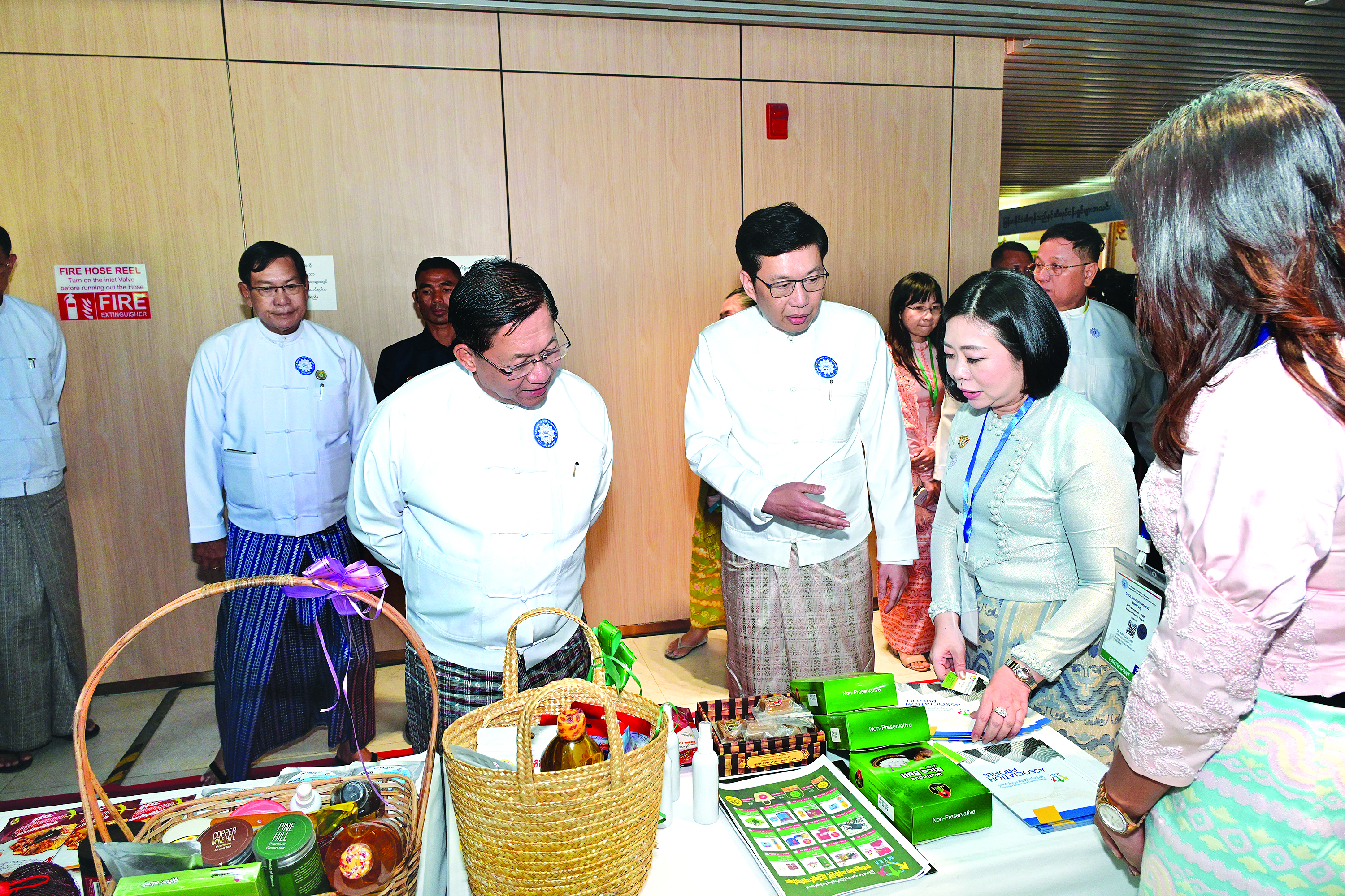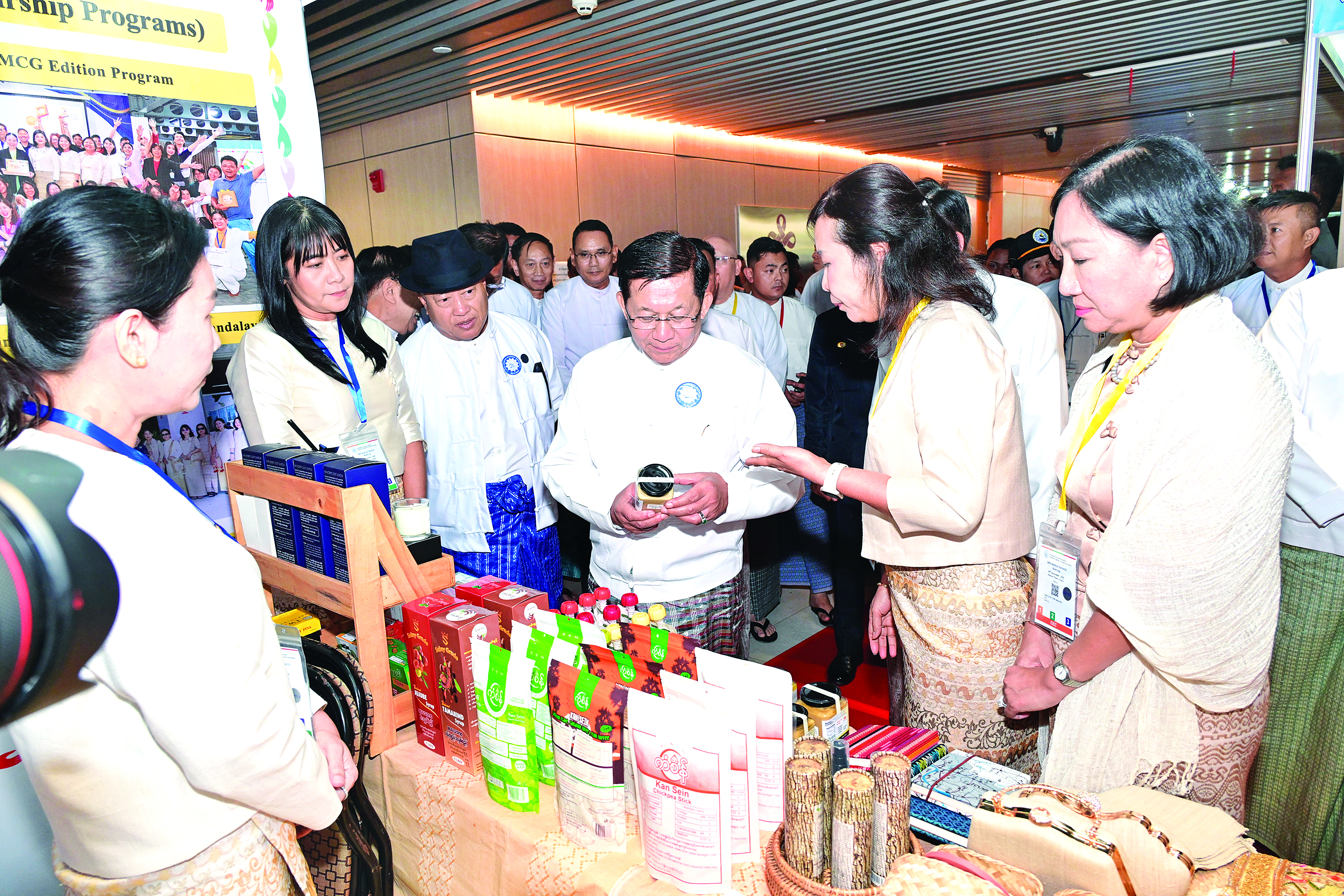 ယင်းနောက် နိုင်ငံတော်ယာယီသမ္မတ နိုင်ငံတော်လုံခြုံရေးနှင့် အေးချမ်းသာယာ ရေးကော်မရှင်ဥက္ကဋ္ဌနှင့် အဖွဲ့ဝင်များသည် ပြည်ထောင်စုသမ္မတမြန်မာနိုင်ငံ ကုန်သည် များနှင့် စက်မှုလက်မှုလုပ်ငန်းရှင်များ အသင်းချုပ် (၃၄)ကြိမ်မြောက် နှစ်ပတ်လည် အသင်းသားစုံညီ အစည်းအဝေးတွင် ခင်းကျင်းပြသထားသည့် ပြခန်းများအားပြခန်းတစ်ခုချင်းစီအလိုက် လိုက်လံကြည့်ရှုအားပေးခဲ့ကြောင်း သတင်းရရှိသည်။