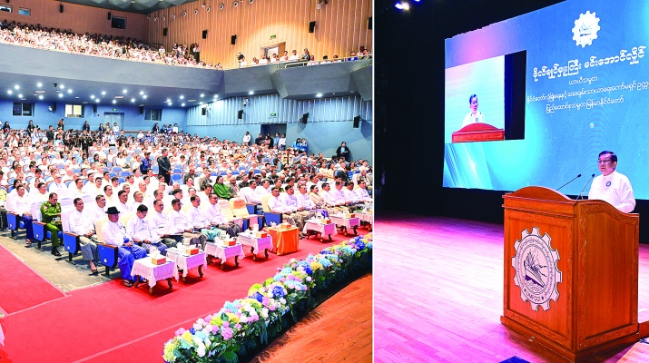 ပြည်ထောင်စုသမ္မတမြန်မာနိုင်ငံ ကုန်သည်များနှင့်စက်မှုလက်မှုလုပ်ငန်းရှင်များအသင်းချုပ် (၃၄)ကြိမ်မြောက် နှစ်ပတ်လည်အသင်းသားစုံညီအစည်းအဝေးကို ယနေ့မွန်းလွဲပိုင်းတွင် ရန်ကုန်မြို့ရှိ အမျိုးသားကဇာတ်ရုံ၌ကျင်းပပြုလုပ်ရာ ပြည်ထောင်စုသမ္မတမြန်မာနိုင်ငံတော်ယာယီသမ္မတ နိုင်ငံတော်လုံခြုံရေးနှင့်အေးချမ်းသာယာရေးကော်မရှင်ဥက္ကဋ္ဌ ဗိုလ်ချုပ်မှူးကြီးမင်းအောင်လှိုင် တက်ရောက်အမှာစကားပြောကြားသည်။