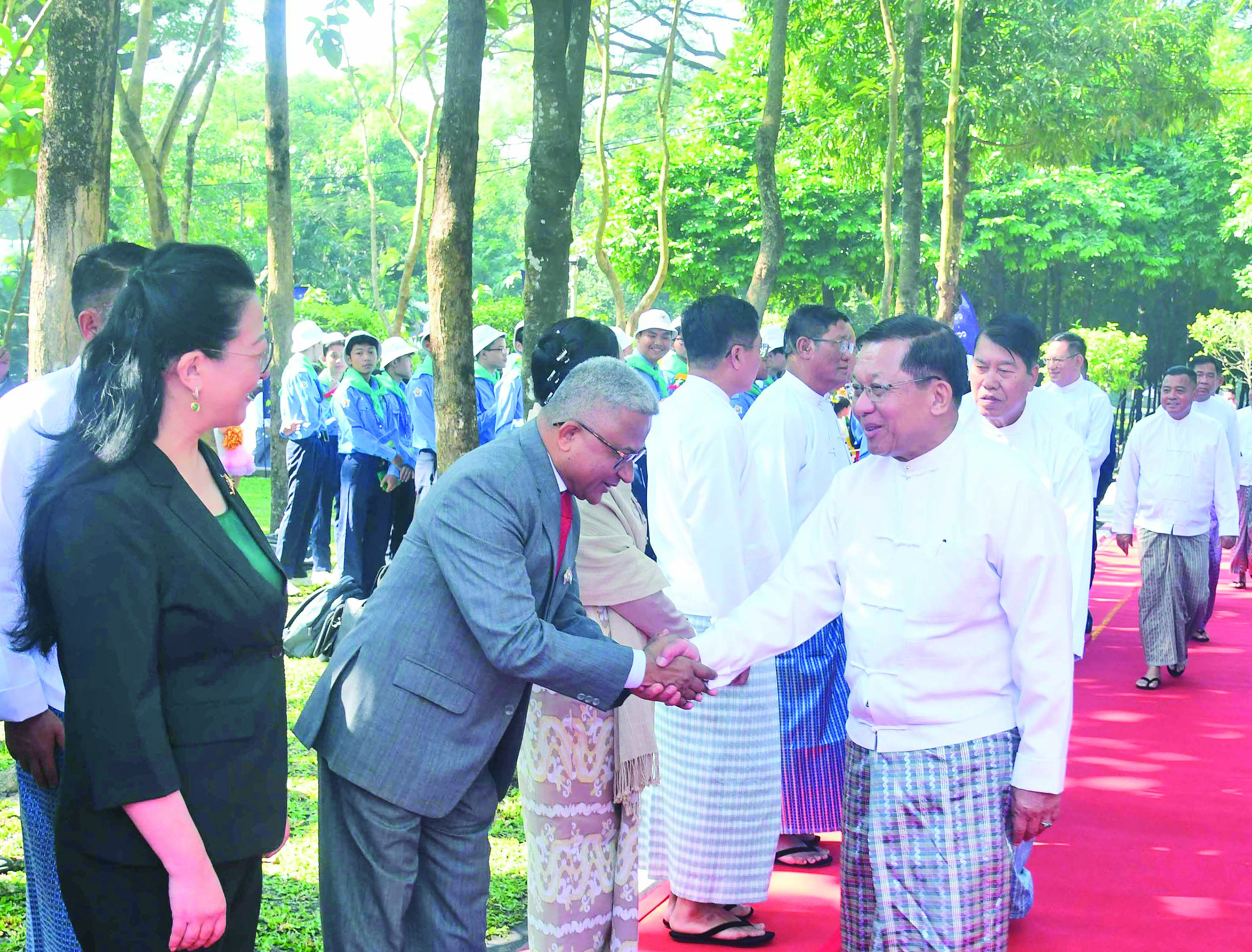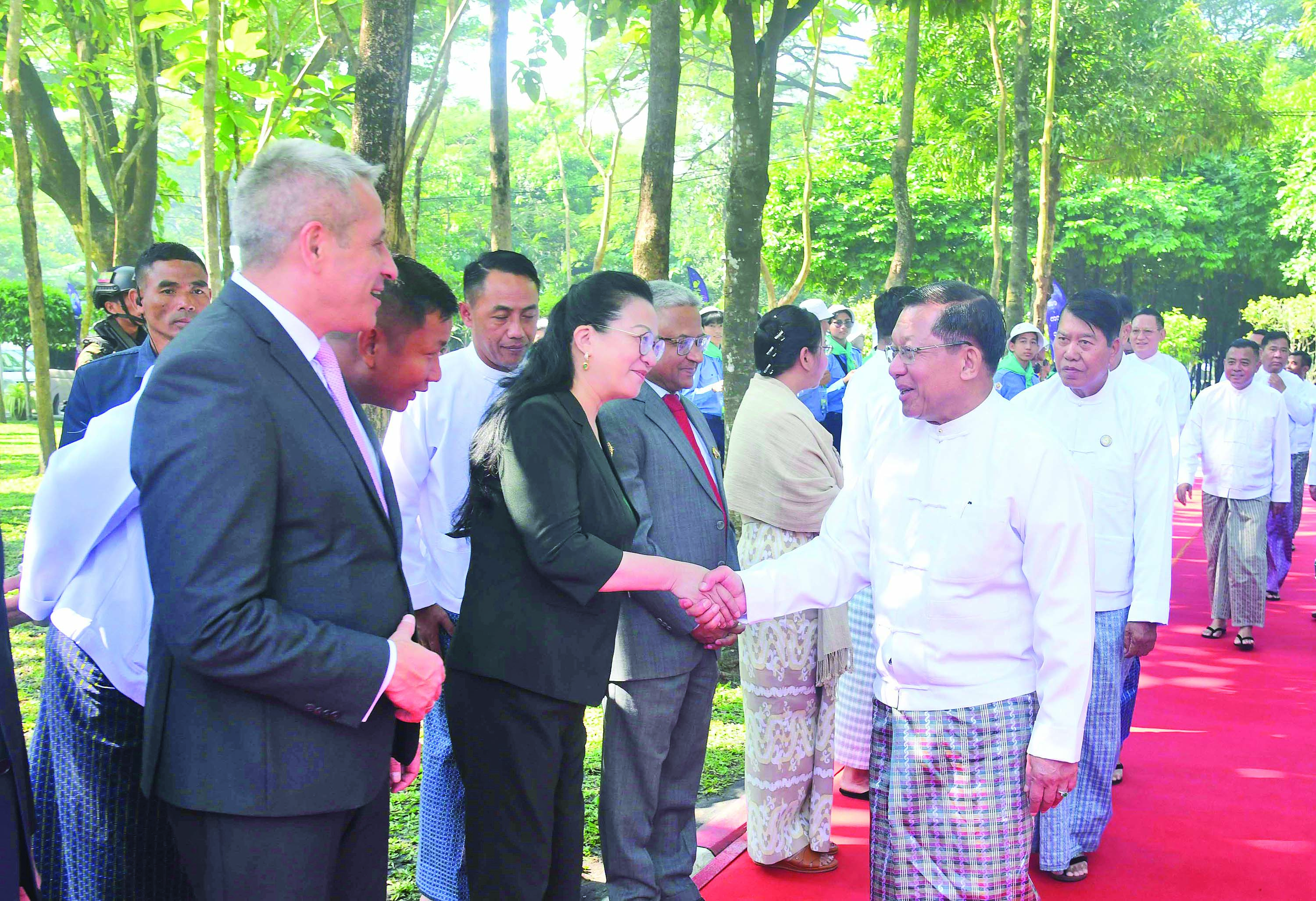 ဦးစွာ နိုင်ငံတော်ယာယီသမ္မတ နိုင်ငံတော်လုံခြုံရေးနှင့်အေးချမ်းသာယာရေး ကော်မရှင်ဥက္ကဋ္ဌသည် ဖွင့်ပွဲအခမ်းအနားကျင်းပပြုလုပ်မည့်နေရာသို့ရောက်ရှိကြရာနိုင်ငံတကာသံတမန်များ၊တာဝန်ရှိသူများနှင့်ကျောင်းသား၊ ကျောင်းသူများက ခရီးဦးကြိုဆိုနှုတ်ဆက်ကြသည်။