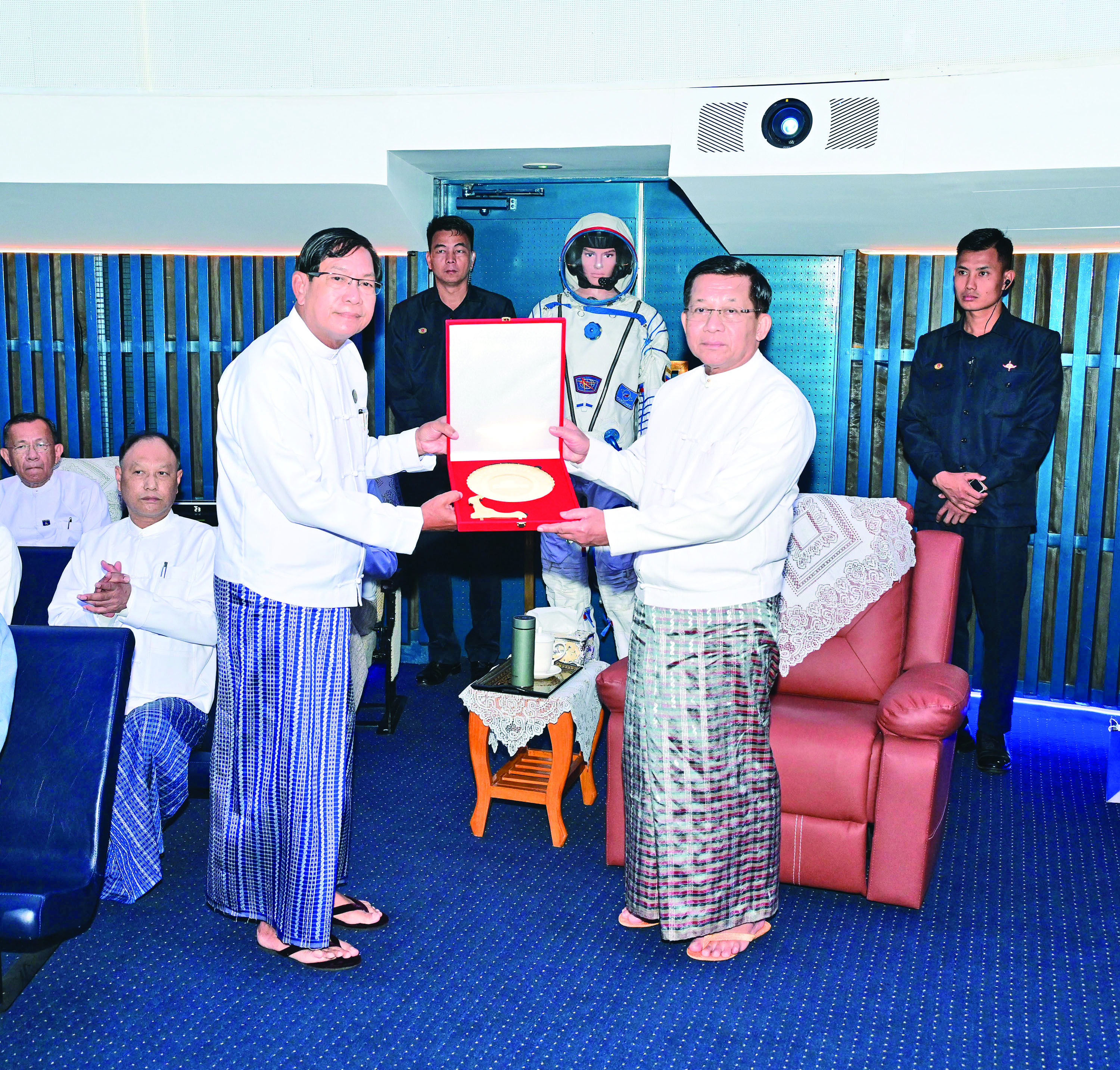 ၎င်းနောက် နိုင်ငံတော်ယာယီသမ္မတ နိုင်ငံတော်လုံခြုံရေးနှင့်အေးချမ်းသာယာ ရေးကော်မရှင်ဥက္ကဋ္ဌထံရန်ကုန်တိုင်းဒေသကြီးဝန်ကြီးချုပ်က အာကာသပြတိုက် (ရန်ကုန်)ဖွင့်ပွဲအထိမ်းအမှတ်လက်ဆောင်အား ဂါရဝပြုပေးအပ်သည်။