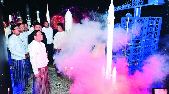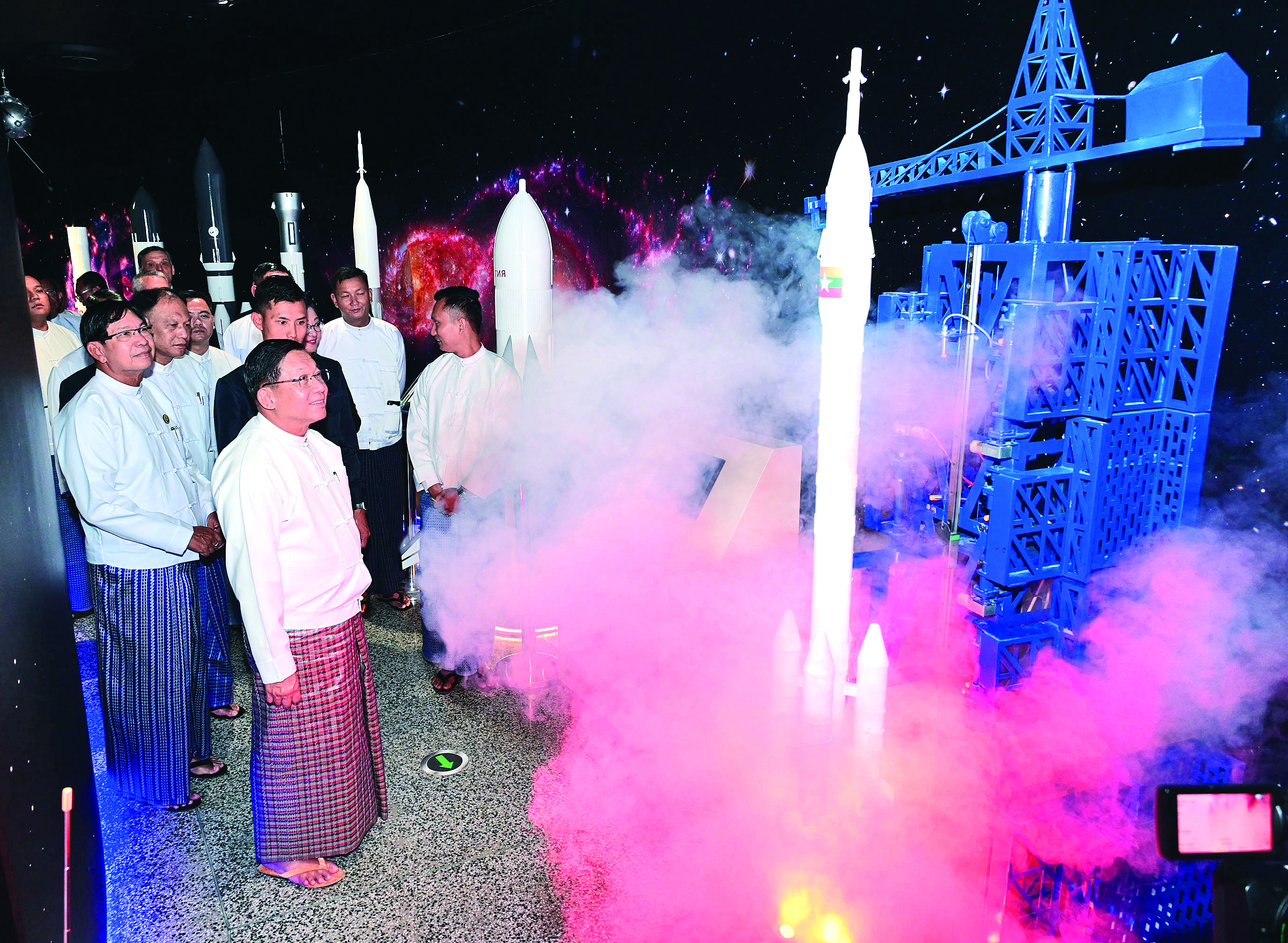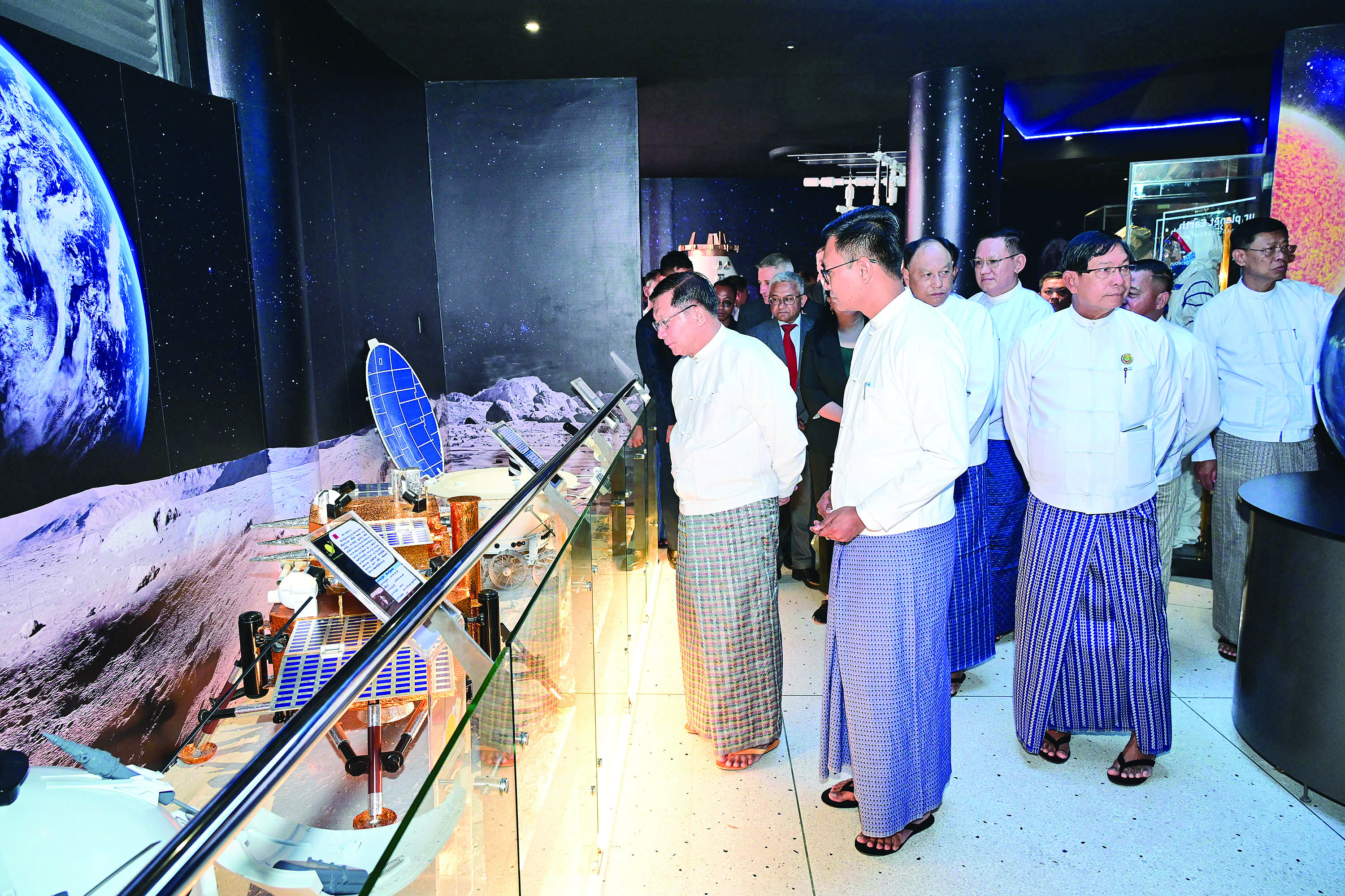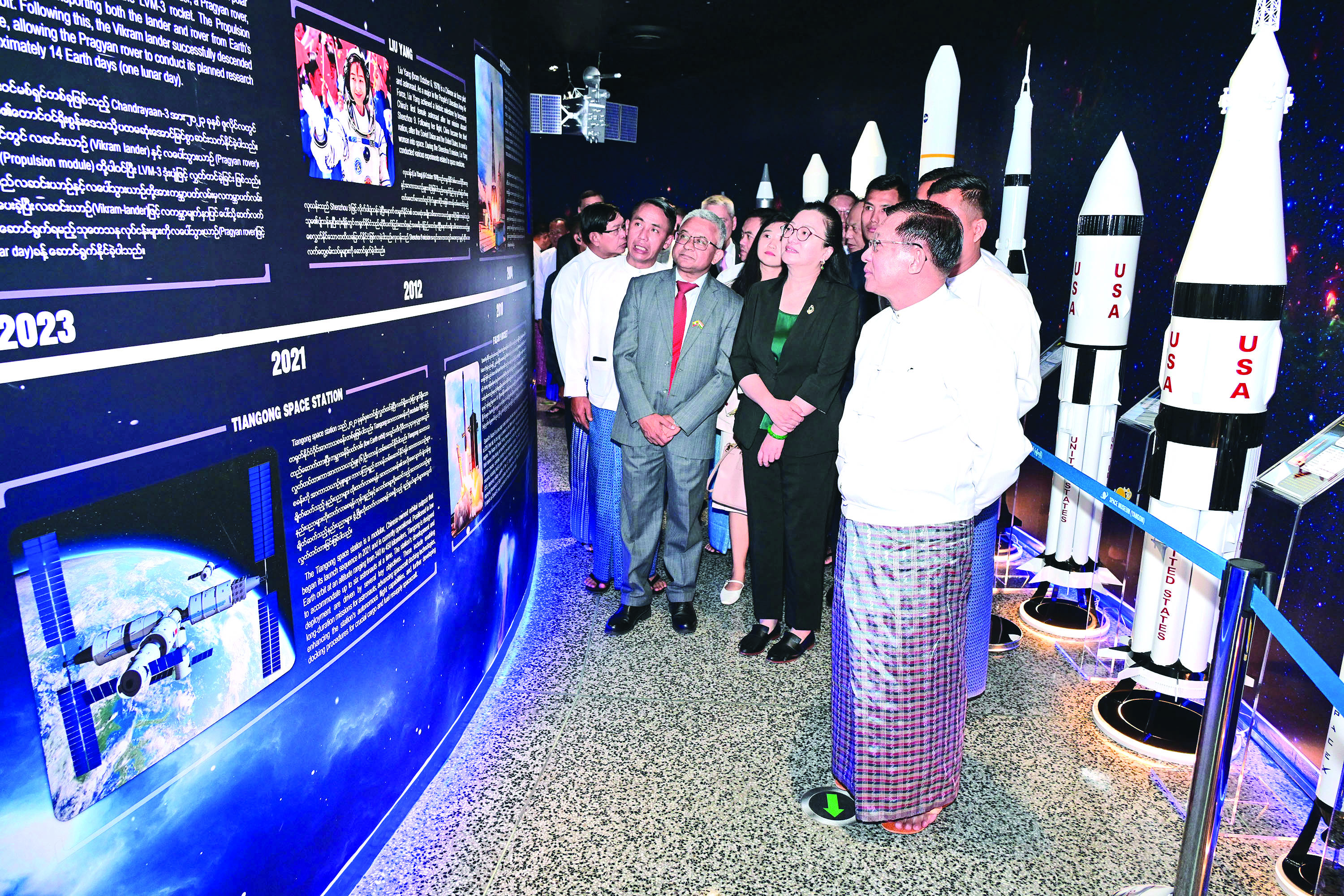 ထို့နောက် နိုင်ငံတော်ယာယီသမ္မတ နိုင်ငံတော်လုံခြုံရေးနှင့် အေးချမ်းသာယာရေး ကော်မရှင်ဥက္ကဋ္ဌနှင့် အခမ်းအနားတက်ရောက်လာကြသူများသည် ပြတိုက်အတွင်းရှိ Deep Space Exploration ပြခန်း၊ Space Station ပြခန်း၊ ရုရှားဖက်ဒရေးရှင်းနိုင်ငံ၊ တရုတ်ပြည်သူ့သမ္မတနိုင်ငံ၊ အိန္ဒိယနိုင်ငံနှင့် အမေရိကန်နိုင်ငံတို့မှ အာကာသတွင်းသို့ ခေတ်အဆက်ဆက် လွှတ်တင်ခဲ့သည့်ဒုံးပျံများနှင့် အာကာသယာဉ်ပုံစံငယ်များ၊ အာကာသတွင်းလှည့်ပတ်သွားလာလျက်ရှိသည့် ဂြိုဟ်တုပုံစံငယ်များ၊ ဒုံးပျံလွှတ်တင်ရေးစခန်းမှ ဒုံးပျံလွှတ်တင်မှု သရုပ်ပြသမှုများကို လိုက်လံကြည့်ရှုကြရာ တာဝန်ရှိသူများကရှင်းလင်းတင်ပြကြသည်။