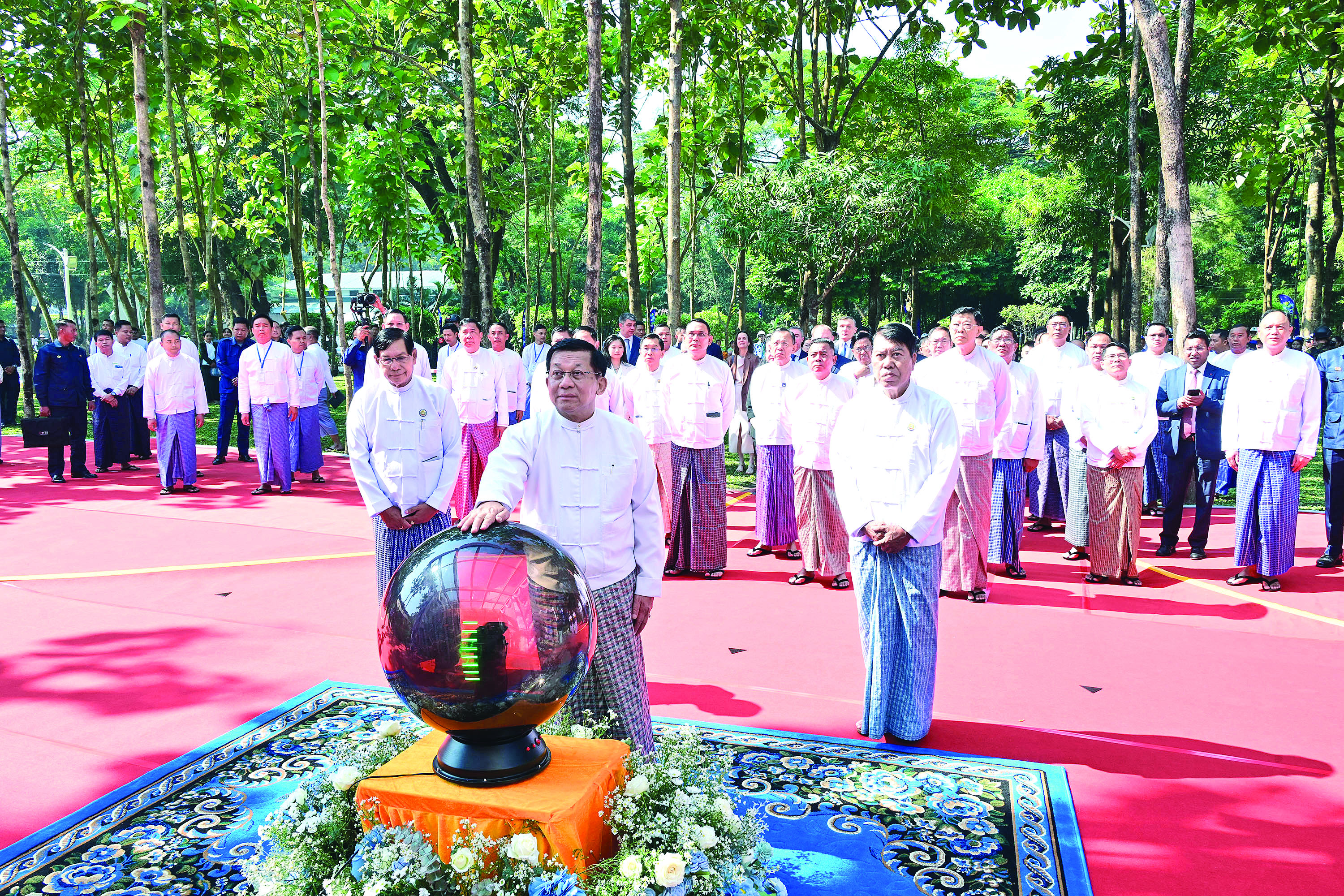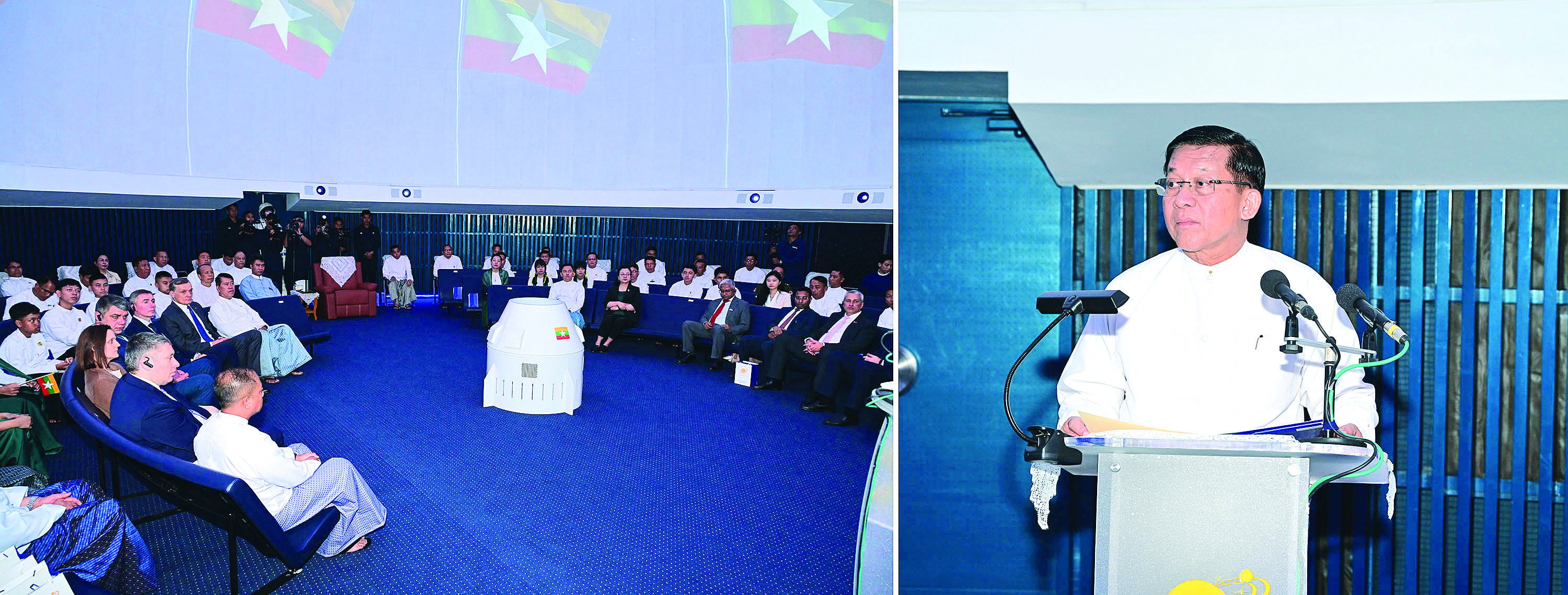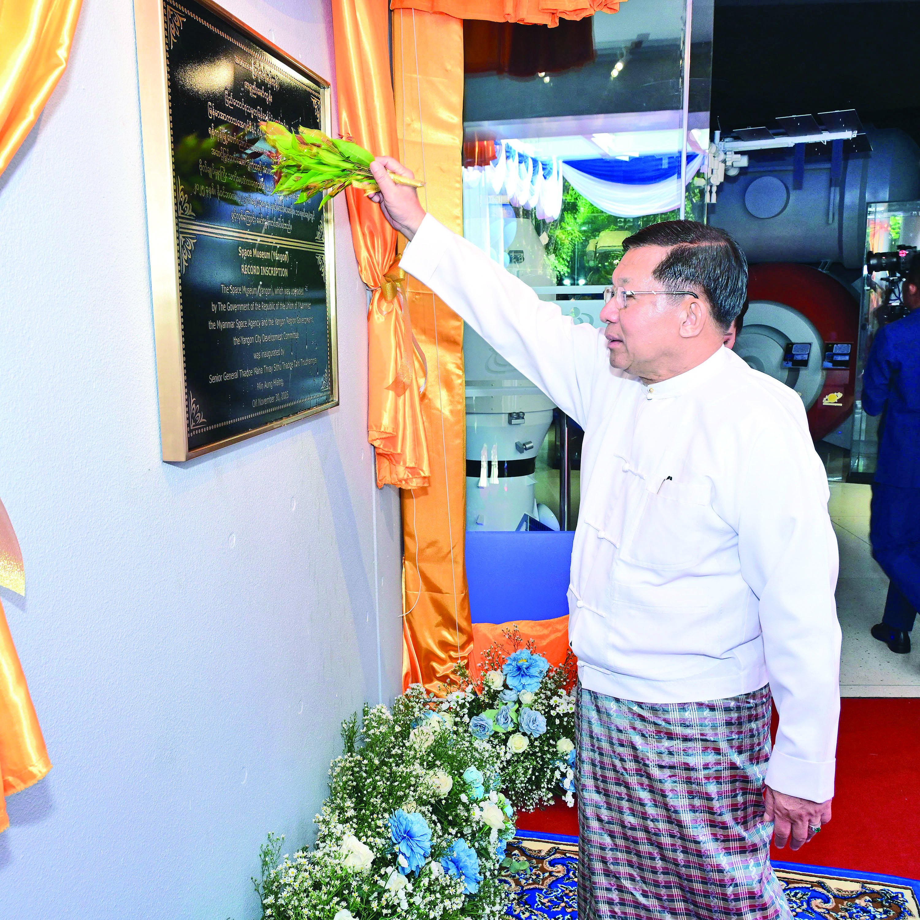 ရန်ကုန်မြို့၊ ပြည်သူ့ရင်ပြင်ရှိ အာကာသပြတိုက်(ရန်ကုန်)ဖွင့်ပွဲအခမ်းအနားအား ယနေ့နံနက်ပိုင်းတွင်ကျင်းပပြုလုပ်ရာ ပြည်ထောင်စုသမ္မတမြန်မာနိုင်ငံတော် ယာယီသမ္မတ နိုင်ငံတော်လုံခြုံရေးနှင့် အေးချမ်းသာယာရေးကော်မရှင်ဥက္ကဋ္ဌ ဗိုလ်ချုပ်မှူးကြီးမင်းအောင်လှိုင်တက်ရောက်ဖွင့်လှစ်ပေးသည်။