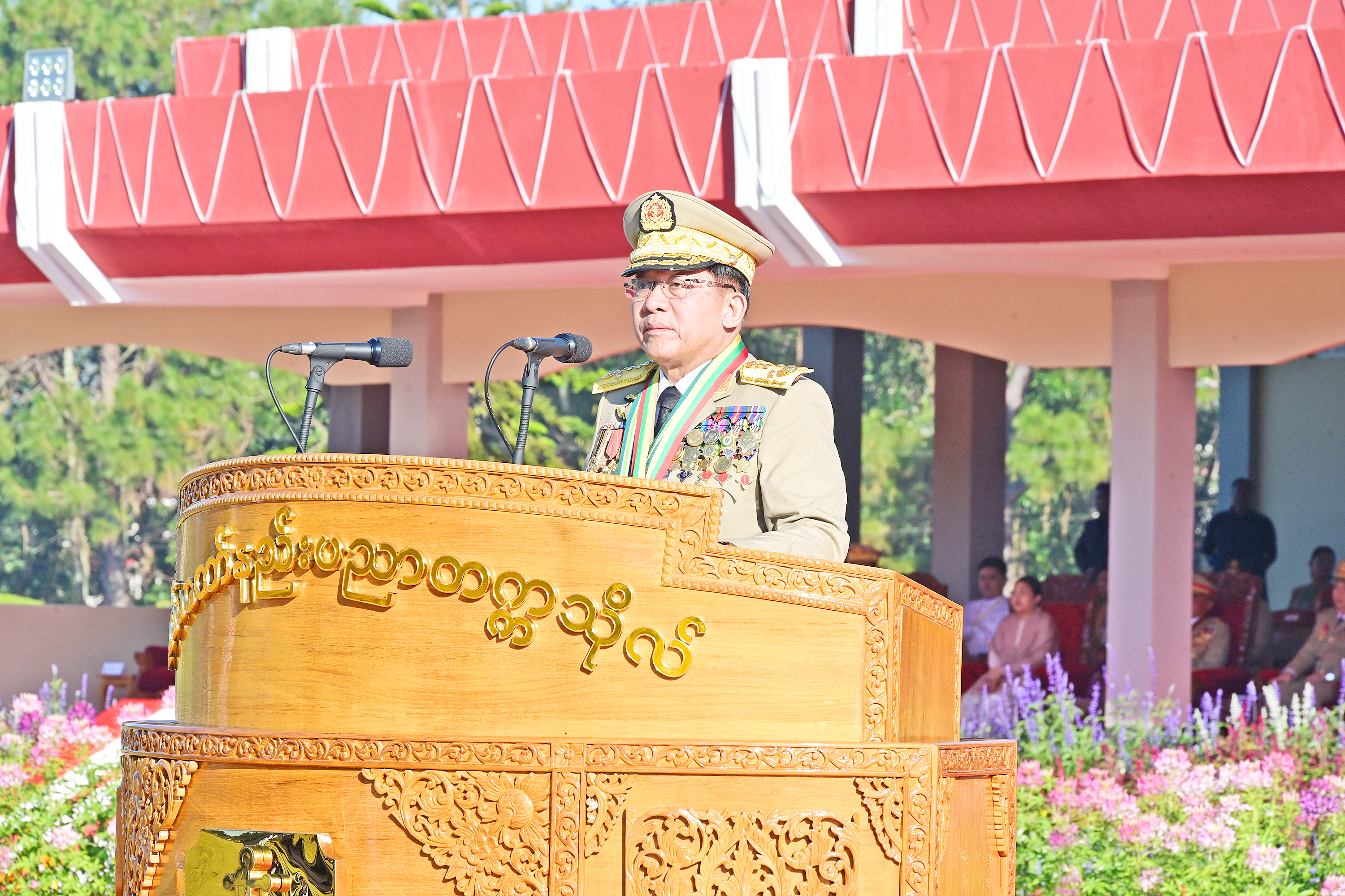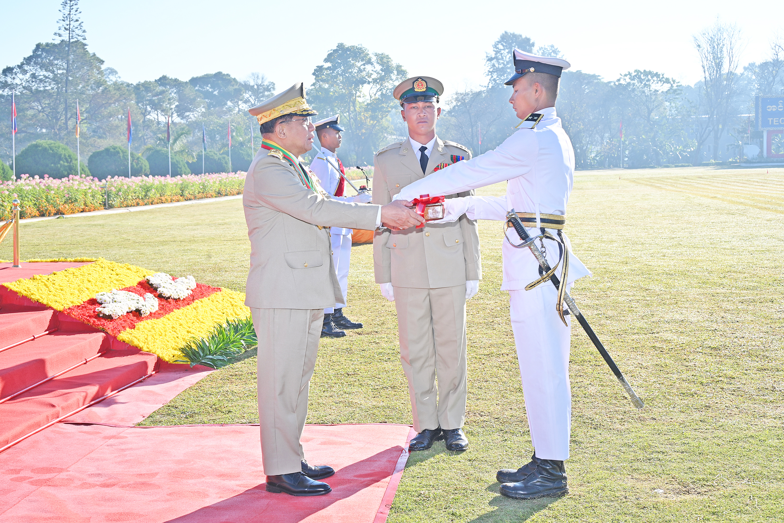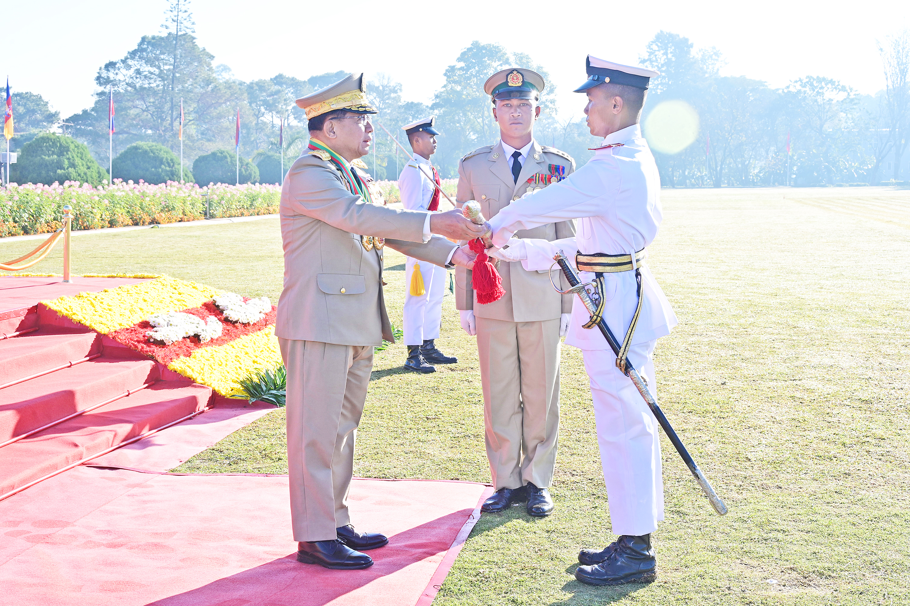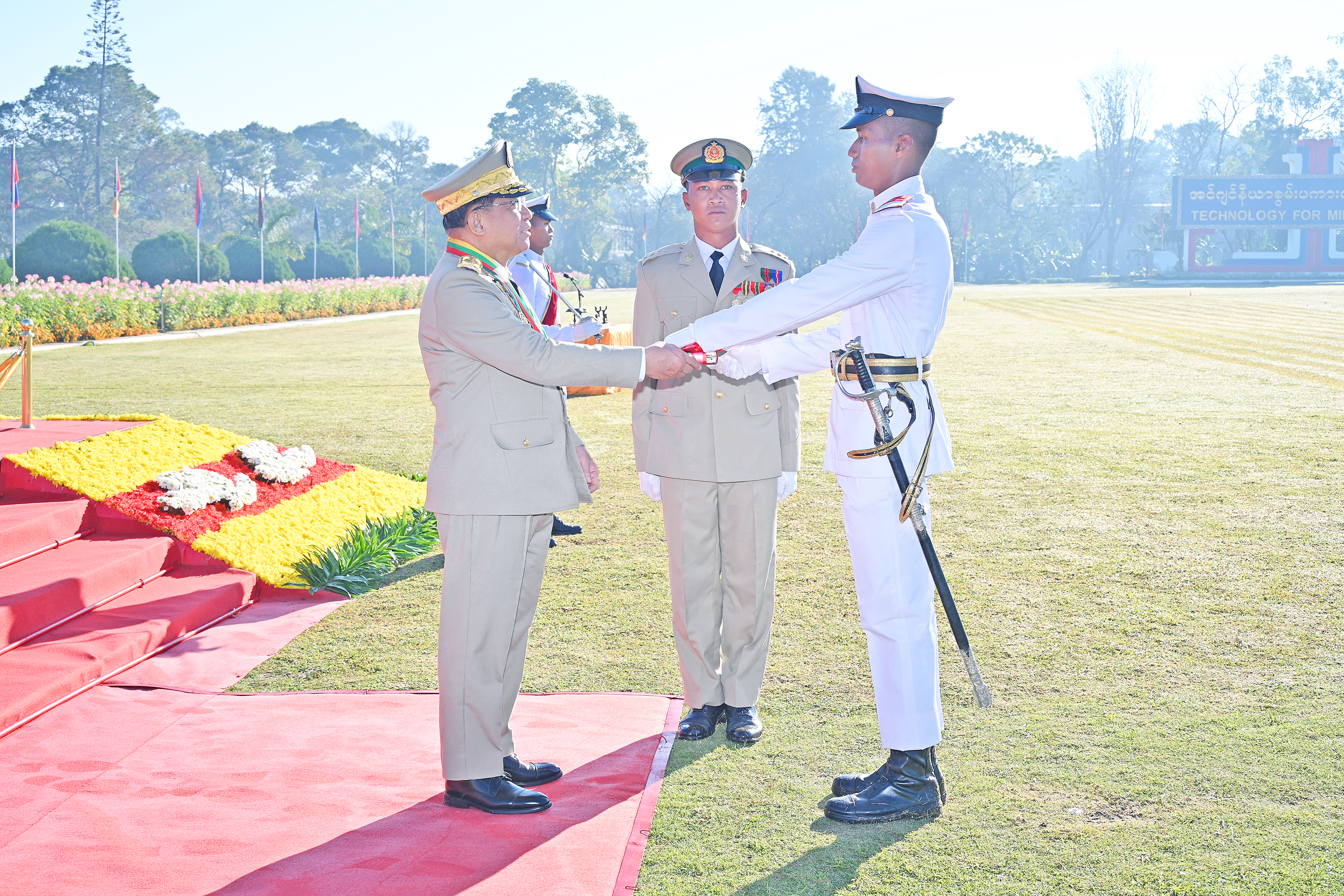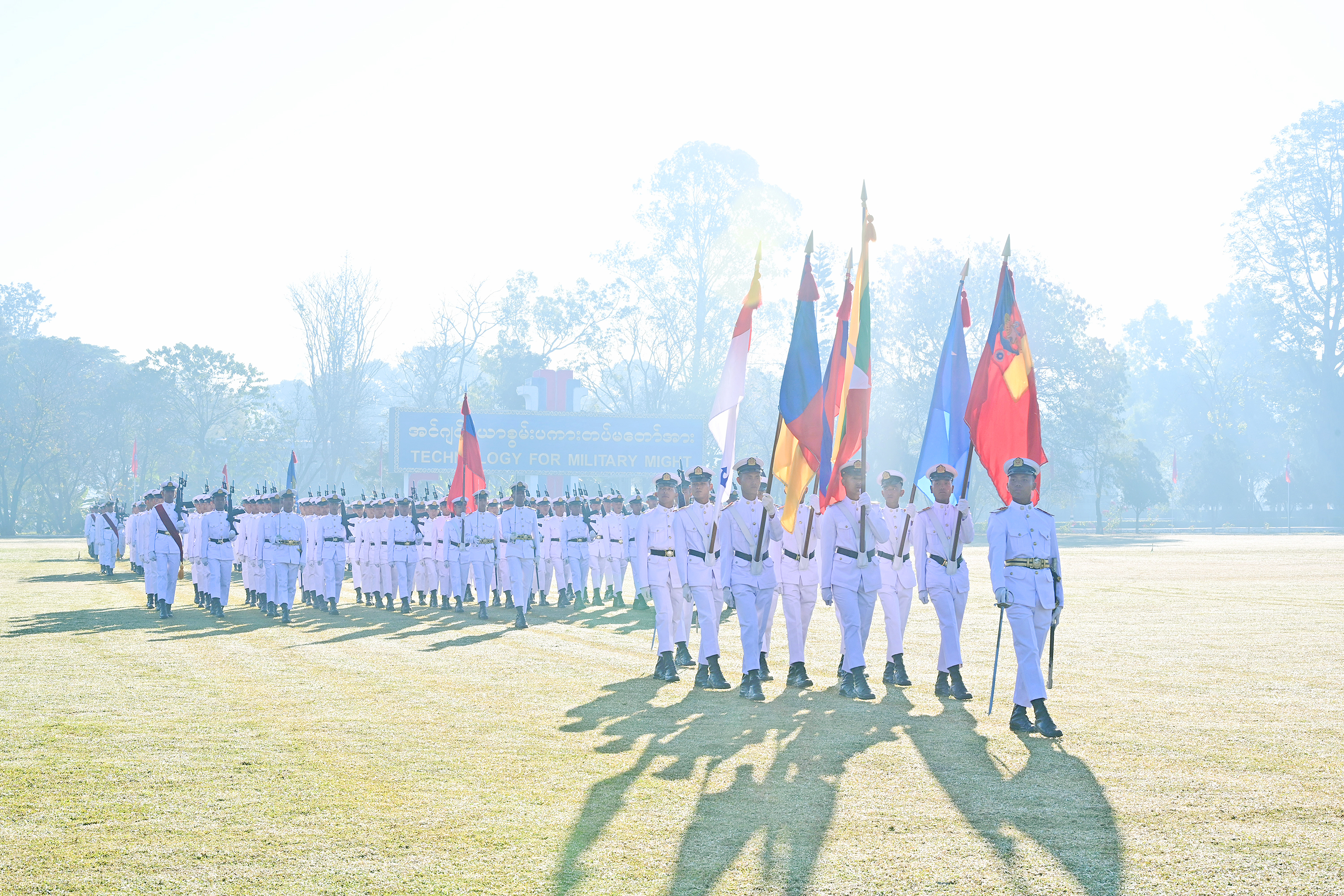 တပ်မတော်နည်းပညာတက္ကသိုလ် ဗိုလ်လောင်းသင်တန်းအမှတ်စဉ်(၂၇) သင်တန်းဆင်း ဂုဏ်ပြုစစ်ရေးပြအခမ်းအနားကို ယနေ့နံနက်ပိုင်းတွင် ပြင်ဦးလွင်မြို့၊ တပ်မတော် နည်းပညာတက္ကသိုလ် စစ်ရေးပြကွင်း၌ ကျင်းပပြုလုပ်ရာ နိုင်ငံတော်လုံခြုံရေးနှင့် အေးချမ်းသာယာရေးကော်မရှင်ဥက္ကဋ္ဌတပ်မတော်ကာကွယ်ရေးဦးစီးချုပ်ဗိုလ်ချုပ်မှူးကြီး သတိုးမဟာသရေစည်သူ သတိုးသီရိသုဓမ္မမင်းအောင်လှိုင် တက်ရောက် မိန့်ခွန်း ပြောကြားသည်။