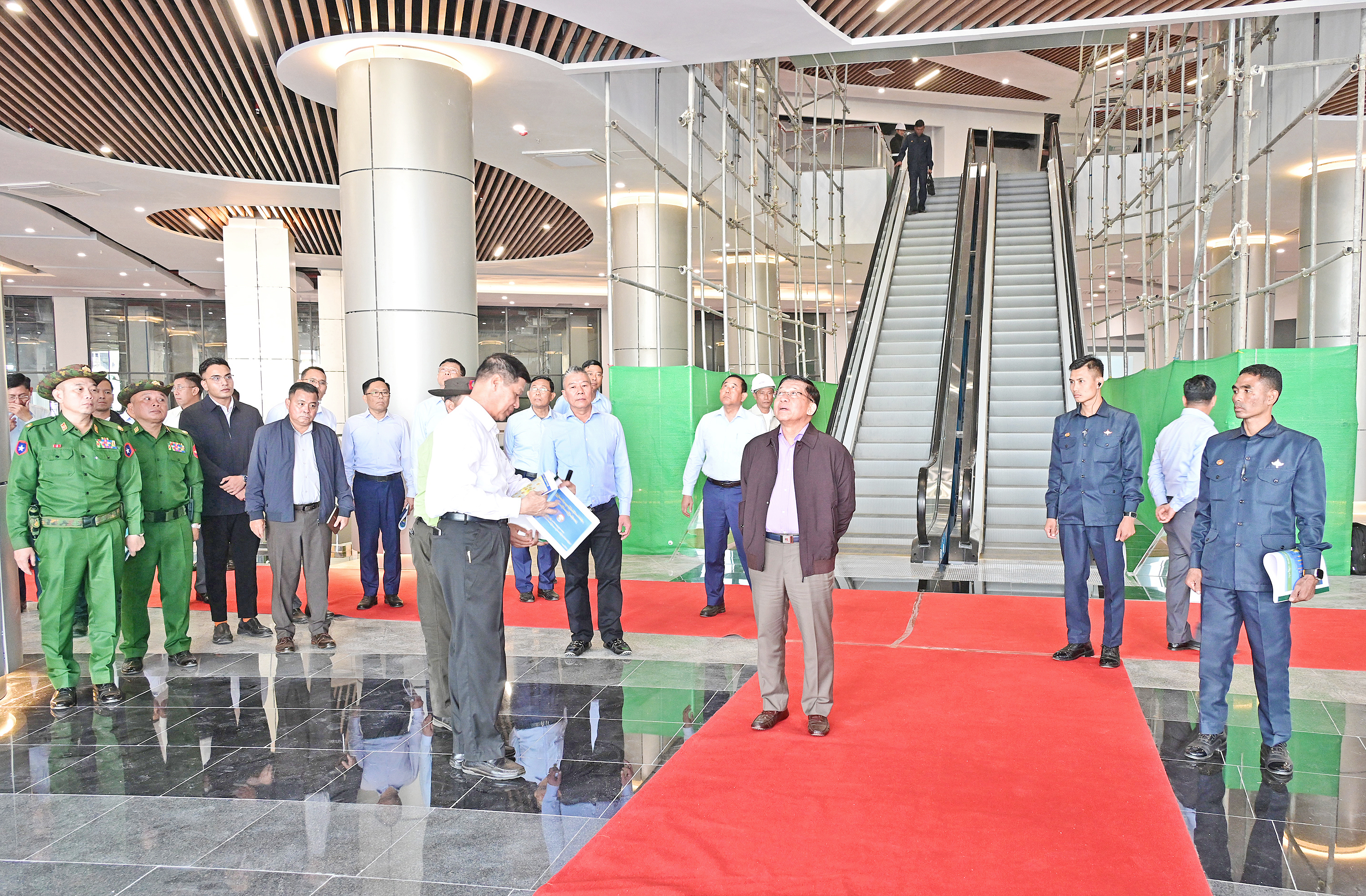 သုမင်္ဂလာဈေး(ညံတောဈေး) အဆင့်မြင့်ဈေးသစ်တည်ဆောက်ရေးစီမံကိန်းထို့နောက် နိုင်ငံတော်ယာယီသမ္မတ နိုင်ငံတော်လုံခြုံရေးနှင့် အေးချမ်းသာယာရေးကော်မရှင် ဥက္ကဋ္ဌနှင့် အဖွဲ့ဝင်များသည် ပြင်ဦးလွင်မြို့၊ သုမင်္ဂလာဈေး(ညံတောဈေး) အဆင့်မြင့်ဈေး သစ် တည်ဆောက်ရေးစီမံကိန်းသို့ သွားရောက်ကြည့်ရှုစစ်ဆေးရာ မန္တလေးတိုင်း ဒေသကြီး ဝန်ကြီးချုပ် ဦးမျိုးအောင်က အဆင့်မြင့်ဈေးသစ် တည်ဆောက်ရေးစီမံကိန်း လုပ်ငန်းအဆင့်ဆင့်အလိုက် ဆောင်ရွက်ပြီးစီးမှုနှင့် ဆက်လက် ဆောင်ရွက်လျက်ရှိမှု၊ အထပ်အလိုက် ဆိုင်ခန်းများဖွင့်လှစ်နိုင်ရေး လျာထားဆောင်ရွက်လျက်ရှိမှု၊ မြန်မာ ပြည်တွင်အကြီးဆုံး Curved LED Display နှင့် အဆောက်အဦမျက်နှာစာများ လုပ်ငန်း ဆောင်ရွက်ပြီးစီးမှု၊ အလှမီးဆိုင်းများ ထည့်သွင်းထားရှိမှု၊ ယာဉ်ရပ်နားသည့်နေရာများ ဆောင်ရွက်ထားရှိမှု၊ Solar System ဖြင့် စီမံကိန်းတစ်ခုလုံး၏ လျှပ်စစ် ဓာတ်အားလို အပ်ချက်ကို Air Condition System မှလွဲ၍ ကျန်လျှပ်စစ်ဓာတ်အားလိုအပ်ချက်အား ၆ နာရီကြာ ပံ့ပိုးပေးနိုင်အောင် ထည့်သွင်းဆောင်ရွက်ထားရှိမှု၊ ရေဝင်ရေထွက် ကောင်းမွန်စေရေးနှင့် ရေဆိုးစွန့်ထုတ်မှုတို့အတွက် တွက်ချက်ဆောင်ရွက်ထားရှိမှုနှင့် စီမံကိန်းအား သတ်မှတ်ကာလအတွင်းပြီးစီးနိုင်ရေးနှင့် ဆောက်လုပ်မှု စံချိန်စံညွှန်းများ နှင့် ကိုက်ညီမှုရှိစေရေး ကြပ်မတ်ဆောင်ရွက်လျက်ရှိမှုတို့နှင့်ပတ်သက်၍ ရှင်းလင်း တင်ပြသည်။