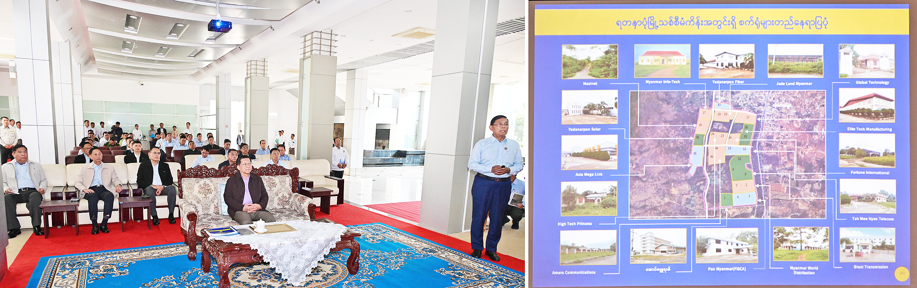 ဦးစွာ နိုင်ငံတော်ယာယီသမ္မတ နိုင်ငံတော်လုံခြုံရေးနှင့် အေးချမ်းသာယာရေးကော် မရှင်ဥက္ကဋ္ဌနှင့် အဖွဲ့ဝင်များသည် ရတနာပုံမြို့သစ်စီမံကိန်းရှိ ရတနာပုံတယ်လီပို့ အဆောက် အဦသို့ ရောက်ရှိရာ ဆောက်လုပ်ရေးဝန်ကြီးဌာန ပြည်ထောင်စုဝန်ကြီး ဦးမျိုးသန့်က ရတနာပုံမြို့သစ်စီမံကိန်းဆိုင်ရာအချက်အလက်များ၊ စီမံကိန်းအတွင်း ဆောင်ရွက်ထားရှိမှု၊ လူနေအိမ်ရာများ အကောင်အထည်ဖော်ဆောင်ရွက်ထားရှိမှု၊ ရတနာပုံတယ်လီပို့ဆိုင်ရာ အဆောက်အဦများ အကောင်အထည်ဖော်ဆောင်ရွက် ထားရှိမှု၊ စီမံကိန်းနယ်မြေအတွင်း လမ်းဖောက်လုပ်ခြင်း၊ ရေရရှိရေး၊ လျှပ်စစ်မီးရရှိ ရေးနှင့် အခြေခံအဆောက်အဦများ ဆောင်ရွက်ထားရှိမှု၊ စီမံကိန်းဆောင်ရွက်ရန် Expression Of Interest – EOI ဖိတ်ခေါ်ဆောင်ရွက်ထားရှိမှု၊နည်းပညာစက်မှုဇုန်အကောင် အထည်ဖော်ဆောင်ရွက်ထားရှိမှုအခြေအနေများ၊ လုပ်ငန်းများလည်ပတ်လျက်ရှိမှုနှင့် စီမံကိန်း ဆက်လက်ဆောင်ရွက်နိုင်မည့်အခြေအနေများကိုလည်းကောင်း၊ ပို့ဆောင်ရေး နှင့် ဆက်သွယ်ရေးဝန်ကြီးဌာန ပြည်ထောင်စုဝန်ကြီး ဦးမြထွန်းဦးက ရတနာပုံမြို့သစ် စီမံကိန်းဆိုင်ရာအချက်အလက်များ၊ စီမံကိန်းအဆင့်အလိုက် အကောင်အထည်ဖော် ဆောင်ရွက်လျက်ရှိမှု၊ မြန်မာ့ဆက်သွယ်ရေးလုပ်ငန်းပိုင် အုပ်ချုပ်မှုဆိုင်ရာအဆောက်အဦများ၊ ဝန်ထမ်းအိမ်ရာများဆိုင်ရာ အချက်အလက်များ၊ ရတနာပုံတယ်လီပို့ ကုမ္ပဏီလီမိတက်ပိုင် အဆောက်အဦများဆိုင်ရာ အချက်အလက်များ၊ Soft Base Factories Area ရှိစက်ရုံများဆိုင်ရာအချက်အလက်များနှင့်ပတ်သက်၍လည်းကောင်း ရှင်းလင်းတင်ပြကြသည်။