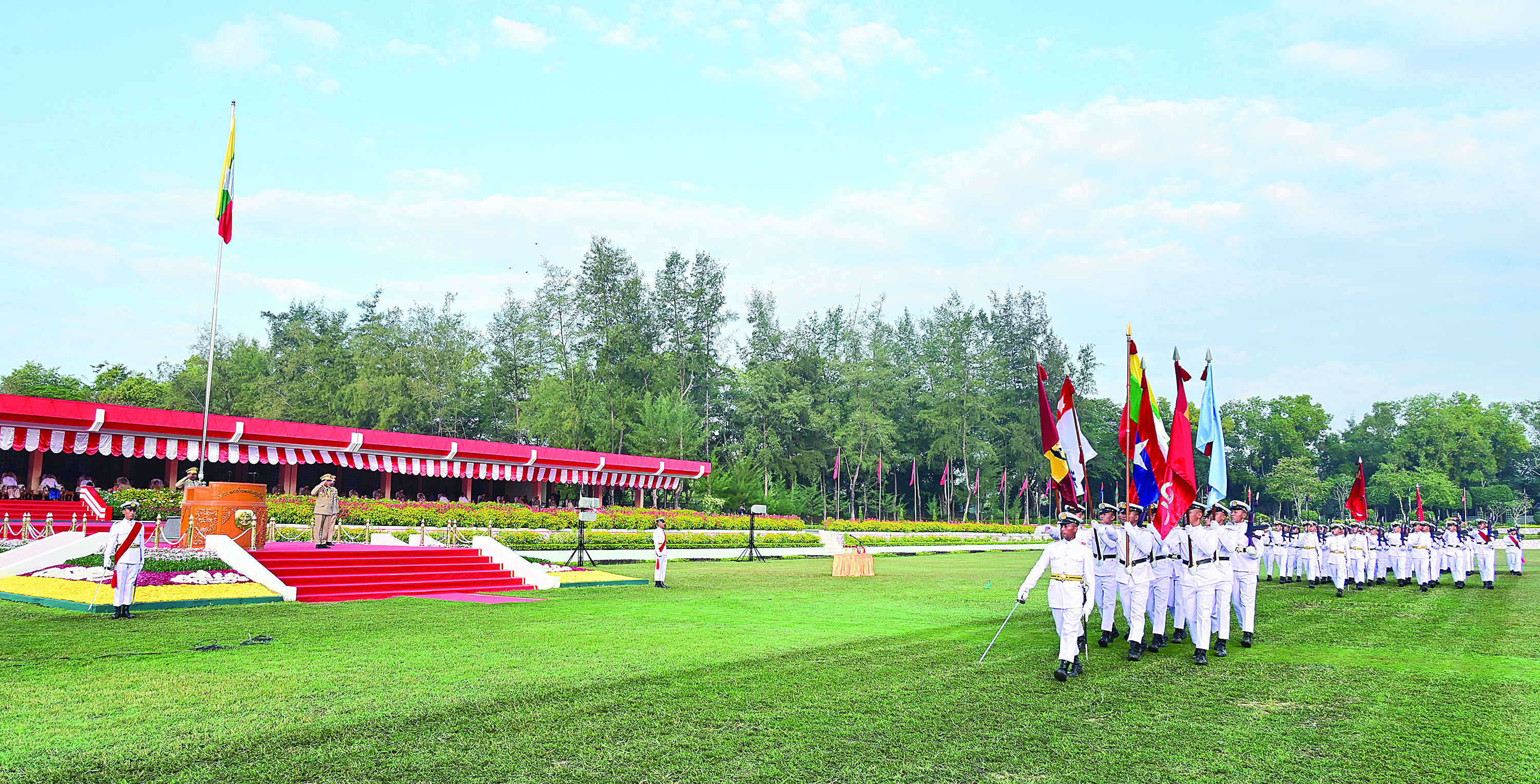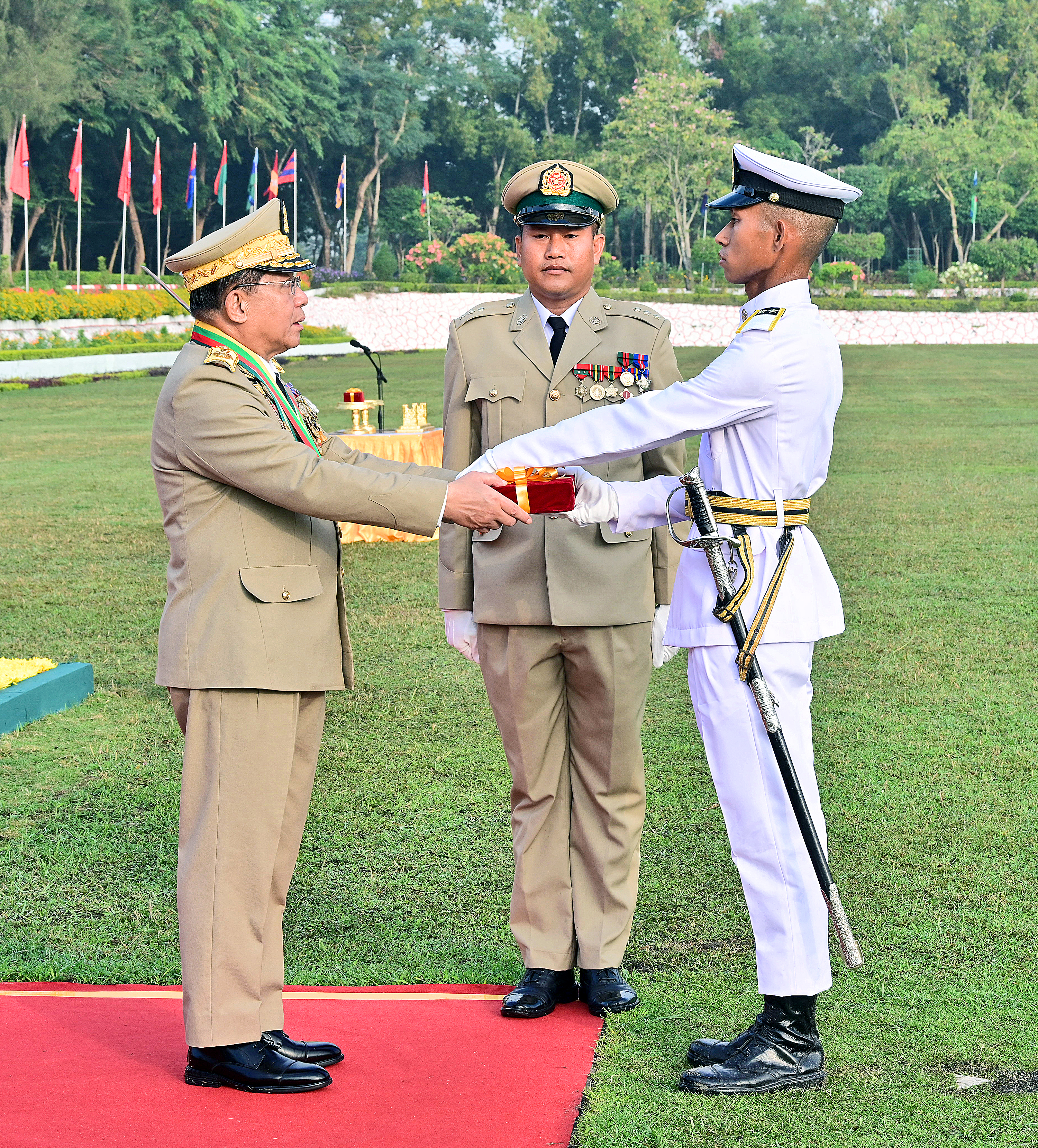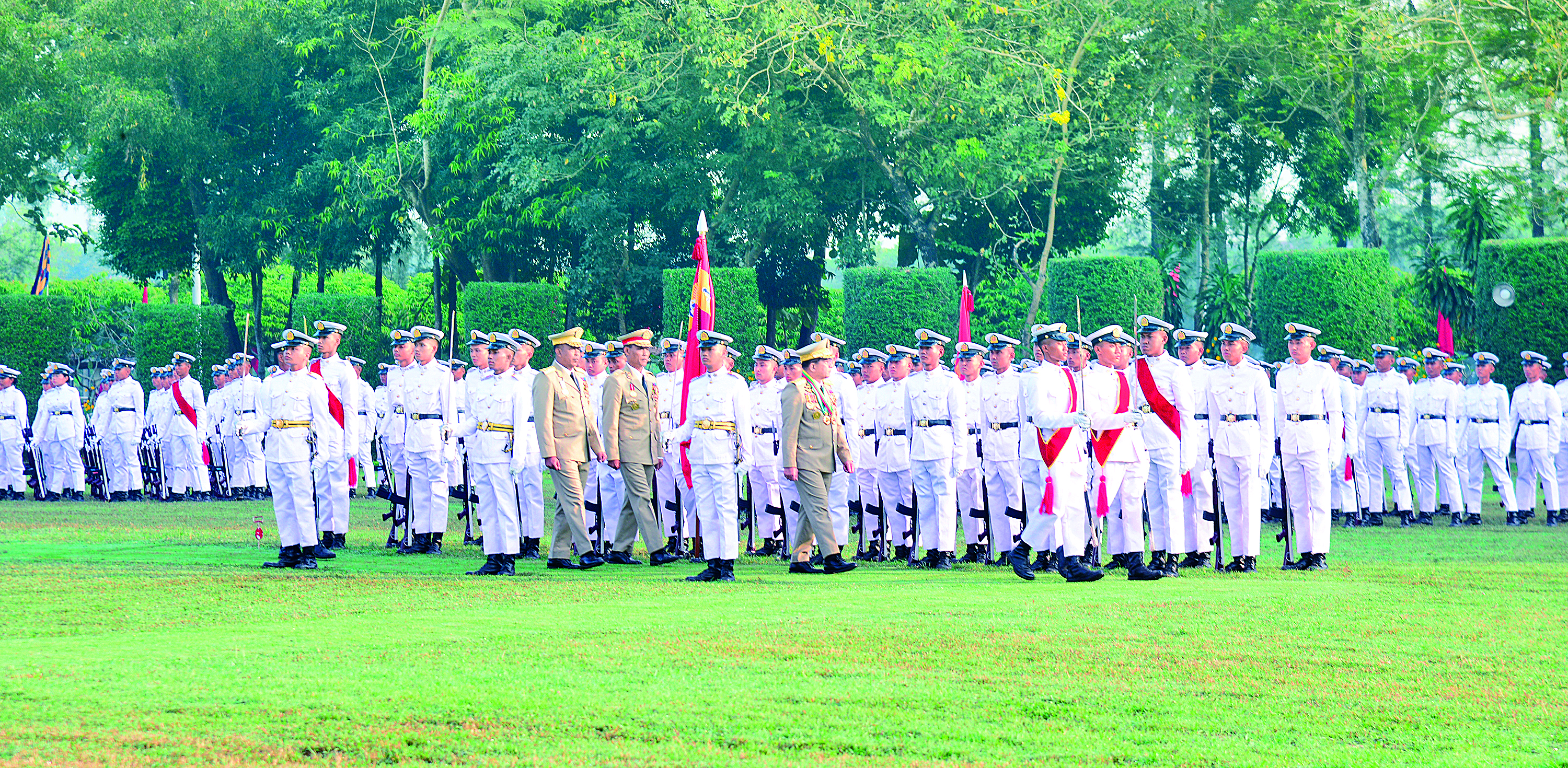 ယင်းနောက် နိုင်ငံတော်လုံခြုံရေးနှင့် အေးချမ်းသာယာရေးကော်မရှင်ဥက္ကဋ္ဌ တပ်မတော်ကာကွယ်ရေးဦးစီးချုပ် ဗိုလ်ချုပ်မှူးကြီး သတိုးမဟာသရေစည်သူ သတိုးသီရိသုဓမ္မမင်းအောင်လှိုင်သည် ဗိုလ်လောင်းတပ်ခွဲများ၏အလေးပြုခြင်းကိုခံယူပြီး စစ်ရေးပြအခမ်းအနားမှ ပြန်လည်ထွက်ခွာသည်။
