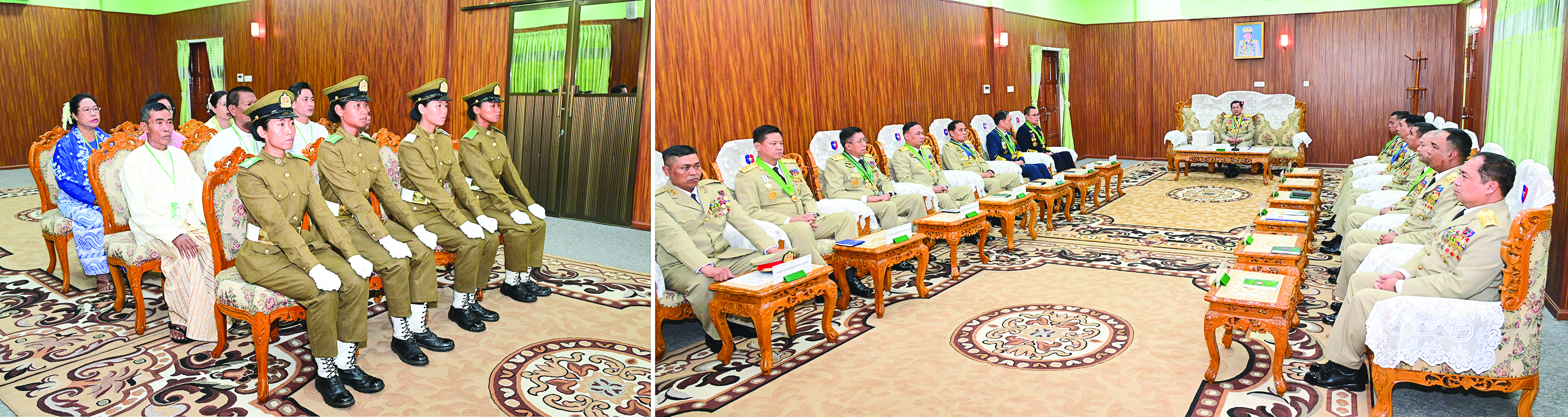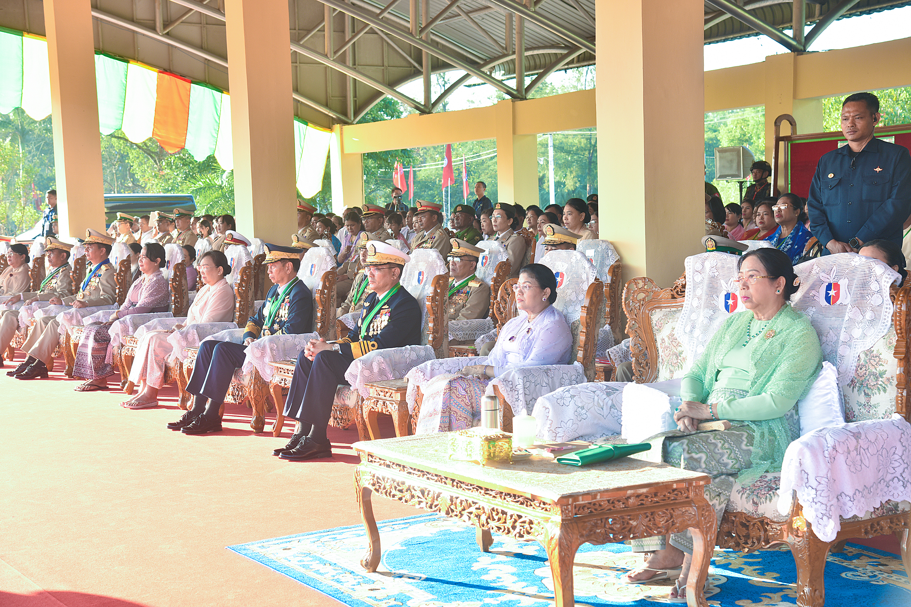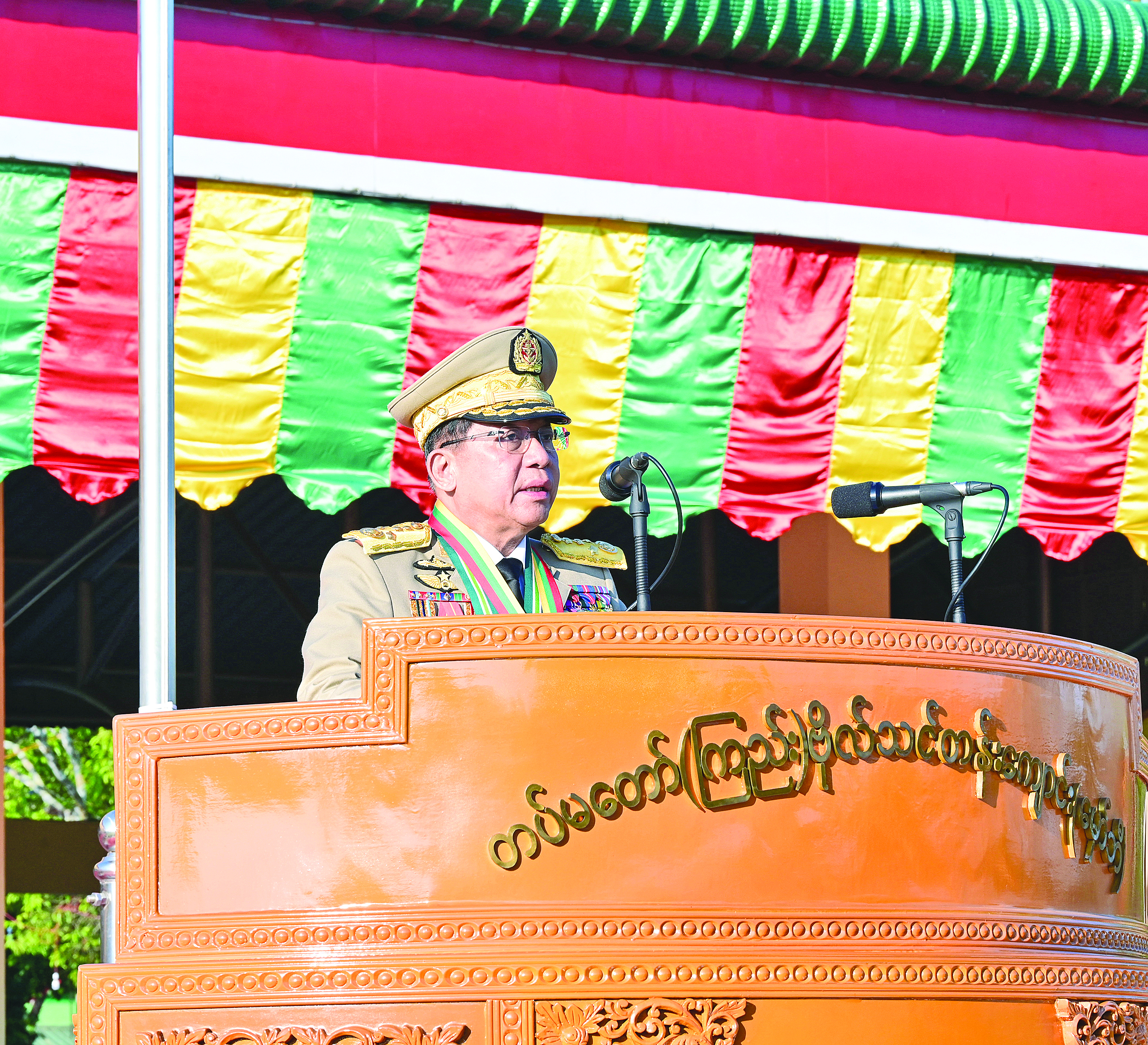 ဖွဲ့စည်းပုံအခြေခံဥပဒေ (၂၀၀၈ ခုနှစ်) အခန်း(၁)၊ ပုဒ်မ ၂၀၊ ပုဒ်မခွဲ(စ)တွင် “တပ်မ တော်သည် နိုင်ငံတော်ဖွဲ့စည်းပုံအခြေခံဥပဒေကို ကာကွယ်စောင့်ရှောက်ရန် အဓိက တာဝန်ရှိသည်” ဟု အတိအလင်းပြဋ္ဌာန်းထားပြီးဖြစ်ကြောင်း၊ ထို့ကြောင့် ပြဋ္ဌာန်း ချက်နှင့်အညီ မိမိတို့တပ်မတော်အနေဖြင့် ဒို့တာဝန်အရေးသုံးပါးကို အစဉ် တစိုက် ကာကွယ်စောင့်ရှောက်လျက်ရှိကြောင်း၊ နိုင်ငံတော်ကာကွယ်ရေးအတွက် အဓိကအကျ ဆုံးဖြစ်သည့် တပ်မတော်အနေဖြင့် ဆောင်ရွက်နေသမျှအရာအားလုံးသည် ဖွဲ့စည်းပုံ အခြေခံဥပဒေနှင့်အညီ လျှောက်လှမ်းနေခြင်းဖြစ်ပြီး ဥပဒေကို ကျော်လွန် ဆောင်ရွက် ခြင်းမျိုးမရှိသည်ကိုလည်း ကျောင်းဆင်းအမျိုးသမီးအရာရှိများ အနေဖြင့် နားလည် ထားကြရမည်ဖြစ်ကြောင်း၊ မိမိတို့နိုင်ငံ၏ဖွဲ့စည်းပုံအခြေခံဥပဒေသည် မိမိ နိုင်ငံ၊ မိမိလူမျိုး၊ မိမိတို့၏လူမှုအသိုက်အဝန်း၊ အဖွဲ့အစည်းများတွင် ကြုံတွေ့နေရသည့် ပြဿနာများကို လက်တွေ့ကျကျ ပြေလည်နိုင်စေရန် ကမ္ဘာ့နိုင်ငံများနည်းတူ ဒီမိုကရေ စီနှင့် ဖက်ဒရယ်ပြည်ထောင်စု၏ အနှစ်သာရများအတိုင်း ပြည်သူ့ဆန္ဒနှင့်အညီ ရေးဆွဲ ပြဋ္ဌာန်းခဲ့သည့်ဥပဒေဖြစ်သည်ကို ပြောကြားလိုကြောင်း။