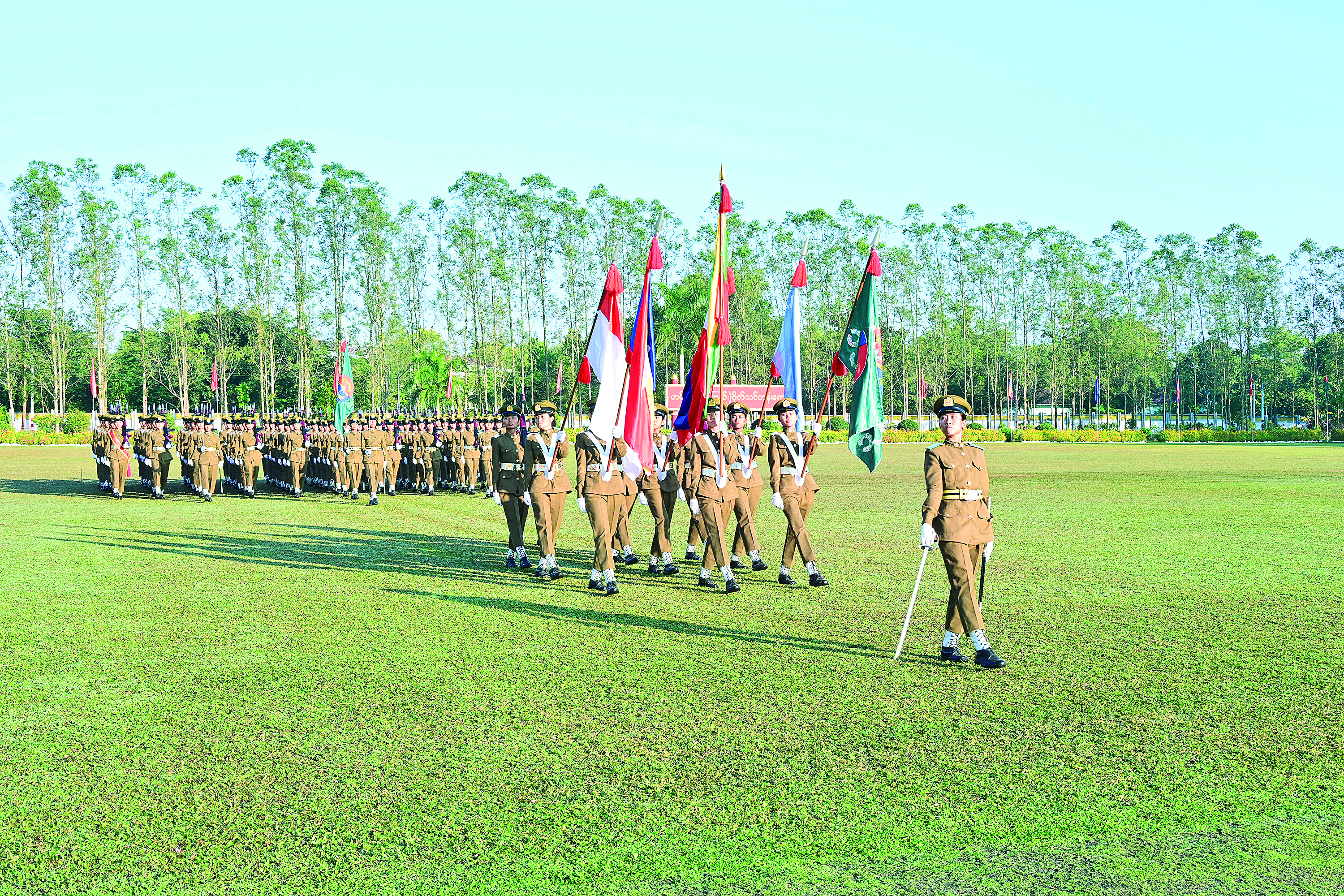 ထို့နောက် ကျောင်းဆင်းဗိုလ်လောင်းတပ်ခွဲက နိုင်ငံတော်လုံခြုံရေးနှင့် အေးချမ်း သာယာရေးကော်မရှင်ဥက္ကဋ္ဌ တပ်မတော်ကာကွယ် ရေးဦးစီးချုပ် ဗိုလ်ချုပ်မှူးကြီး သတိုးမဟာသရေစည်သူ သတိုးသီရိသုဓမ္မမင်းအောင်လှိုင်အား အနှေးလျှောက်၊ အမြန် လျှောက်ဖြင့် ချီတက်အလေးပြုသည်။