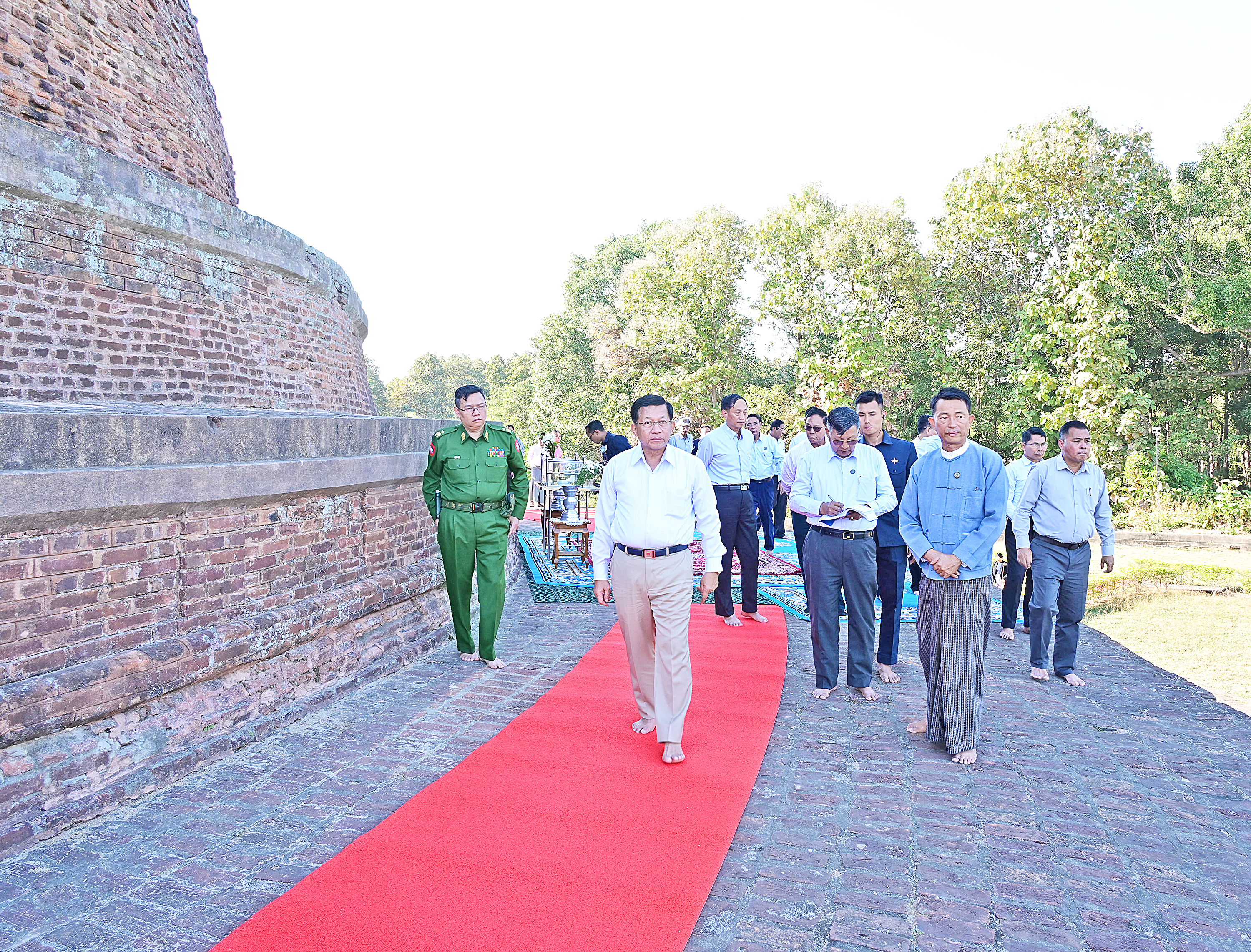 ယင်းနောက် နိုင်ငံတော်ယာယီသမ္မတ နိုင်ငံတော်လုံခြုံရေးနှင့် အေးချမ်းသာယာ ရေးကော်မရှင်ဥက္ကဋ္ဌ နှင့်အဖွဲ့ဝင်များသည် ပြည်မြို့၊ မှော်ဇာကျေးရွာအုပ်စု၊ သရေ ခေတ္တရာ ပျူမြို့ဟောင်းအတွင်းရှိ မန္တလေးငလျင်ကြီးကြောင့် ထိခိုက်ပြိုကျ ပျက်စီးခဲ့ သည့် လက်သည်းရေကန်ကျောင်းတိုက်(ခ)သုံးပန်လှကျောင်းဝင်းအတွင်းရှိ နှစ်ထပ် အုတ်တိုက်အား ရှေးမူလက်ရာမပျက် ပြန်လည်ပြုပြင်မွမ်းမံထားရှိမှုအား သွားရောက် ကြည့်ရှုစစ်ဆေးပြီး တာဝန်ရှိသူများ၏ တင်ပြချက်များအပေါ် လိုအပ်သည်များ လမ်းညွှန်မှာကြားခဲ့သည်။