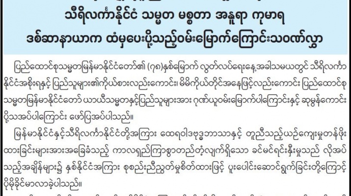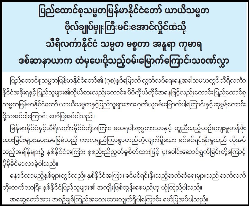 ပြည်ထောင်စုသမ္မတမြန်မာနိုင်ငံတော်၏ (၇၈)နှစ်မြောက် လွတ်လပ်ရေးနေ့အခါသမယတွင် သီရိလင်္ကာ နိုင်ငံအစိုးရနှင့် ပြည်သူများ၏ကိုယ်စားလည်းကောင်း၊ မိမိကိုယ်တိုင်အနေဖြင့်လည်းကောင်း ပြည်ထောင်စု သမ္မတမြန်မာနိုင်ငံတော် ယာယီသမ္မတနှင့်ပြည်သူများအား ဂုဏ်ယူဝမ်းမြောက်ပါကြောင်းနှင့် ဆုမွန်ကောင်း ပို့သအပ်ပါကြောင်း ဖော်ပြအပ်ပါသည်။