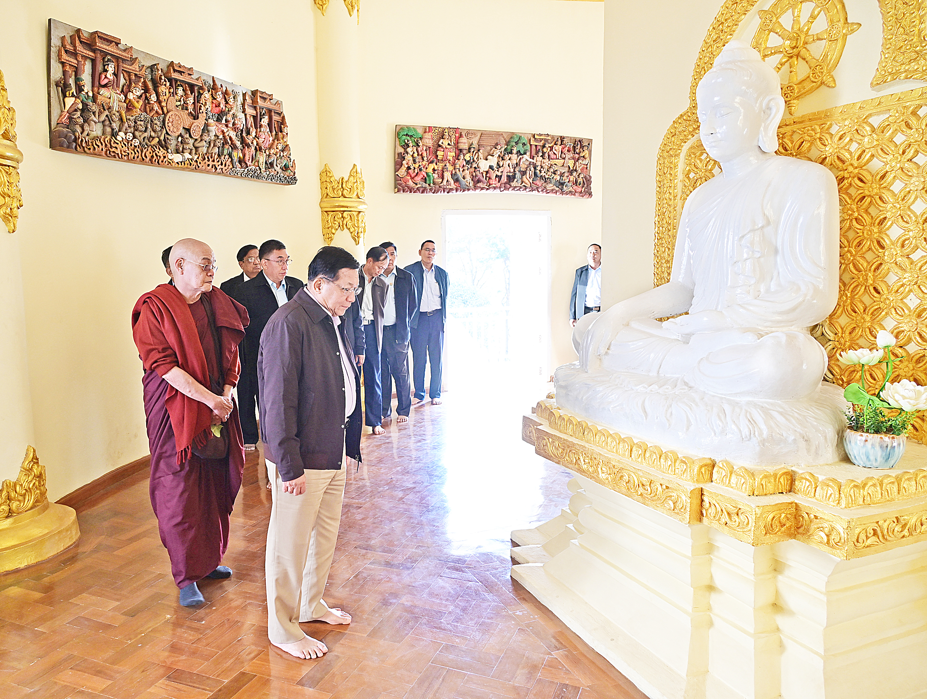 ထို့နောက် နိုင်ငံတော်ယာယီသမ္မတ နိုင်ငံတော်လုံခြုံရေးနှင့် အေးချမ်းသာယာရေးကော်မရှင်ဥက္ကဋ္ဌနှင့်အဖွဲ့ဝင်များသည် ညပိုင်းတွင် ကျိုင်းတုံမြို့ကျက်သရေဆောင် မဟာမြတ်မုနိဘုရားကြီးသို့ သွားရောက်ဖူးမြော်ကြရာ ဂေါပကအဖွဲ့ဝင်များက ကြိုဆို နှုတ်ဆက်ကြသည်။ ယင်းနောက် နိုင်ငံတော်ယာယီသမ္မတ နိုင်ငံတော်လုံခြုံရေးနှင့် အေးချမ်းသာယာ ရေးကော်မရှင်ဥက္ကဋ္ဌက ဘုရားကြီးအား သောက်တော်ရေချမ်းနှင့် ပန်းမန်၊ ဆီမီး တို့ကိုကပ်လှူပူဇော်ပြီး ဖူးမြော်ကြည်ညိုသည်။