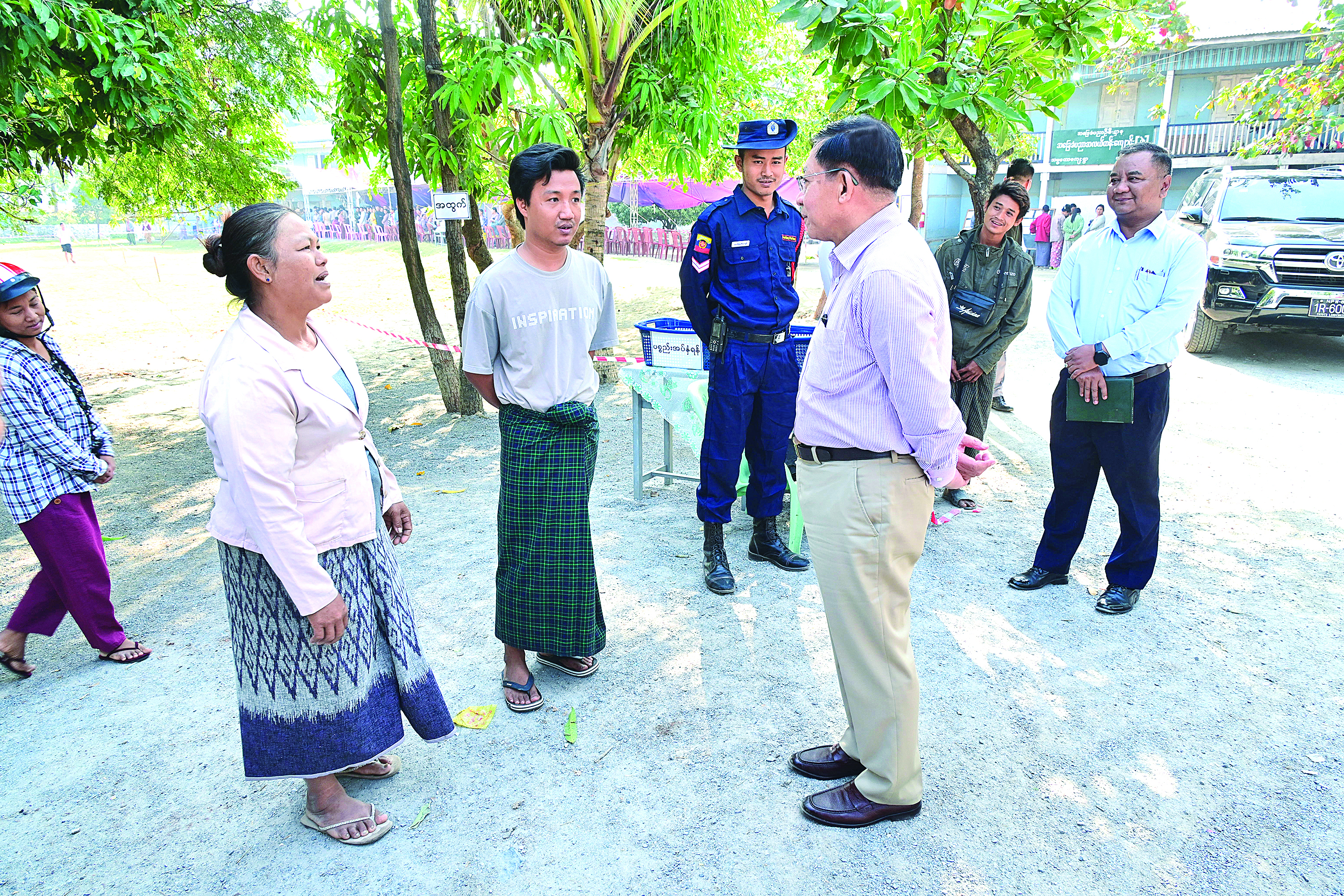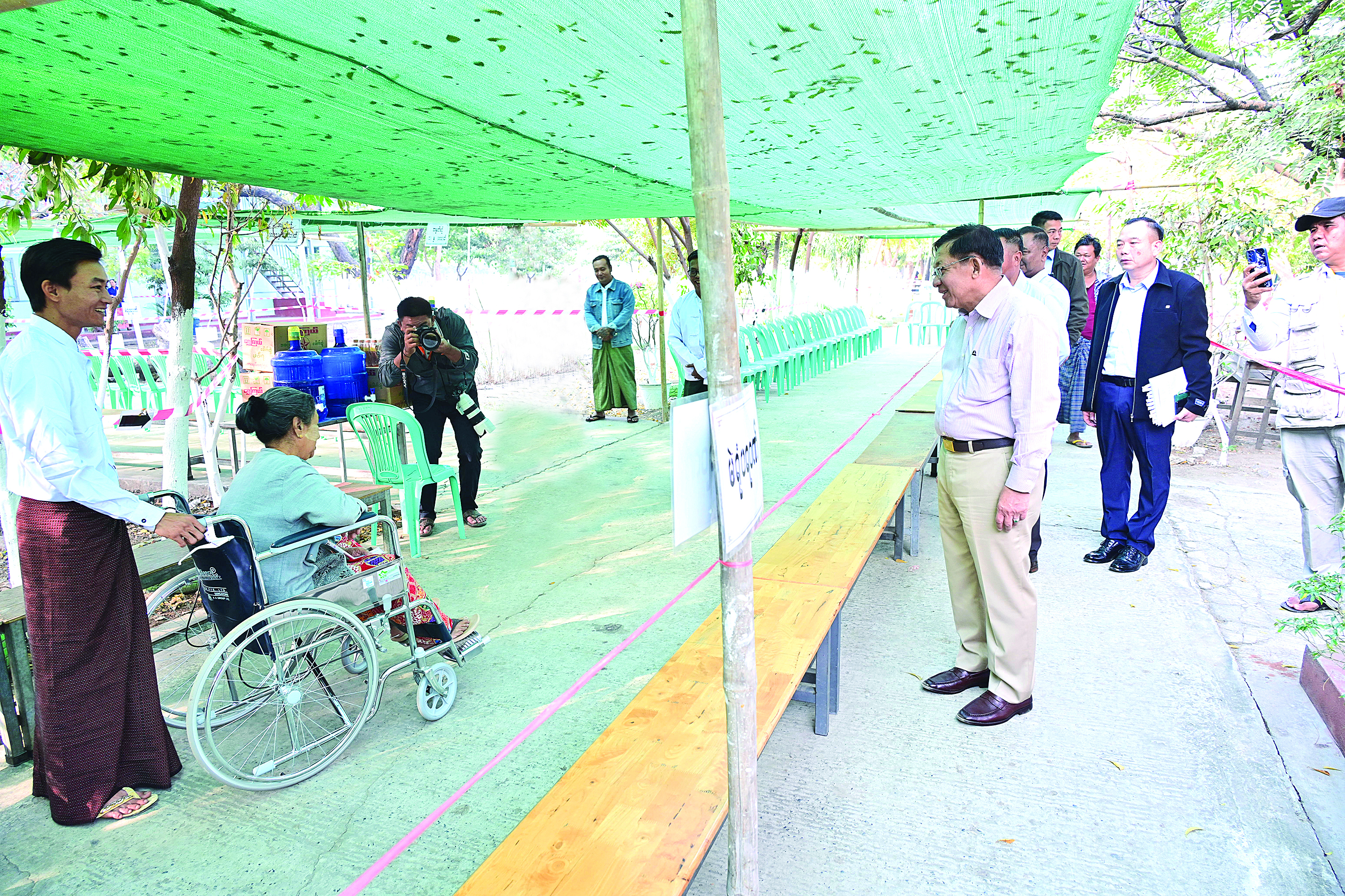 ထိုသို့ကြည့်ရှုအားပေးရာတွင် နိုင်ငံတော်ယာယီသမ္မတ နိုင်ငံတော်လုံခြုံရေးနှင့် အေးချမ်းသာယာရေး ကော်မရှင်ဥက္ကဋ္ဌသည် ချမ်းမြသာစည်မြို့နယ်၊ ပုသိမ်ကြီးမြို့နယ်တို့အတွင်းရှိ သက်ဆိုင်ရာ မဲရုံများအလိုက်တွင် မဲရုံမှတာဝန်ရှိသူများ၏ ကွန်ပျူတာစနစ်ဖြင့် မဲစာရင်းများ တိုက် ဆိုင်စစ်ဆေးပေးလျက်ရှိမှုနှင့် မဲဆန္ဒရှင်ပြည်သူများ၏ တက်ကြွစွာပါဝင် ဆန္ဒမဲပေးနေမှုများကို လိုက်လံကြည့်ရှုပြီး မဲဆန္ဒရှင်ပြည်သူများအား ဆန္ဒမဲပေးမှုနှင့် ပတ်သက်၍ ကြုံ တွေ့ရမှုများ၊ MEVM စက်ဖြင့် ဆန္ဒမဲပေးရာတွင် တွေ့ကြုံရမှုများ၊ မဲရုံဝန်ထမ်းများ၏ တာဝန်ထမ်းဆောင်နေမှုအခြေအနေများနှင့် ပတ်သက်၍ ရင်းရင်းနှီးနှီး မေးမြန်း ဆွေးနွေးခဲ့ပြီး မဲဆန္ဒရှင်ပြည်သူများအား နှုတ်ဆက်ခဲ့သည်။