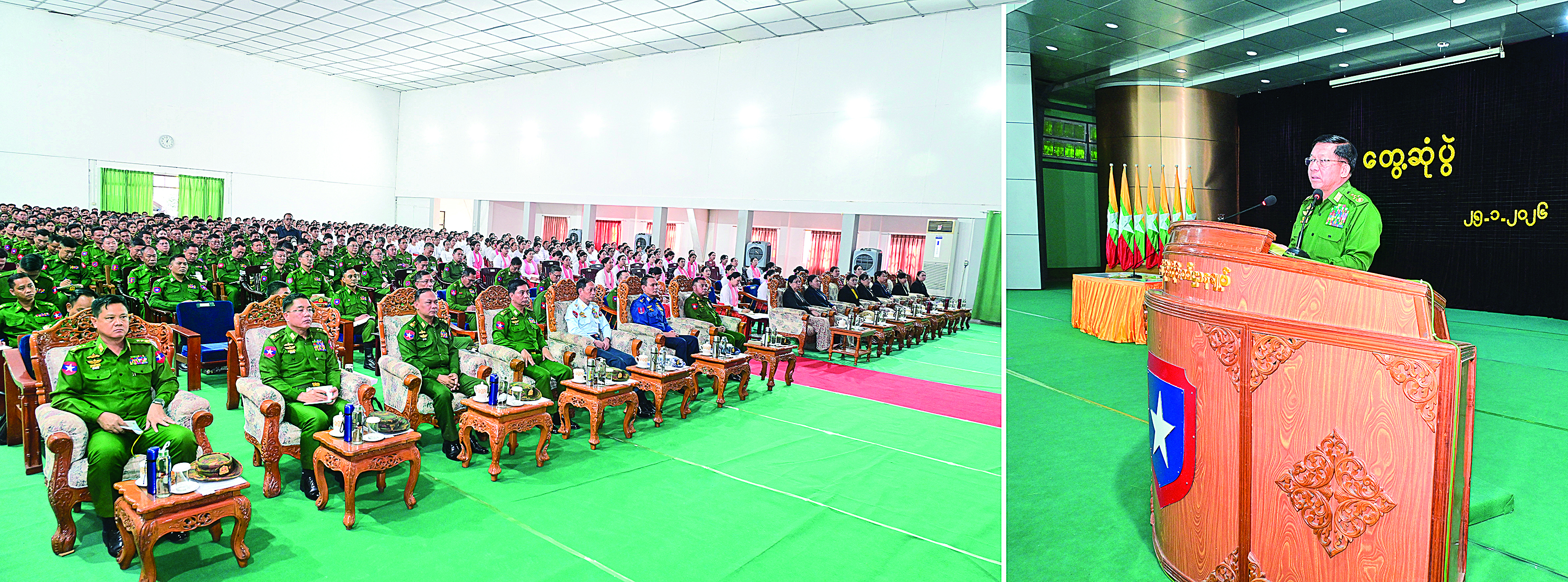 လက်ရှိအချိန်တွင် တပ်မတော်၌ အမျိုးသမီးစစ်မှုထမ်းများသည်လည်း အမျိုးသားများနှင့်ရင်ပေါင်တန်း၍ နိုင်ငံတော်ကာကွယ်ရေးနှင့် လုံခြုံရေးတာဝန်များကို ထမ်းဆောင်နေပြီဖြစ်ကြောင်း၊ ၂၀၂၄ခုနှစ်တွင် ကောက်ယူခဲ့သည့်လူဦးရေနှင့်အိမ်အကြောင်းအရာသန်းခေါင်စာရင်းအချက်အလက်များအရ မိမိတို့နိုင်ငံတွင် အမျိုးသမီးဦးရေမှာ ပိုမိုများပြားသည်ကို တွေ့ရှိရကြောင်း၊ သို့ဖြစ်၍နိုင်ငံတော်တွင် အမျိုးသမီးများ၏လုပ်အားမှာ မနည်းသည်ကို တွေ့မြင်နိုင်ကြောင်း၊ တပ်မတော်သားမိသားစုဝင် မှီခိုသူမိသားစုများ အချင်းချင်းအနေဖြင့် ညီရင်းအကို၊ မောင်ရင်းနှမ စိတ်ဓာတ်မွေး၍ စည်းလုံးညီညွတ်စွာဖြင့်နေထိုင်ဆောင်ရွက်ကြရန်လိုကြောင်း၊ စစ်သည်အင်အားနှင့် ရဲမေအင်အားများပူးပေါင်းဆောင်ရွက်မည်ဆိုပါက နိုင်ငံတော်၏ ကာကွယ်ရေးအင်အားစုမှာများစွာတောင့်တင်းခိုင်မာသည်ကိုတွေ့မြင်ရမည်ဖြစ်ပြီး စုစည်းညီညွတ်သည့်အားကို တန်ဖိုး ထား ဆောင်ရွက်ကြရန်လိုကြောင်း။