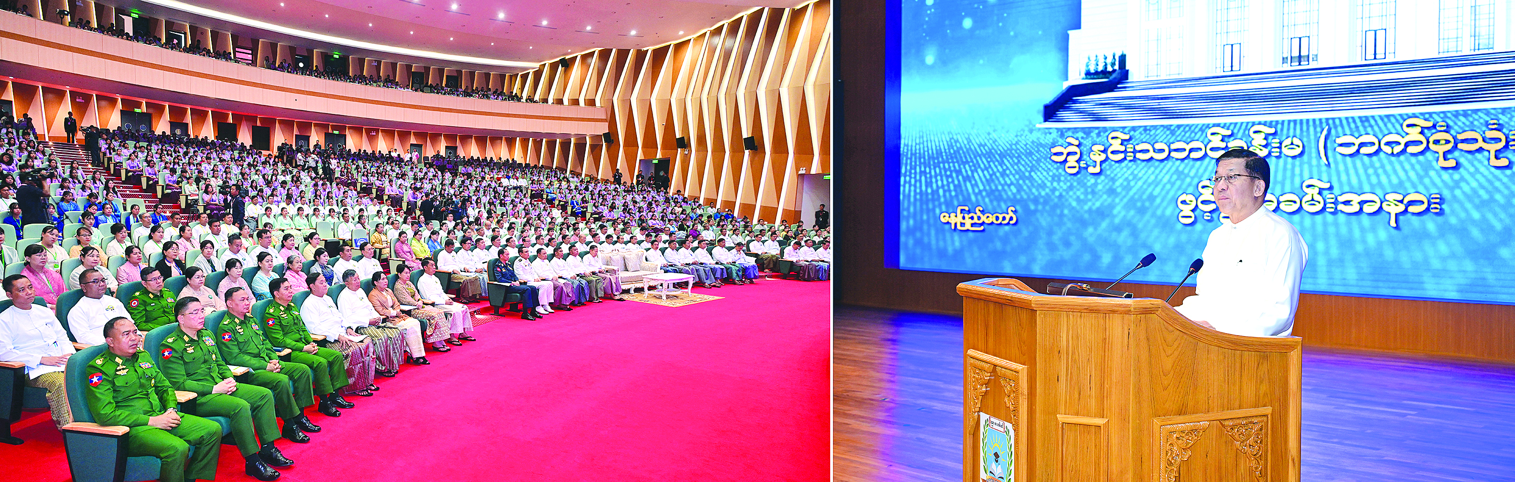 နေပြည်တော်ကောင်စီနယ်မြေ၊ ဇမ္ဗူသီရိမြို့နယ်ရှိ Naypyitaw State Academy (ဘွဲ့နှင်းသဘင်ခန်းမ)ဘက်စုံသုံးခန်းမဖွင့်ပွဲအခမ်းအနားကို ယနေ့နံနက်ပိုင်းတွင်ကျင်းပပြုလုပ်ရာ ပြည်ထောင်စုသမ္မတမြန်မာနိုင်ငံတော် ယာယီသမ္မတ နိုင်ငံတော်လုံခြုံရေးနှင့် အေးချမ်းသာယာရေးကော်မရှင်ဥက္ကဋ္ဌ ဗိုလ်ချုပ်မှူးကြီးမင်းအောင်လှိုင် တက်ရောက်ဖွင့်လှစ်ပေးပြီး အမှာစကားပြောကြားသည်။