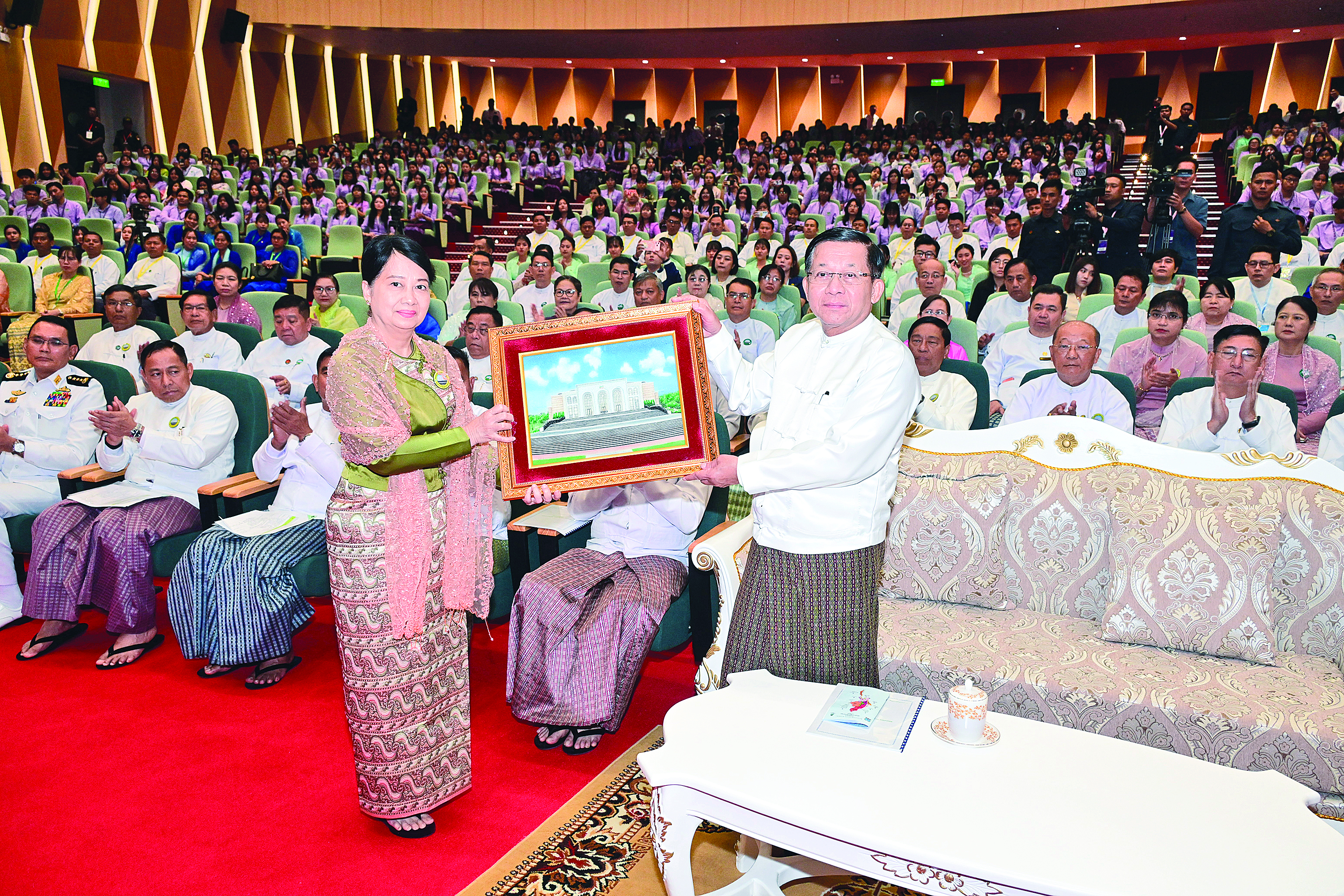 ၎င်းနောက် နိုင်ငံတော်ယာယီသမ္မတ နိုင်ငံတော်လုံခြုံရေးနှင့် အေးချမ်းသာယာ ရေးကော်မရှင်ဥက္ကဋ္ဌထံ ပညာရေးဝန်ကြီးဌာန ပြည်ထောင်စုဝန်ကြီး က Naypyitaw State Academy ဘွဲ့နှင်းသဘင်ခန်းမ(ဘက်စုံသုံးခန်းမ) ဖွင့်ပွဲအထိမ်းအမှတ် လက်ဆောင်ပစ္စည်းကို ပေးအပ်သည်။