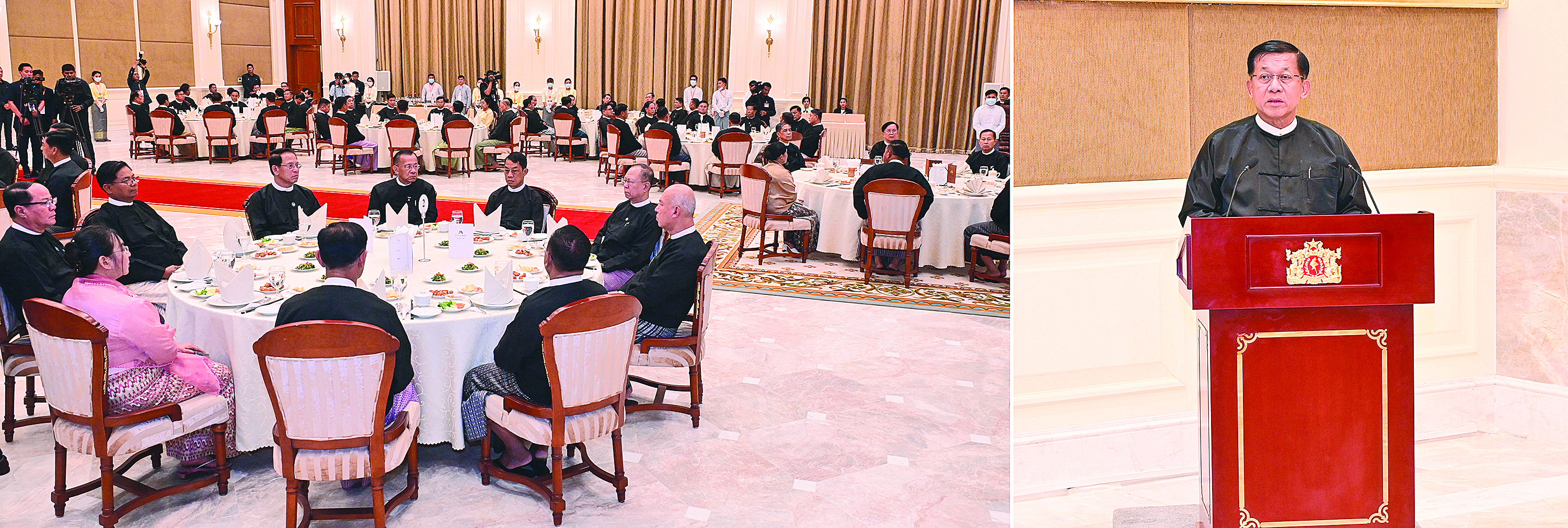 ယင်းနောက် နိုင်ငံတော်ယာယီသမ္မတ နိုင်ငံတော်လုံခြုံရေးနှင့် အေးချမ်းသာယာ ရေးကော်မရှင်ဥက္ကဋ္ဌနှင့် အခမ်းအနားသို့တက်ရောက်လာကြသူများသည် ဂုဏ်ပြုညစာကို အတူတကွသုံးဆောင်ကြခဲ့ကြသည်။