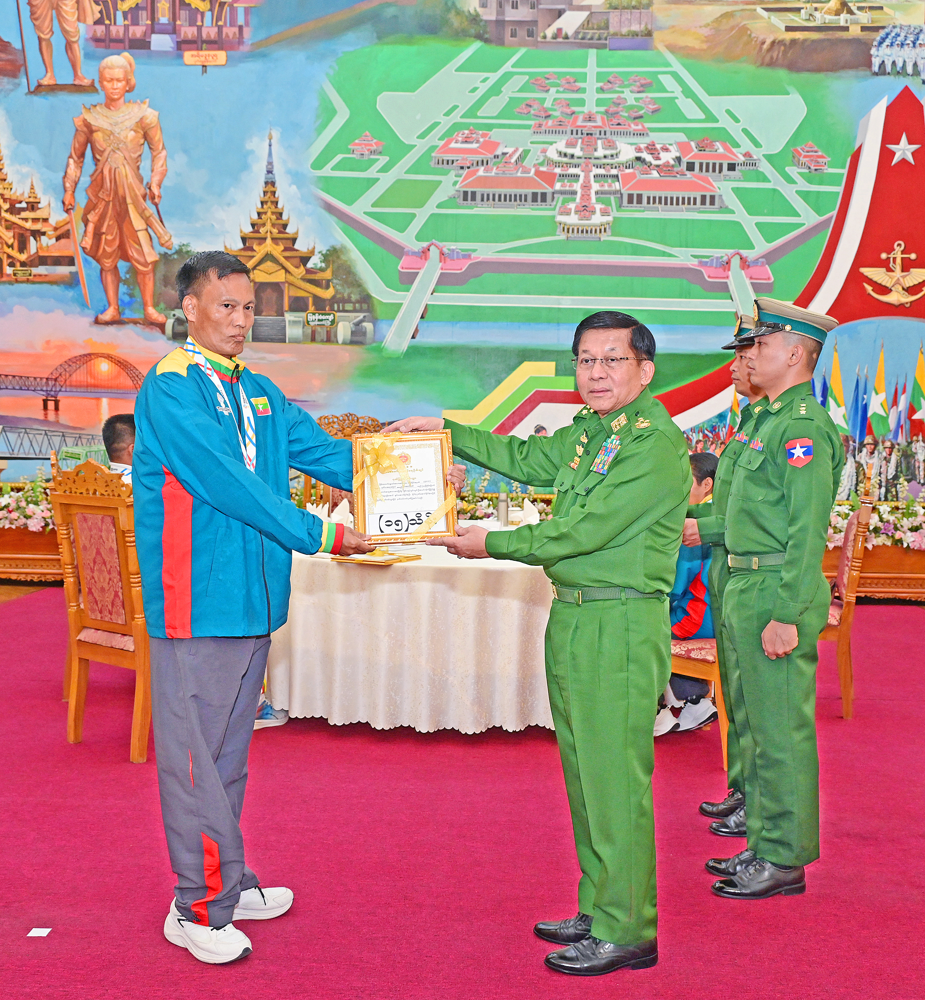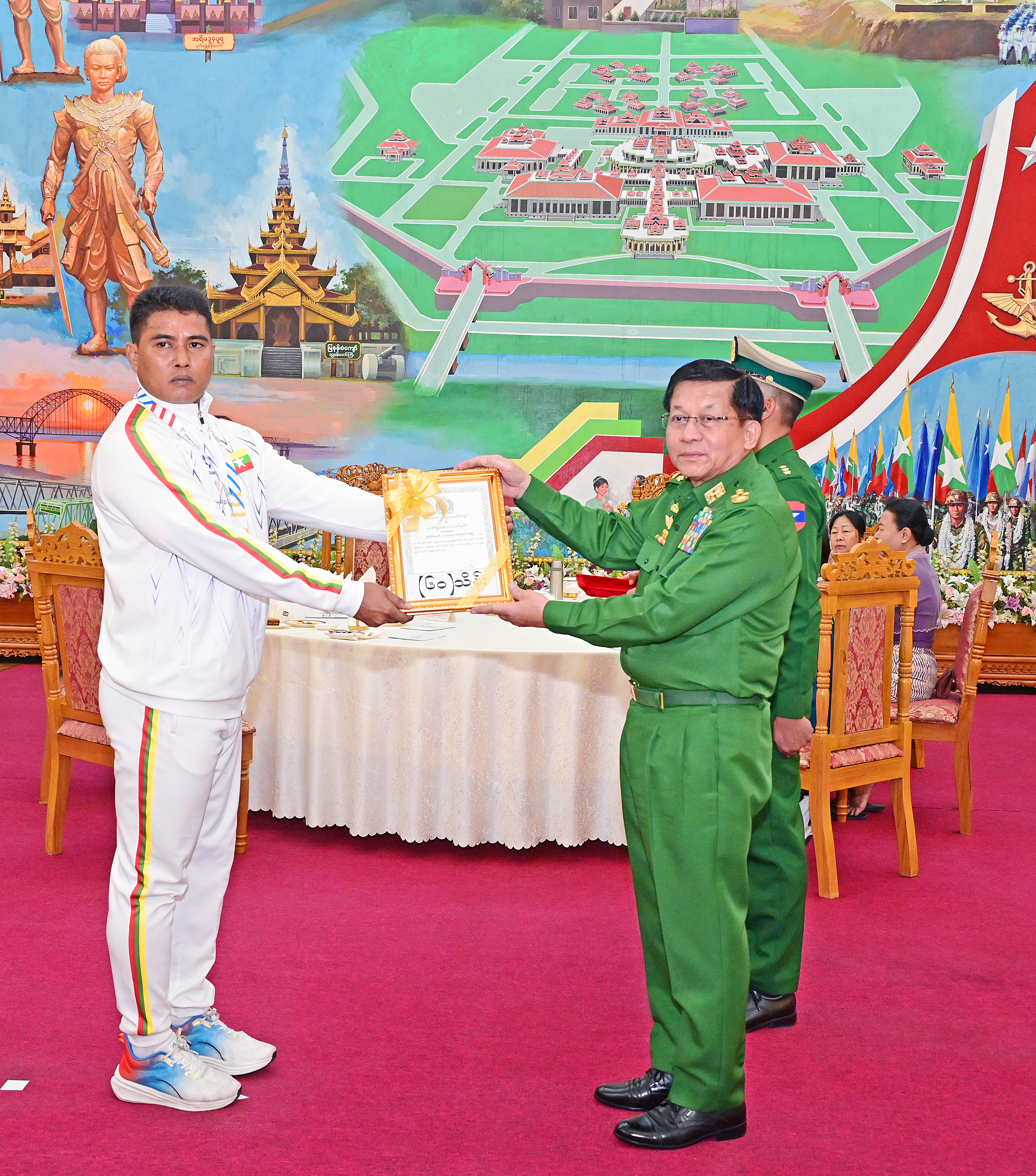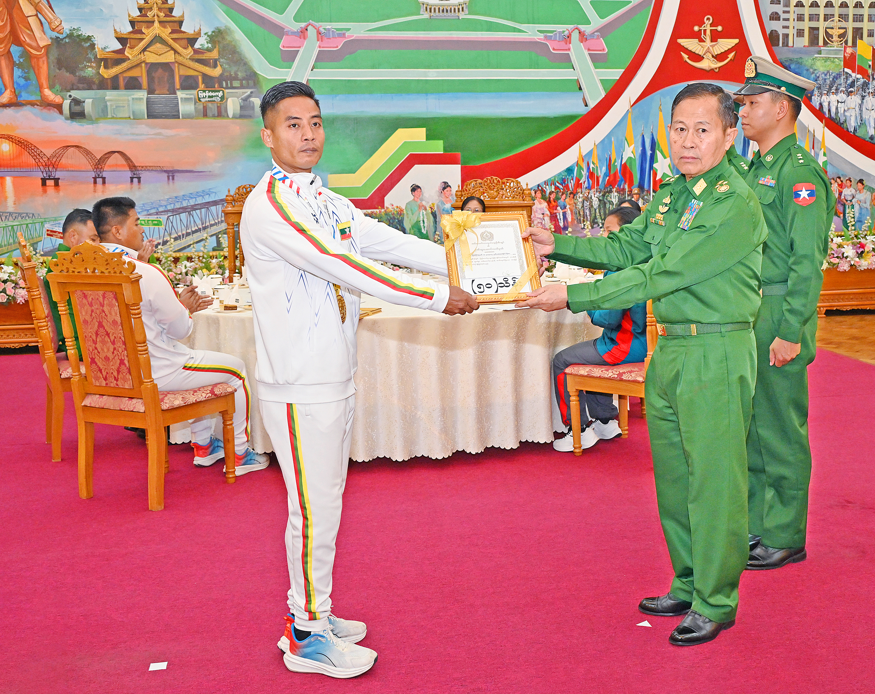 ထို့နောက် (၁၉)ကြိမ်မြောက် အာရှအားကစားပြိုင်ပွဲ၊ (၃၃) ကြိမ်မြောက် အရှေ့ တောင်အာရှအားကစားပြိုင်ပွဲနှင့်(၁၃)ကြိမ်မြောက် အာဆီယံမသန်စွမ်းအားကစား ပြိုင်ပွဲတို့တွင် ဆုတံဆိပ်များရယူဆွတ်ခူးပေးခဲ့ကြသည့် တပ်မတော်သားအားကစား သမားများနှင့်နည်းပြများအား ဂုဏ်ပြုဆုများချီးမြှင့်ခြင်းအခမ်းအနားကို ကျင်းပပြုလုပ်ရာ နိုင်ငံတော်လုံခြုံရေးနှင့်အေးချမ်းသာယာရေးကော်မရှင်ဥက္ကဋ္ဌ တပ်မတော် ကာကွယ်ရေးဦးစီးချုပ်က(၁၉) ကြိမ်မြောက်အာရှအားကစားပြိုင်ပွဲတွင် ပိုက်ကျော်ခြင်း (အသင်းလိုက်)ပြိုင်ပွဲ၌ ရွှေတံဆိပ်ဆုရရှိခဲ့သည့် အရာခံဗိုလ်သန့်ဇင်ဦး၊ (၁၃) ကြိမ်မြောက် အာဆီယံမသန်စွမ်းအားကစား ပြိုင်ပွဲတွင် ပြေးခုန်ပစ်(လှံတံပစ်) (တစ်ဦးချင်း) ပြိုင်ပွဲနှင့် (သံလုံးပစ်)(တစ်ဦးချင်း)ပြိုင်ပွဲတို့၌ ရွှေတံဆိပ်ဆုများရရှိခဲ့သည့် အရာခံဗိုလ်တင်ညို၊ (၃၃)ကြိမ်မြောက် အရှေ့တောင်အာရှအားကစားပြိုင်ပွဲတွင် ခြင်းလုံး(ကွင်းသွင်း)(အသင်းလိုက်)ပြိုင်ပွဲ၌ ငွေတံဆိပ်ဆုရရှိခဲ့သည့် ဒုတိယအရာခံဗိုလ် အောင်ဇော်၊ တပ်ကြပ်/၁၃ ကျော်ဇေယျာဝင်း၊ ဒုတိယတပ်ကြပ်စိုးပိုင်ဦး၊ (၁၃) ကြိမ်မြောက် အာဆီယံမသန်စွမ်းအားကစားပြိုင်ပွဲတွင် ပြေးခုန်ပစ်အားကစားနည်း၌ ရွှေတံဆိပ်ဆု၊ ငွေတံဆိပ်ဆုနှင့် ကြေးတံဆိပ်ဆုများရရှိအောင်နည်းပြပေးနိုင်ခဲ့သည့် ဒုတိယအရာခံဗိုလ်သက်ဝင်းတို့အား တပ်မတော်ကာကွယ်ရေး ဦးစီးချုပ်၏ ဂုဏ်ထူးဆောင်လက်မှတ်၊ ဂုဏ်ပြုမှတ်တမ်းလွှာနှင့်ဂုဏ်ပြုချီးမြှင့်ငွေများကို တစ်ဦးချင်းပေးအပ်ချီးမြှင့်သည်။ယင်းနောက် ကော်မရှင်ဒုတိယဥက္ကဋ္ဌ ဒုတိယတပ်မတော်ကာကွယ်ရေးဦးစီးချုပ်ကာကွယ်ရေးဦးစီးချုပ်(ကြည်း) ဒုတိယဗိုလ်ချုပ်မှူးကြီးစိုးဝင်းက(၁၃)ကြိမ်မြောက် အာဆီယံမသန်စွမ်းအားကစားပြိုင်ပွဲ၊ ပြေးခုန်ပစ်(မီတာ ၂၀၀)(တစ်ဦးချင်း) ပြိုင်ပွဲတွင် ရွှေတံဆိပ်ဆု၊ ပြေးခုန်ပစ်(မီတာ ၁၀၀)(တစ်ဦးချင်း)ပြိုင်ပွဲတွင် ငွေတံဆိပ်ဆု တို့ရရှိခဲ့သည့်ဒုတိယအရာခံဗိုလ်စိုးပေ၊ ပြေးခုန်ပစ်(သံလုံးပစ်)(တစ်ဦးချင်း)ပြိုင်ပွဲတွင် ရွှေတံဆိပ်ဆုနှင့် ငွေတံဆိပ်ဆုရရှိခဲ့သည့် တပ်ကြပ်ကြီးရဲမင်းစိုး၊(၃၃)ကြိမ်မြောက် အရှေ့တောင်အာရှအားကစားပြိုင်ပွဲတွင် နပန်း(တစ်ဦးချင်း)ပြိုင်ပွဲ၌ ကြေးတံဆိပ်ဆုရရှိခဲ့သည့် အရပ်သားအစားခန့်ဝန်ထမ်း မသဲသိမ့်သိမ့်သူ၊ (၁၃)ကြိမ်မြောက် အာဆီယံမသန်စွမ်းအားကစားပြိုင်ပွဲတွင် ပြေးခုန်ပစ်အားကစားနည်း၌ ရွှေတံဆိပ်ဆု၊ ငွေတံဆိပ်ဆုနှင့်ကြေးတံဆိပ်ဆုများရရှိအောင်နည်းပြပေးနိုင်ခဲ့သည့်အုပ်ခွဲတပ်ကြပ်ကြီး/၅၂ အောင်သူထွန်းတို့အား တပ်မတော်ကာကွယ်ရေး ဦးစီးချုပ်၏ ဂုဏ်ထူးဆောင်လက်မှတ်၊ ဂုဏ်ပြုမှတ်တမ်းလွှာနှင့် ဂုဏ်ပြုချီးမြှင့်ငွေများက