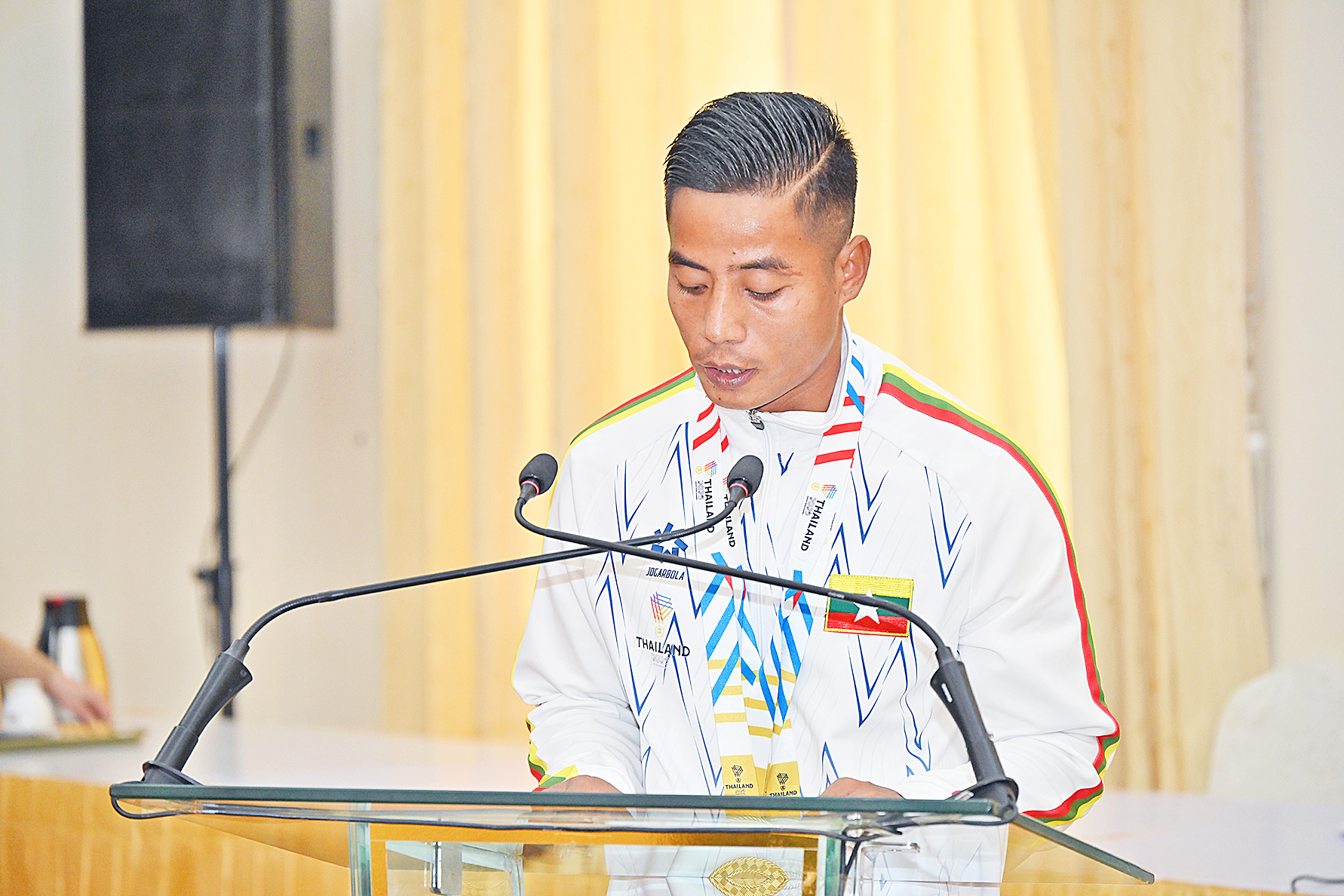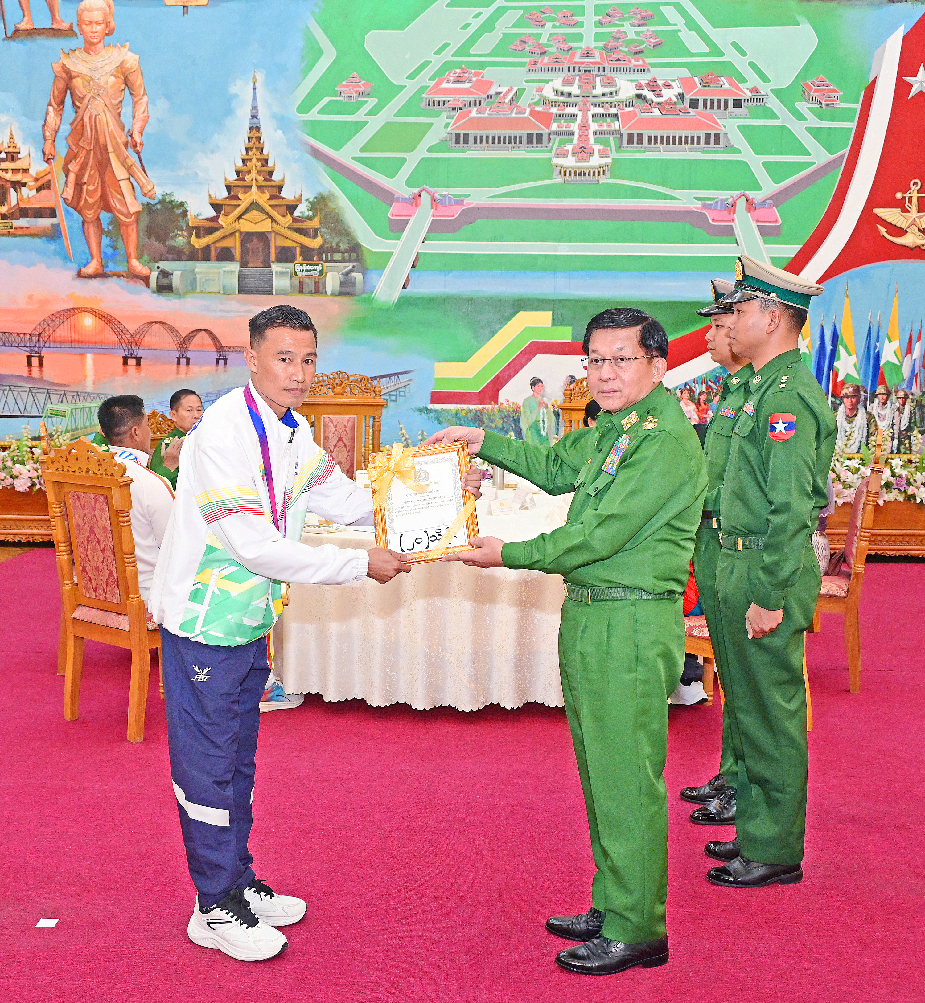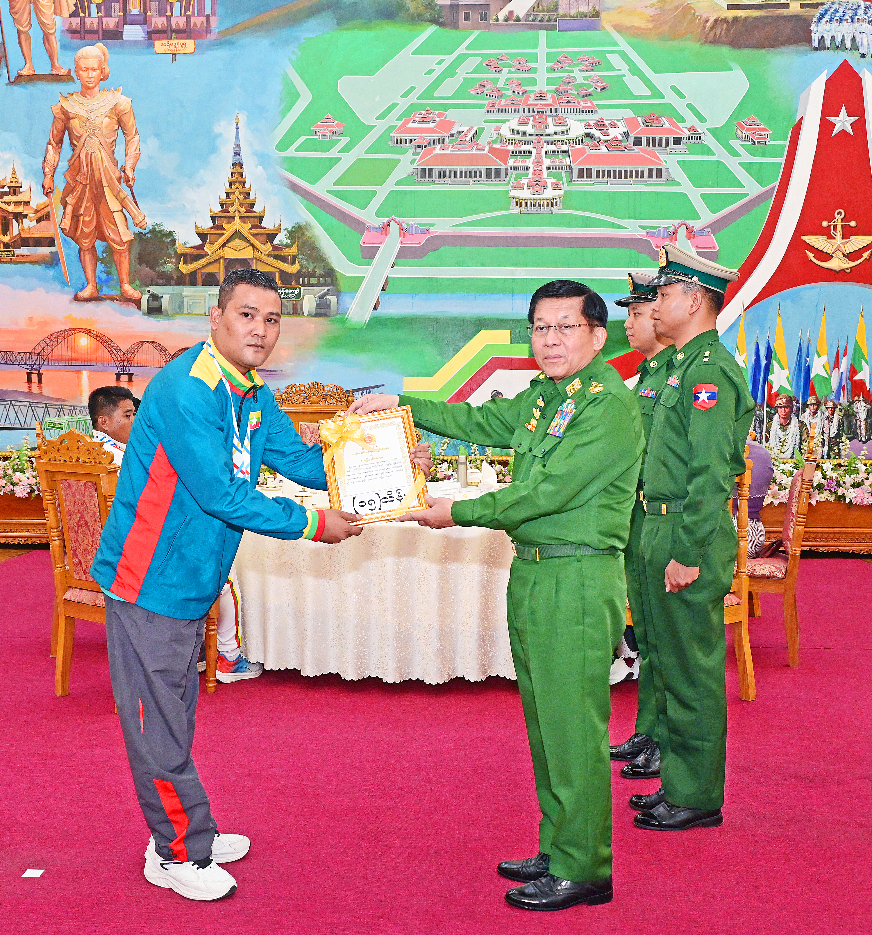 ထို့နောက် (၁၉)ကြိမ်မြောက် အာရှအားကစားပြိုင်ပွဲ၊ (၃၃) ကြိမ်မြောက် အရှေ့ တောင်အာရှအားကစားပြိုင်ပွဲနှင့်(၁၃)ကြိမ်မြောက် အာဆီယံမသန်စွမ်းအားကစား ပြိုင်ပွဲတို့တွင် ဆုတံဆိပ်များရယူဆွတ်ခူးပေးခဲ့ကြသည့် တပ်မတော်သားအားကစား သမားများနှင့်နည်းပြများအား ဂုဏ်ပြုဆုများချီးမြှင့်ခြင်းအခမ်းအနားကို ကျင်းပပြုလုပ်ရာ နိုင်ငံတော်လုံခြုံရေးနှင့်အေးချမ်းသာယာရေးကော်မရှင်ဥက္ကဋ္ဌ တပ်မတော် ကာကွယ်ရေးဦးစီးချုပ်က(၁၉) ကြိမ်မြောက်အာရှအားကစားပြိုင်ပွဲတွင် ပိုက်ကျော်ခြင်း (အသင်းလိုက်)ပြိုင်ပွဲ၌ ရွှေတံဆိပ်ဆုရရှိခဲ့သည့် အရာခံဗိုလ်သန့်ဇင်ဦး၊ (၁၃) ကြိမ်မြောက် အာဆီယံမသန်စွမ်းအားကစား ပြိုင်ပွဲတွင် ပြေးခုန်ပစ်(လှံတံပစ်) (တစ်ဦးချင်း) ပြိုင်ပွဲနှင့် (သံလုံးပစ်)(တစ်ဦးချင်း)ပြိုင်ပွဲတို့၌ ရွှေတံဆိပ်ဆုများရရှိခဲ့သည့် အရာခံဗိုလ်တင်ညို၊ (၃၃)ကြိမ်မြောက် အရှေ့တောင်အာရှအားကစားပြိုင်ပွဲတွင် ခြင်းလုံး(ကွင်းသွင်း)(အသင်းလိုက်)ပြိုင်ပွဲ၌ ငွေတံဆိပ်ဆုရရှိခဲ့သည့် ဒုတိယအရာခံဗိုလ် အောင်ဇော်၊ တပ်ကြပ်/၁၃ ကျော်ဇေယျာဝင်း၊ ဒုတိယတပ်ကြပ်စိုးပိုင်ဦး၊ (၁၃) ကြိမ်မြောက် အာဆီယံမသန်စွမ်းအားကစားပြိုင်ပွဲတွင် ပြေးခုန်ပစ်အားကစားနည်း၌ ရွှေတံဆိပ်ဆု၊ ငွေတံဆိပ်ဆုနှင့် ကြေးတံဆိပ်ဆုများရရှိအောင်နည်းပြပေးနိုင်ခဲ့သည့် ဒုတိယအရာခံဗိုလ်သက်ဝင်းတို့အား တပ်မတော်ကာကွယ်ရေး ဦးစီးချုပ်၏ ဂုဏ်ထူးဆောင်လက်မှတ်၊ ဂုဏ်ပြုမှတ်တမ်းလွှာနှင့်ဂုဏ်ပြုချီးမြှင့်ငွေများကို တစ်ဦးချင်းပေးအပ်ချီးမြှင့်သည်။ယင်းနောက် ကော်မရှင်ဒုတိယဥက္ကဋ္ဌ ဒုတိယတပ်မတော်ကာကွယ်ရေးဦးစီးချုပ်ကာကွယ်ရေးဦးစီးချုပ်(ကြည်း) ဒုတိယဗိုလ်ချုပ်မှူးကြီးစိုးဝင်းက(၁၃)ကြိမ်မြောက် အာဆီယံမသန်စွမ်းအားကစားပြိုင်ပွဲ၊ ပြေးခုန်ပစ်(မီတာ ၂၀၀)(တစ်ဦးချင်း) ပြိုင်ပွဲတွင် ရွှေတံဆိပ်ဆု၊ ပြေးခုန်ပစ်(မီတာ ၁၀၀)(တစ်ဦးချင်း)ပြိုင်ပွဲတွင် ငွေတံဆိပ်ဆု တို့ရရှိခဲ့သည့်ဒုတိယအရာခံဗိုလ်စိုးပေ၊ ပြေးခုန်ပစ်(သံလုံးပစ်)(တစ်ဦးချင်း)ပြိုင်ပွဲတွင် ရွှေတံဆိပ်ဆုနှင့် ငွေတံဆိပ်ဆုရရှိခဲ့သည့် တပ်ကြပ်ကြီးရဲမင်းစိုး၊(၃၃)ကြိမ်မြောက် အရှေ့တောင်အာရှအားကစားပြိုင်ပွဲတွင် နပန်း(တစ်ဦးချင်း)ပြိုင်ပွဲ၌ ကြေးတံဆိပ်ဆုရရှိခဲ့သည့် အရပ်သားအစားခန့်ဝန်ထမ်း မသဲသိမ့်သိမ့်သူ၊ (၁၃)ကြိမ်မြောက် အာဆီယံမသန်စွမ်းအားကစားပြိုင်ပွဲတွင် ပြေးခုန်ပစ်အားကစားနည်း၌ ရွှေတံဆိပ်ဆု၊ ငွေတံဆိပ်ဆုနှင့်ကြေးတံဆိပ်ဆုများရရှိအောင်နည်းပြပေးနိုင်ခဲ့သည့်အုပ်ခွဲတပ်ကြပ်ကြီး/၅၂ အောင်သူထွန်းတို့အား တပ်မတော်ကာကွယ်ရေး ဦးစီးချုပ်၏ ဂုဏ်ထူးဆောင်လက်မှတ်၊ ဂုဏ်ပြုမှတ်တမ်းလွှာနှင့် ဂုဏ်ပြုချီးမြှင့်ငွေများက