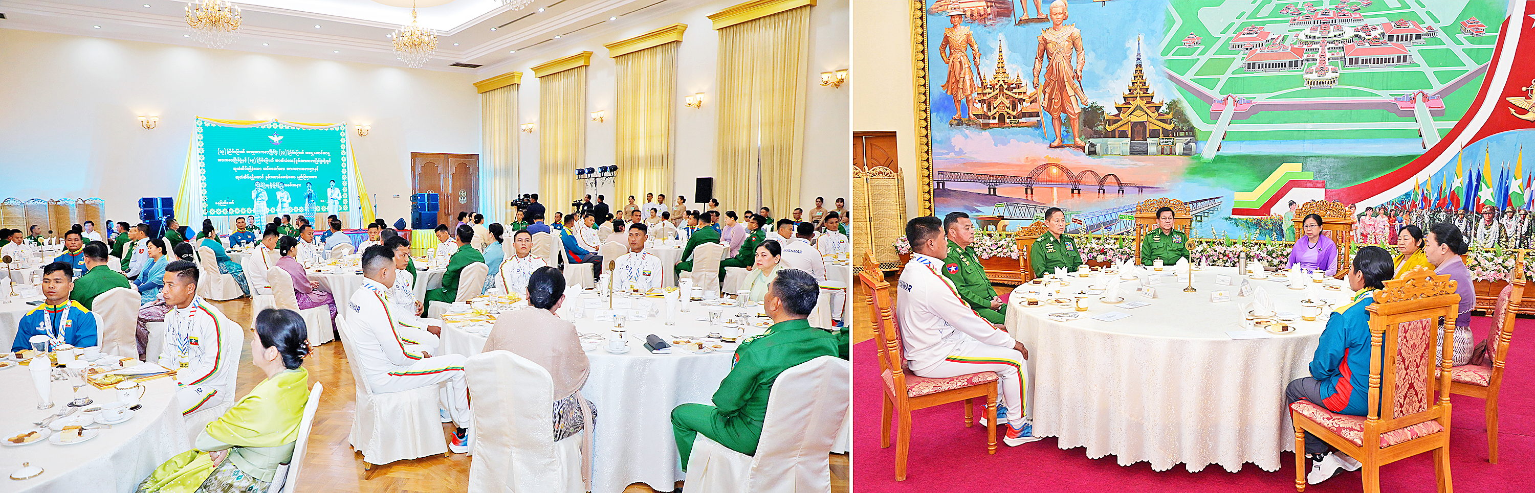 ထို့နောက် နိုင်ငံတော်လုံခြုံရေးနှင့် အေးချမ်းသာယာရေးကော်မရှင်ဥက္ကဋ္ဌ တပ်မတော်ကာကွယ်ရေးဦးစီးချုပ်နှင့် အဖွဲ့ဝင်များသည် နိုင်ငံ့ဂုဏ်ဆောင်တပ်မတော်သား အားကစားသမားများနှင့် နည်းပြများအား လက်ဖက်ရည်ဝိုင်းဖြင့် ဂုဏ်ပြုဧည့်ခံခဲ့ပြီး ကာကွယ်ရေးဦးစီးချုပ်ရုံး(ကြည်း) ပြည်သူ့ဆက်ဆံရေးနှင့် စိတ်ဓာတ်စစ်ဆင်ရေးညွှန်ကြားရေးမှူးရုံး ကွပ်ကဲမှုအောက် မြဝတီတေးဂီတအဖွဲ့မှ အနုပညာရှင်များက ဂုဏ်ပြုတေးသီချင်းများဖြင့် သီဆိုဖျော်ဖြေကြသည်။