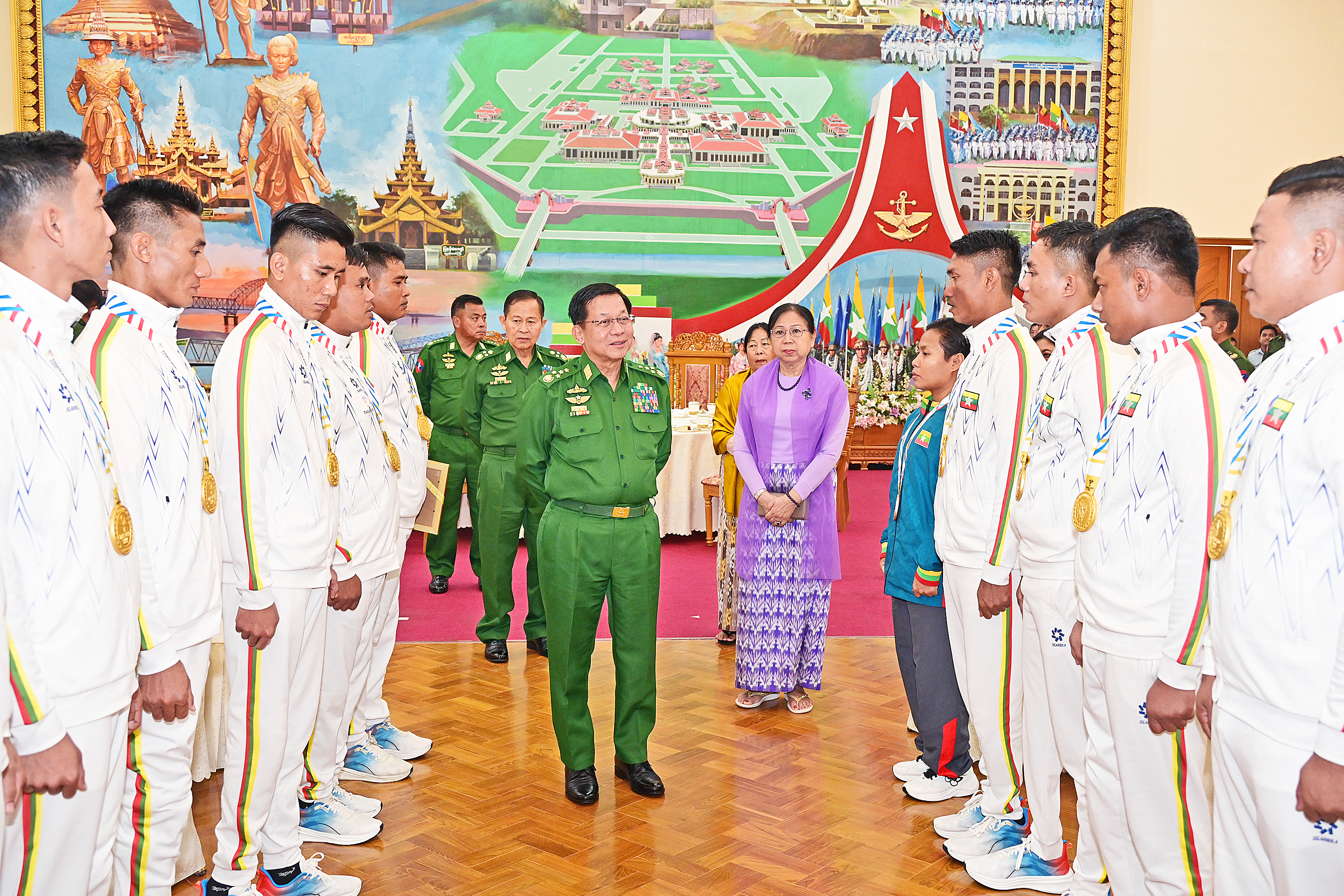(၁၉)ကြိမ်မြောက် အာရှအားကစားပြိုင်ပွဲ၊ (၃၃)ကြိမ်မြောက် အရှေ့တောင်အာရှအားကစားပြိုင်ပွဲနှင့် (၁၃) ကြိမ်မြောက် အာဆီယံမသန်စွမ်းအားကစားပြိုင်ပွဲတို့တွင် ဆုတံဆိပ်များရယူဆွတ်ခူးပေးခဲ့ကြ သည့် တပ်မတော်သားအားကစားသမားများနှင့် နည်းပြများအား ဂုဏ်ပြုဆုများချီးမြှင့်ခြင်းအခမ်းအနား ကို ယနေ့မွန်းလွဲပိုင်းတွင် နေပြည်တော်ရှိ ဘုရင့်နောင်ရိပ်သာဧည့်ခန်းမဆောင်၌ကျင်းပပြုလုပ်ရာ နိုင်ငံတော်လုံခြုံရေးနှင့်အေးချမ်းသာယာရေးကော်မရှင်ဥက္ကဋ္ဌ တပ်မတော်ကာကွယ်ရေးဦးစီးချုပ် ဗိုလ်ချုပ်မှူးကြီးမင်းအောင်လှိုင် တက်ရောက်အမှာစကားပြောကြားပြီး ဂုဏ်ပြုဆုများ ပေးအပ် ချီးမြှင့် သည်။