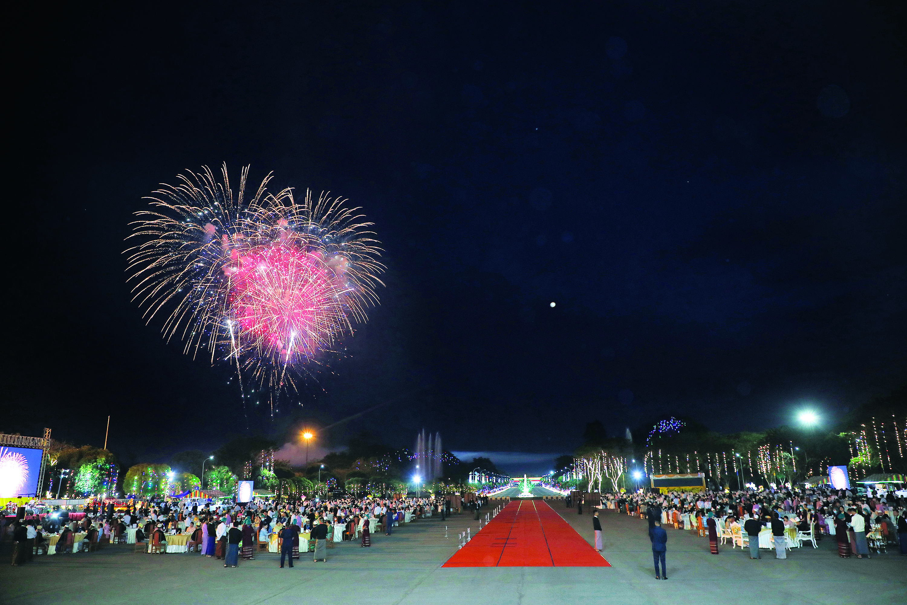 ယင်းနောက် နိုင်ငံတော်ယာယီသမ္မတ နိုင်ငံတော်လုံခြုံရေးနှင့်အေးချမ်းသာယာ ရေးကော်မရှင်ဥက္ကဋ္ဌနှင့်ဇနီးတို့သည် ဂုဏ်ပြု ညစာစားပွဲ အခမ်းအနားသို့တက်ရောက် လာကြသူများနှင့်အတူ ၂၀၂၆ ခုနှစ် (၇၉)နှစ်မြောက် ပြည်ထောင်စုနေ့ကို ဂုဏ်ပြု သောအားဖြင့် မီးရှူးမီးပန်းများပစ်ဖောက်ဂုဏ်ပြုမှုကို ကြည့်ရှုအားပေးကြသည်။