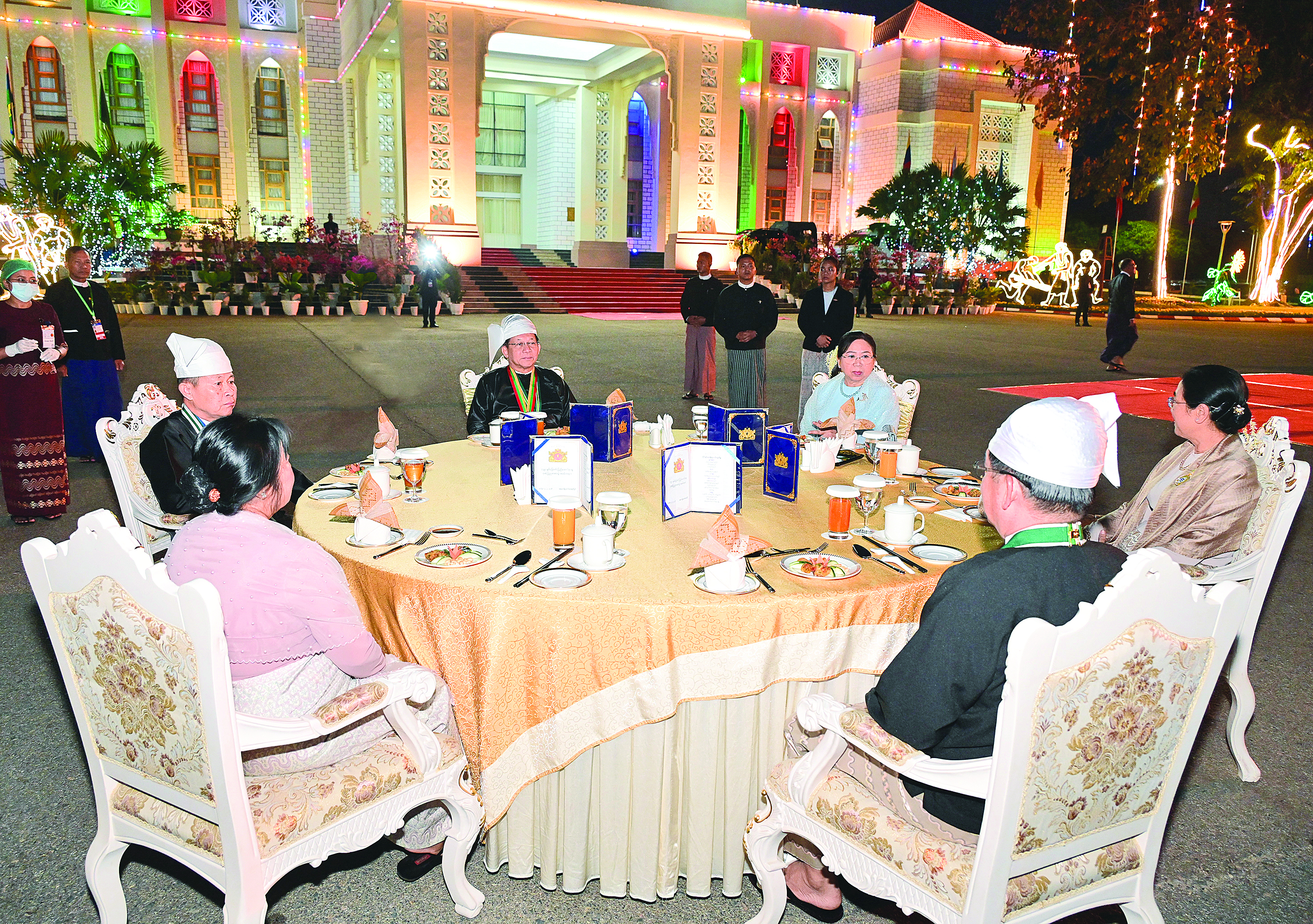 ၎င်းနောက် နိုင်ငံတော်ယာယီသမ္မတ နိုင်ငံတော်လုံခြုံရေးနှင့်အေးချမ်း သာယာရေး ကော်မရှင်ဥက္ကဋ္ဌနှင့်ဇနီးတို့သည် ဂုဏ်ပြု ညစာစားပွဲသို့ တက်ရောက်လာကြသူများနှင့် အတူ ဂုဏ်ပြုညစာကို အတူတကွသုံးဆောင်ကြသည်။