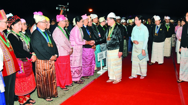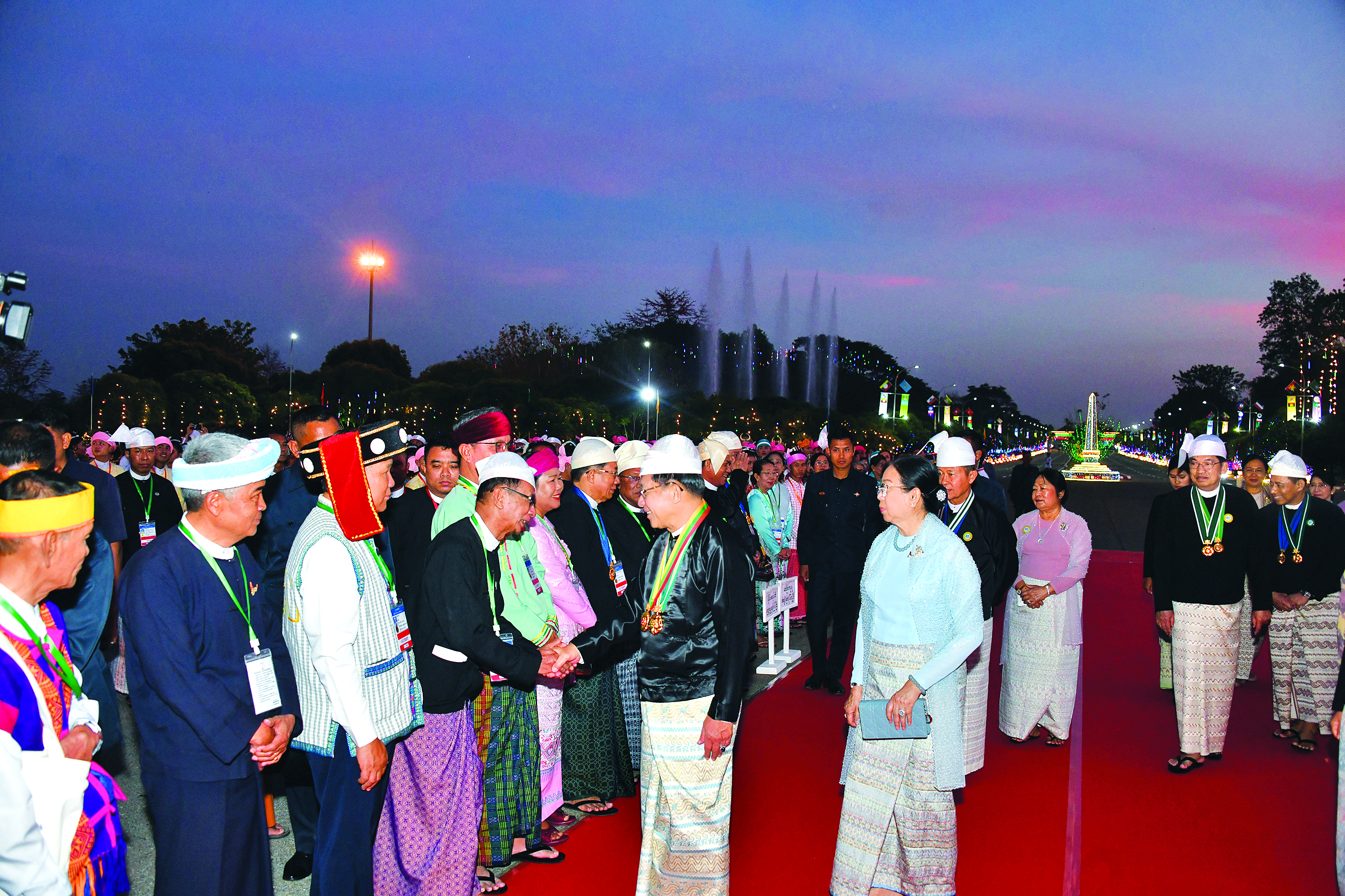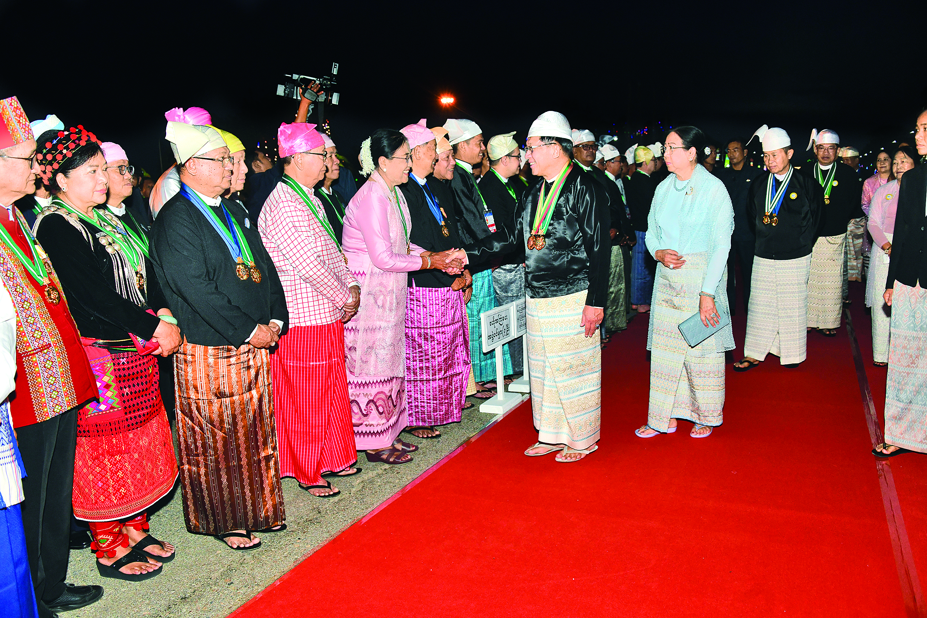 ထို့နောက် နိုင်ငံတော်ယာယီသမ္မတ နိုင်ငံတော်လုံခြုံရေးနှင့်အေးချမ်းသာယာရေး ကော်မရှင် ဥက္ကဋ္ဌနှင့်ဇနီး၊ ကော်မရှင်ဒုတိယဥက္ကဋ္ဌနှင့်ဇနီးတို့သည် ဂုဏ်ပြုညစာစားပွဲသို့ တက်ရောက်လာကြသည့် တိုင်းဒေသကြီးနှင့် ပြည်နယ်များမှ တိုင်းရင်းသားရိုးရာ ယဉ်ကျေးမှုအဖွဲ့များ၊ နိုင်ငံရေးပါတီများမှ ဥက္ကဋ္ဌများနှင့် ကိုယ်စားလှယ်များ၊ NCA စာချုပ်လက်မှတ်ရေးထိုးထားသည့် တိုင်းရင်း သားလက်နက်ကိုင် အဖွဲ့အစည်းများမှ ခေါင်းဆောင်များနှင့် ကိုယ်စားလှယ်များ၊ တိုင်းဒေသကြီးနှင့် ပြည်နယ်များမှ MSME လုပ်ငန်းရှင်များ၊ တိုင်းဒေသကြီးနှင့်ပြည်နယ် များမှ စီးပွားရေးရာဝန်ကြီးများနှင့် တိုင်းရင်းသားလူမျိုးရေးရာဝန်ကြီးများ၊ ကာကွယ်ရေးဦးစီးချုပ်ရုံးမှ အဆင့်မြင့် တပ်မတော်အရာရှိ ကြီးများနှင့်ဇနီးများ၊ ပြည်ထောင်စုဝန်ကြီးများ၊ ပြည်ထောင်စု အဆင့်ပုဂ္ဂိုလ်များနှင့်ဇနီးများ၊ ကော်မရှင်အဖွဲ့ဝင်များနှင့်ဇနီးများအား ရင်းရင်းနှီးနှီး လိုက်လံနှုတ်ဆက်ကြသည်။