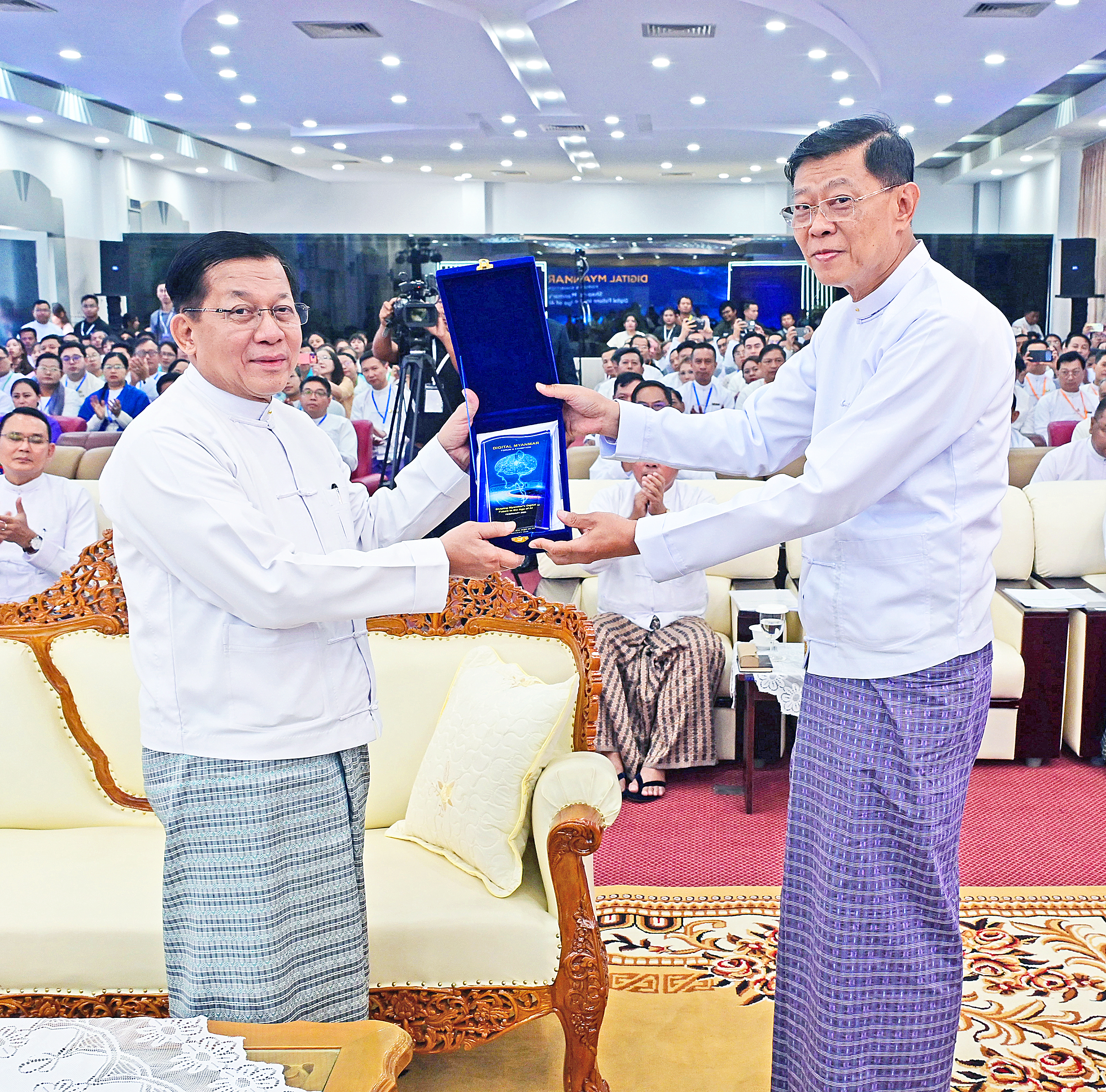 ၎င်းနောက် နိုင်ငံတော်ယာယီသမ္မတ နိုင်ငံတော်လုံခြုံရေးနှင့် အေးချမ်းသာယာ ရေးကော် မရှင်ဥက္ကဋ္ဌ ဗိုလ်ချုပ်မှူးကြီးမင်းအောင်လှိုင်ထံ ပို့ဆောင်ရေးနှင့်ဆက်သွယ်ရေး ဝန်ကြီး ဌာန ပြည်ထောင်စုဝန်ကြီး ဦးမြထွန်းဦးက ဒစ်ဂျစ်တယ်မြန်မာ နည်းပညာ နှီးနှောဖ လှယ်ပွဲနှင့် ပြပွဲအခမ်းအနားအထိမ်းအမှတ်လက်ဆောင်အား ဂါရဝပြုပေးအပ်သည်။