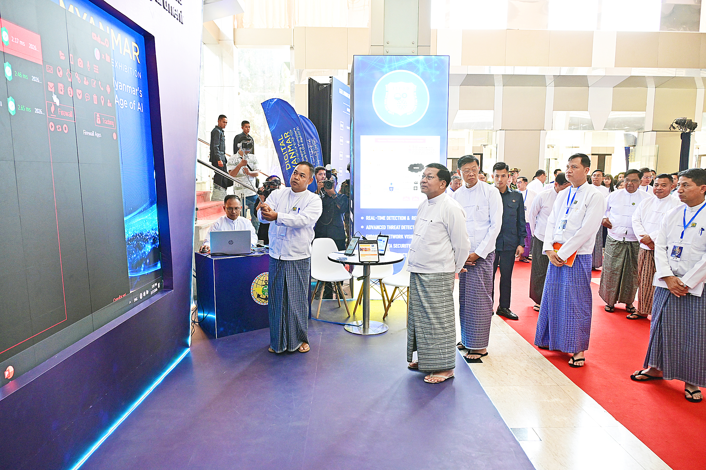 ထို့နောက် နိုင်ငံတော်ယာယီသမ္မတ နိုင်ငံတော်လုံခြုံရေးနှင့် အေးချမ်းသာယာ ရေးကော် မရှင်ဥက္ကဋ္ဌနှင့် အဖွဲ့ဝင်များသည် ဒစ်ဂျစ်တယ်မြန်မာနည်းပညာနှီးနှော ဖလှယ်ပွဲနှင့် ပြပွဲ အခမ်းအနားတွင် ပြသထားရှိသည့် ပြခန်းတစ်ခုချင်းစီအလိုက် စိတ် ပါဝင်စားစွာဖြင့် လှည့်လည်ကြည့်ရှုကြပြီး တာဝန်ရှိသူများ၏ တင်ပြချက်များအပေါ် လိုအပ်သည်များ နိုင်ငံတော်ယာယီသမ္မတနိုင်ငံတော်လုံခြုံရေးနှင့်အေးချမ်းသာယာရေးကော်မရှင်ဥက္ကဋ္ဌကသိရှိလိုသည်များမေးမြန်းပြီး လိုအပ်သည်များ လမ်းညွှန်မှာ ကြားသည်။