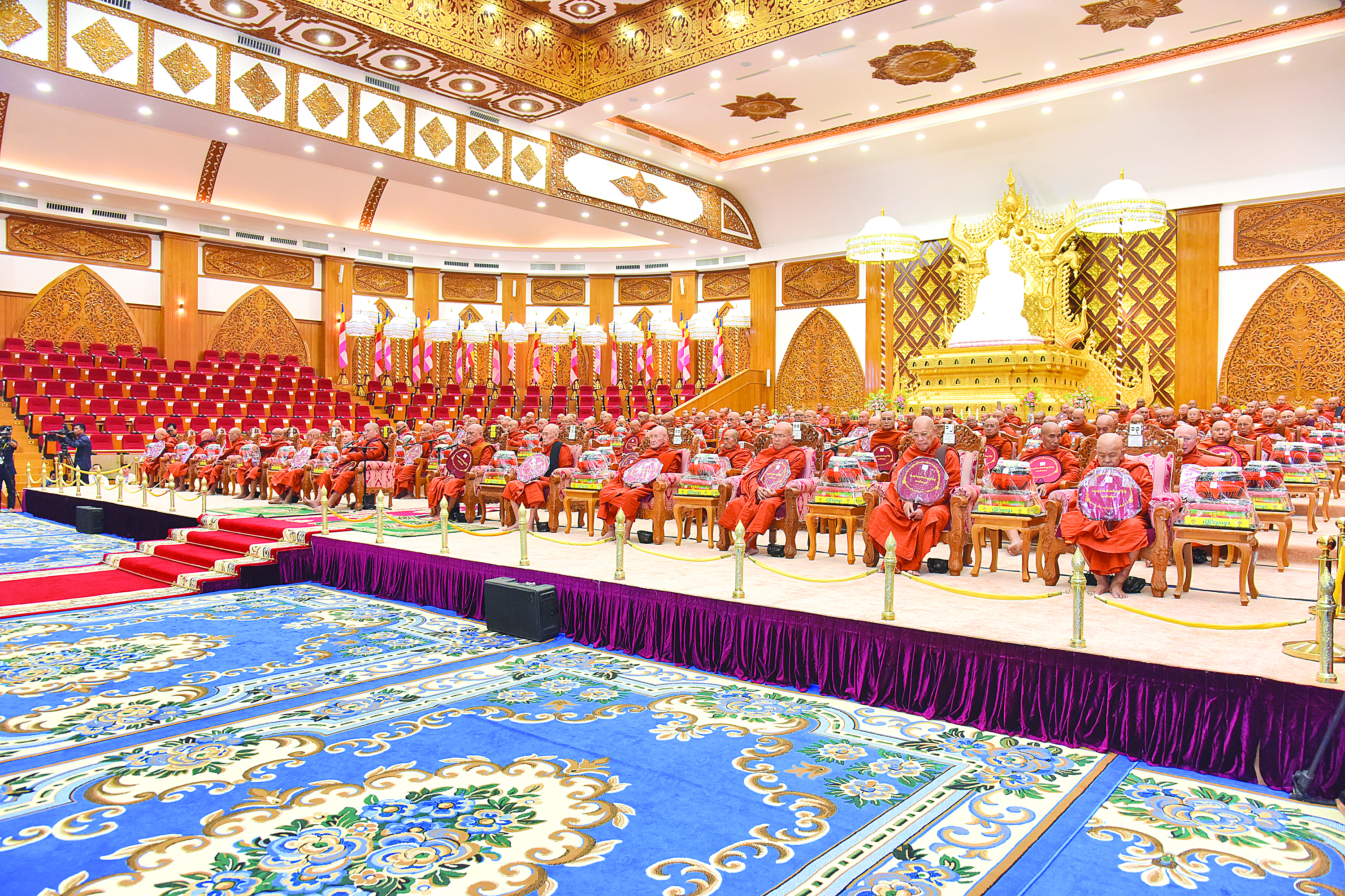 အခမ်းအနားသို့ အထူးပင့်ဖိတ်ထားသည့် နိုင်ငံတော်သံဃမဟာနာယကအဖွဲ့ဥက္ကဋ္ဌ အဘိဓဇမဟာရဋ္ဌဂုရု အဂ္ဂမဟာသဒ္ဓမ္မဇောတိကဓဇ သန်လျင်မင်းကျောင်းဆရာတော် ဒေါက်တာဘဒ္ဒန္တစန္ဒိမာဘိဝံသနှင့် နိုင်ငံတော်သံဃမဟာနာယကအဖွဲ့အကျိုးတော်ဆောင်၊ မန္တလေးမြို့၊မစိုးရိမ်တိုက်သစ်မဟာနာယက၊ ဓမ္မသမိဒ္ဓိကျောင်းဆရာတော် အဂ္ဂမဟာပဏ္ဍိတ အဂ္ဂမဟာသဒ္ဓမ္မဇောတိကဓဇ မဟာဓမ္မကထိက ဗဟုဇနဟိတဓရ ဘဒ္ဒန္တ ဝါသေဋ္ဌာဘိဝံသတို့အမှူးပြုသည့် ပြည်တွင်း၊ ပြည်ပဘွဲ့ခံ ဆရာတော်ကြီး ၁၄၆ ပါးနှင့် ဘွဲ့ခံသီလရှင်ဆရာကြီး ၁ ပါး ကြွရောက်ချီးမြှင့်တော်မူကြ ပြီး နိုင်ငံတော်ယာယီသမ္မတနိုင်ငံတော်လုံခြုံရေးနှင့် အေးချမ်းသာယာရေးကော်မရှင် ဥက္ကဋ္ဌနှင့် ဇနီးတို့နှင့်အတူ ကော်မရှင်ဒုတိယဥက္ကဋ္ဌ ဒုတိယဗိုလ်ချုပ်မှူးကြီး စိုးဝင်း၊ ကော်မရှင်အဖွဲ့ဝင် နိုင်ငံတော်ဝန်ကြီးချုပ်ဦးညိုစောနှင့်ဇနီး၊ ကော်မရှင်အဖွဲ့ဝင် အမှုဆောင်ချုပ် ဦးအောင်လင်းဒွေးနှင့်ဇနီး၊ ကော်မရှင်အတွင်း ရေးမှူးဗိုလ်ချုပ်ကြီးရဲဝင်းဦးနှင့်ဇနီး၊ ကော်မရှင်အဖွဲ့ဝင်များနှင့်ဇနီးများ၊ ပြည်ထောင်စုအဆင့်ပုဂ္ဂိုလ်များ၊ ပြည်ထောင်စုဝန်ကြီးများနှင့် ဇနီးများ၊ နေပြည်တော်ကောင်စီဥက္ကဋ္ဌ၊ ကာကွယ်ရေးဦးစီးချုပ်ရုံးမှ အဆင့်မြင့်တပ်မတော်အရာရှိကြီးများနှင့် ဇနီးများ၊ နေပြည်တော်တိုင်းစစ်ဌာနချုပ် တိုင်းမှူးနှင့် တာဝန်ရှိသူများ တက်ရောက်ကြည်ညိုကြသည်။