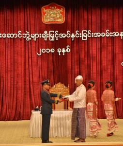 တပ်မတော်ကာကွယ်ရေးဦးစီးချုပ် ဗိုလ်ချုပ်မှူးကြီး မဟာသရေစည်သူ မင်းအောင်လှိုင်သည် ယနေ့နံနက်ပိုင်းတွင် နေပြည်တော်ရှိ နိုင်ငံတော်သမ္မတ အိမ်တော်၌ နိုင်ငံတော်သမ္မတကပေးအပ်သည့် ၂၀၁၈ ခုနှစ် ဂုဏ်ထူးဆောင်ဘွဲ့များ ချီးမြှင့်အပ်နှင်းခြင်းအခမ်းအနားသို့ တက်ရောက်ခဲ့သည်။