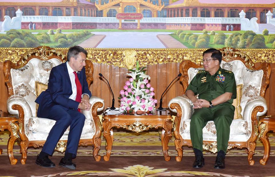 တပ်မတော်ကာကွယ်ရေးဦးစီးချုပ် ဗိုလ်ချုပ်မှူးကြီး မင်းအောင်လှိုင် ဂျီနီဗာမြို့ အခြေစိုက် International Committee of the Red Cross (ICRC) အဖွဲ့ဥက္ကဋ္ဌ Mr. Peter Maurerဦးဆောင်သည့် ကိုယ်စားလှယ်အဖွဲ့ အားလက်ခံတွေ့ဆုံ