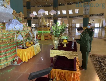 တပ္မေတာ္ကာကြယ္ေရးဦးစီးခ်ဳပ္ ဗုိလ္ခ်ဳပ္မွဴးႀကီး မင္းေအာင္လႈိင္ သည္ ျပည္ေထာင္စုၿငိမ္းခ်မ္းေရးညီလာခံ (၂၁)ရာစုပင္လုံ(တတိယအစည္းအေ၀း)သုိ႔ တက္ေရာက္လာသည့္ တုိင္းရင္းသားလက္နက္ကုိင္အဖြဲ႔အစည္း မ်ားျဖစ္ၾကေသာ UWSA ‘ ၀ ’ အဖြဲ႕ ၊ NDAA(မုိ္င္းလား)အဖြဲ႕၊ SSA (၀မ္ဟုိင္း)အဖြဲ႕ ႏွင့္ KIA အဖြဲ႕မ်ားမွ ကုိယ္ စားလွယ္မ်ားႏွင့္ ယေန႔မြန္းလြဲပုိင္းတြင္ ေနျပည္ေတာ္ရွိ ဘုရင့္ေနာင္ရိပ္သာ ဧည့္ခန္းမေဆာင္၌ လက္ခံေတြ႕ဆံု သည္။