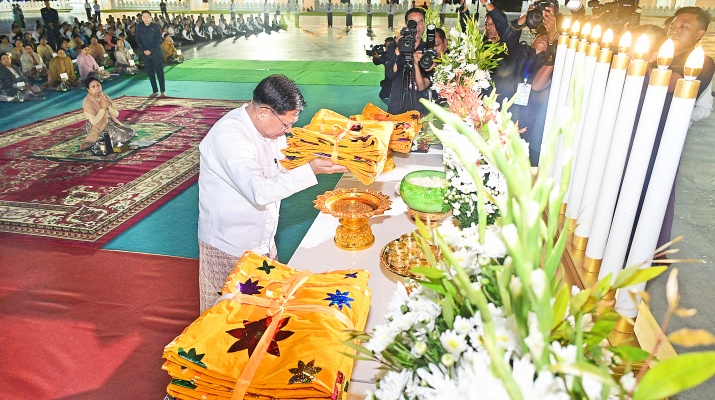 နေပြည်တော် နိုဝင်ဘာ ၄ မာရဝိဇယဗုဒ္ဓရုပ်ပွားတော်မြတ်ကြီးအား ၂၀၂၅ ခုနှစ်၊ တန်ဆောင်တိုင်ပွဲတော် မသိုး ရွှေကြာသင်္ကန်း ဆက်ကပ်လှူဒါန်းခြင်း မဟာမင်္ဂလာအခမ်းအနားကို ယနေ့နံနက် မင်္ဂလာအချိန်တွင် ကျင်းပပြုလုပ်ရာ ပြည်ထောင်စုသမ္မတမြန်မာနိုင်ငံတော် ယာယီသမ္မတ နိုင်ငံတော်လုံခြုံရေးနှင့် အေးချမ်းသာယာရေးကော်မရှင်ဥက္ကဋ္ဌ ဗိုလ်ချုပ်မှူးကြီးမင်းအောင်လှိုင် တက်ရောက်၍ မသိုးရွှေကြာသင်္ကန်းဆက်ကပ်လှူဒါန်းသည်။ အဆိုပါ မဟာမင်္ဂလာအခမ်းအနားသို့ နိုင်ငံတော်ယာယီသမ္မတနိုင်ငံတော်လုံခြုံရေးနှင့် အေးချမ်းသာယာရေးကော်မရှင်ဥက္ကဋ္ဌနှင့်အတူဇနီး ဒေါ်ကြူကြူလှ၊ ကော်မရှင်ဒုတိယဥက္ကဋ္ဌ