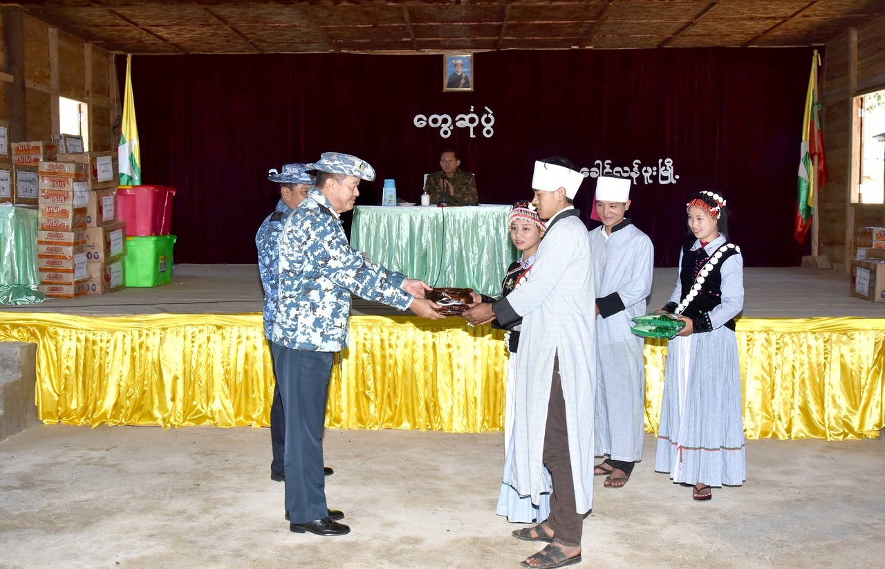 For the local ethnics, the Senior General presented packets of Biryani and fried noodles,Union Minister Lt-Gen Ye Aung, Commander-in-Chief (Navy) Admiral Tin Aung San,Commander-in-Chief (Air) General Maung Maung Kyaw and senior military officers from the Office of the Commander-in-Chief(Army) presented foodstuffs such as eggs and instant noodle, MEC Tel handsets and SIM cards to departmental officials and local people. The Senior General, wife and party cordially greeted the local people and posed for a documentary photo together with them.