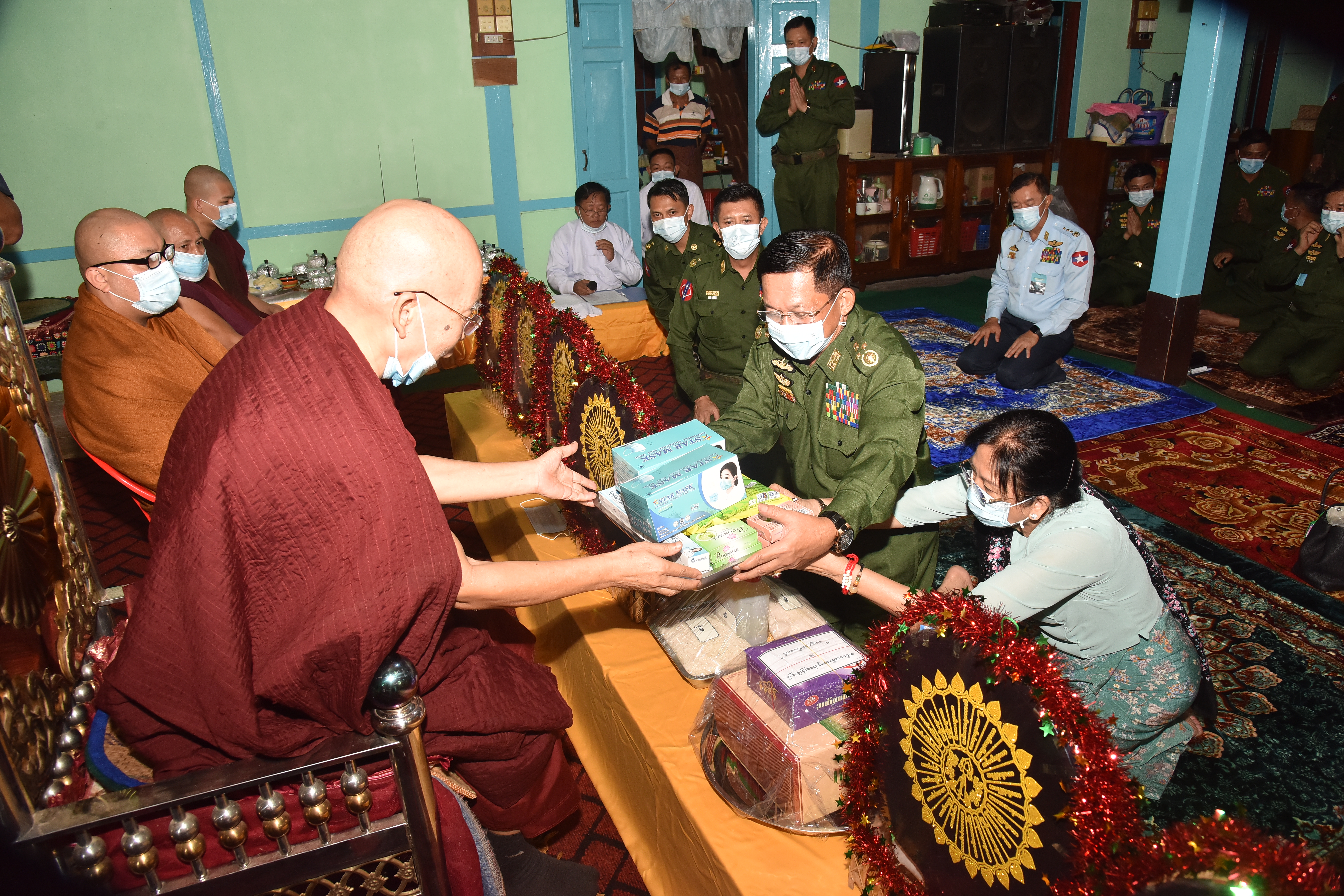 Then, the Senior General and party proceeded to Magyigon Monastery in Wuntho and paid homage to Presiding Abbot Ganthavacaka Panita Bhaddanta Kovida before offering 30 bags of rice, 45 viss of edible oil, 15 viss of salt, 101 viss of gram, personal goods produced by factories of the Tatmadaw and cash for nine prerequisites donated by families of the Tatmadaw (Army, Navy and Air) and asking after the health of the Sayadaw.