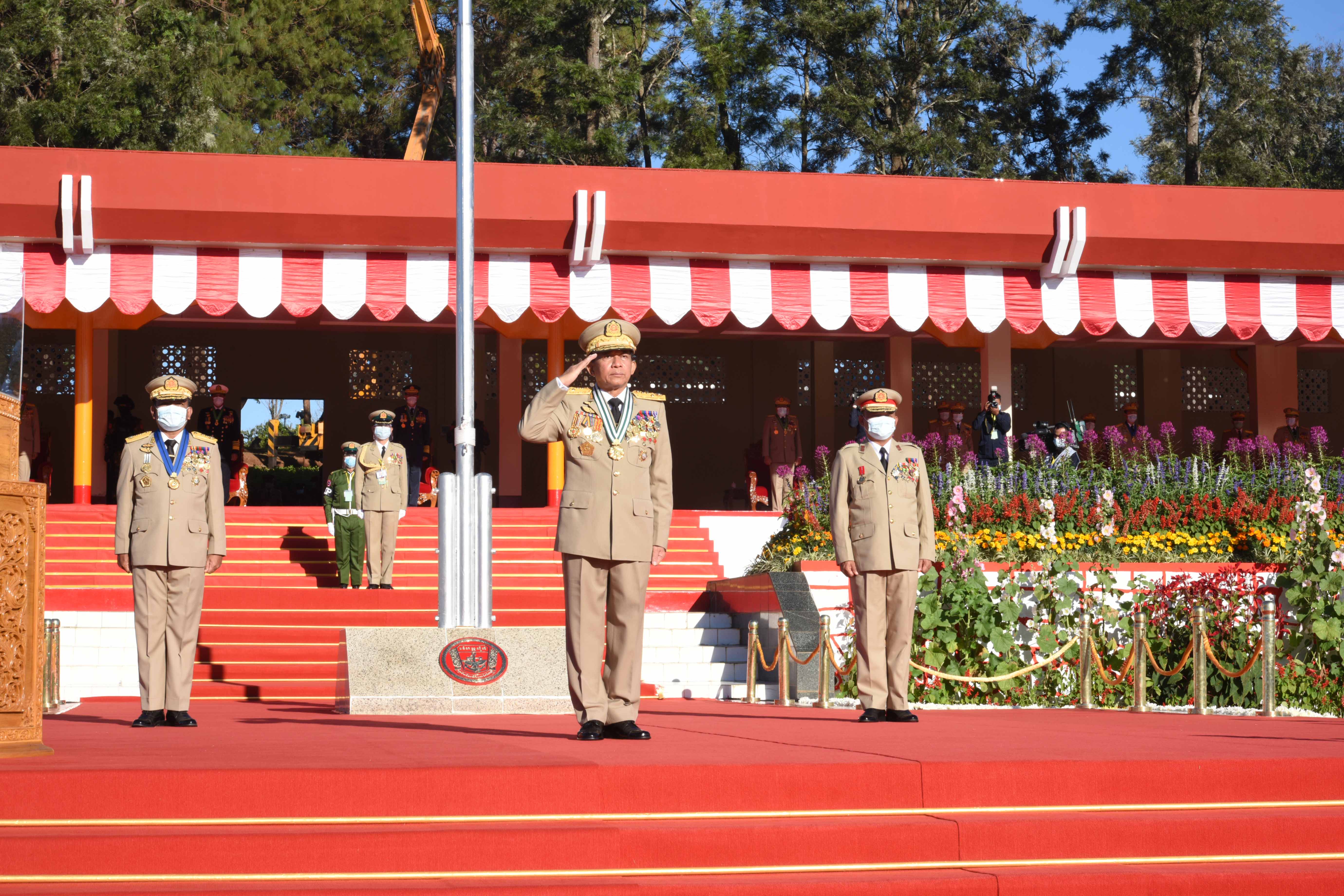 Also present at the ceremony together with the Senior General were Commander-in-Chief (Navy) Admiral Zeya Kyawhtin Tin Aung San, Commander-in-Chief (Air) General Zeya Kyawhtin Maung Maung Kyaw, senior military officers from the Office of Commander-in-Chief (Army), the commandant of the Defence Services Academy and senior military officers from PyinOoLwin Station.