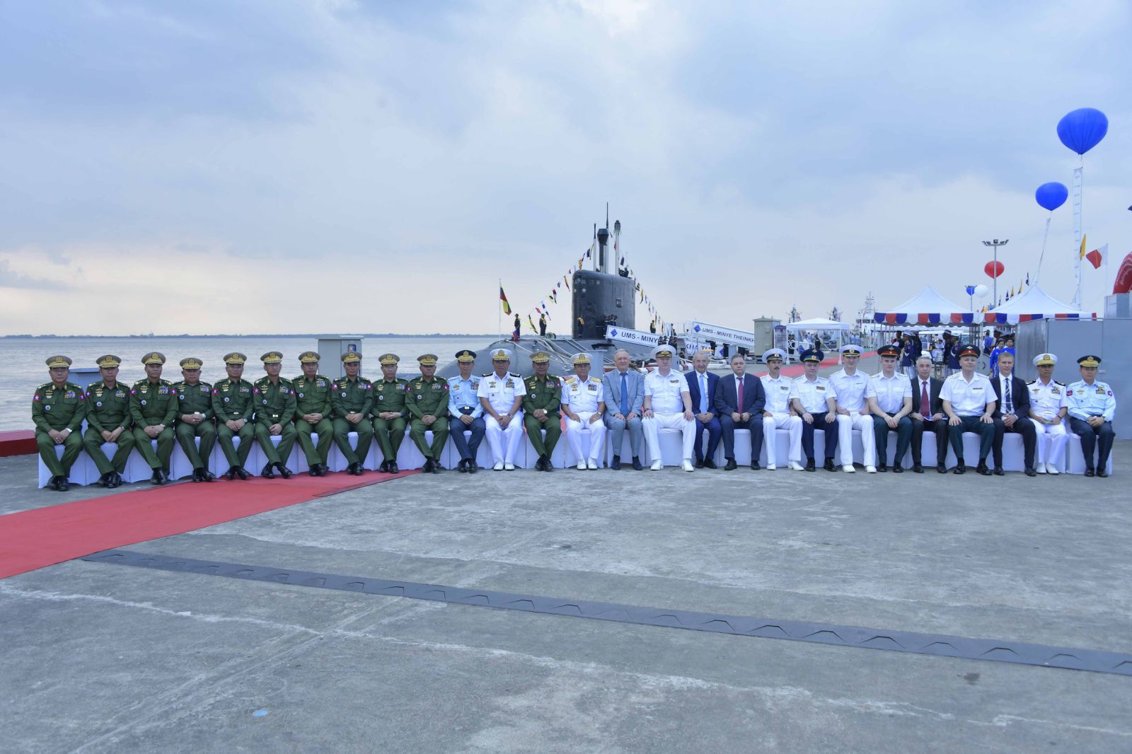 Also present were Daw Kyu Kyu Hla, wife of the Senior General, retired commanders-in- chief (Navy) and their wives, retired commanders-in-chief (Air) and their wives, Chief of the General Staff (Army, Navy and Air) General Maung Maung Aye and wife, Commander-in-Chief (Navy) Admiral Moe Aung and wife, Commander-in-Chief (Air) General Tun Aung and wife, Union level officials and their wives, Union ministers and their wives, Ambassador of Russian Federation to Myanmar H.E.Mr. Nikolay LISTOPADOV, Deputy Commander-in-Chief of Russ-ian Navy Vice Admiral IGOR MUKHAMETSHIN and party, senior military officers from the Office of the Commander-in-Chief and their wives, the Yangon Region chief minister, the Yangon Command commander, naval base commanders, officers, other ranks and families of Tatmadaw (Navy) and guests.
